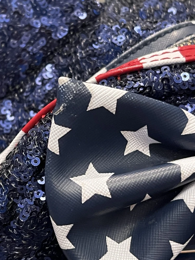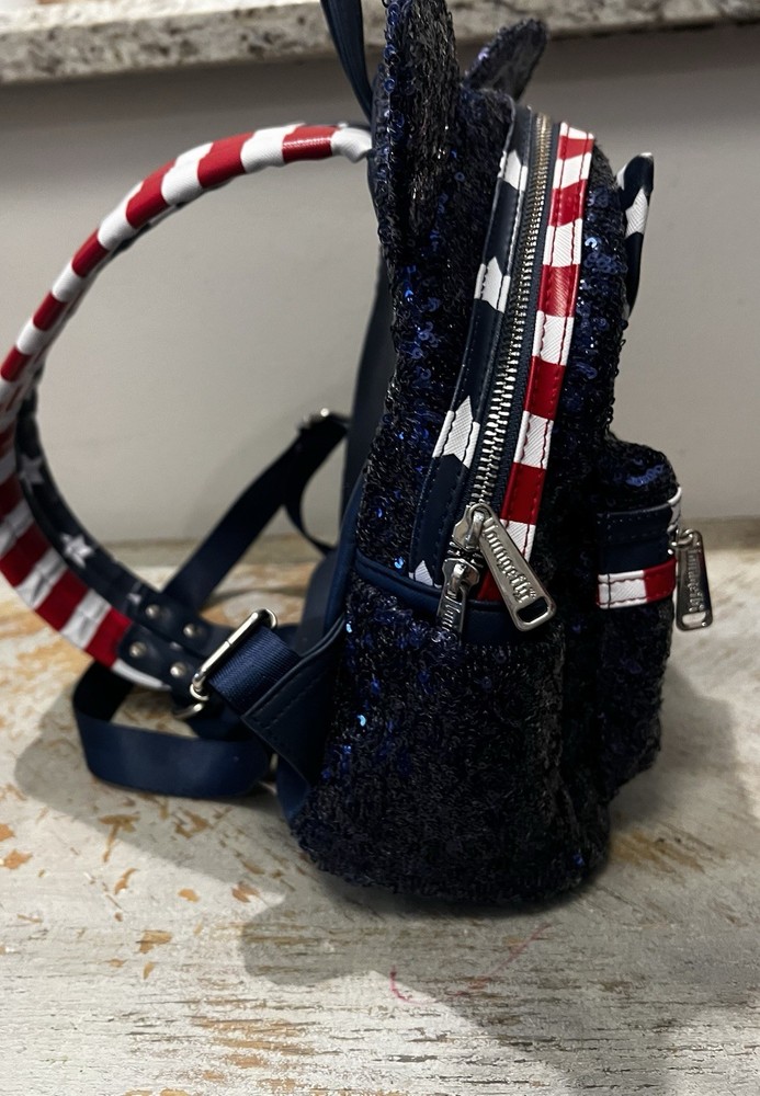 The Loungefly Disney Parks Minnie Mouse Sequined Stars and Stripes Mini Backpack is a stylish and collectible accessory featuring the beloved Disney character Minnie Mouse. With a patriotic theme of stars and stripes, this mini backpack in a blue color is perfect for fans of Disney and the brand Loungefly. Released in 2020, this backpack combines nostalgia with contemporary design, making it a must-have for any Disneyana collector or enthusiast.