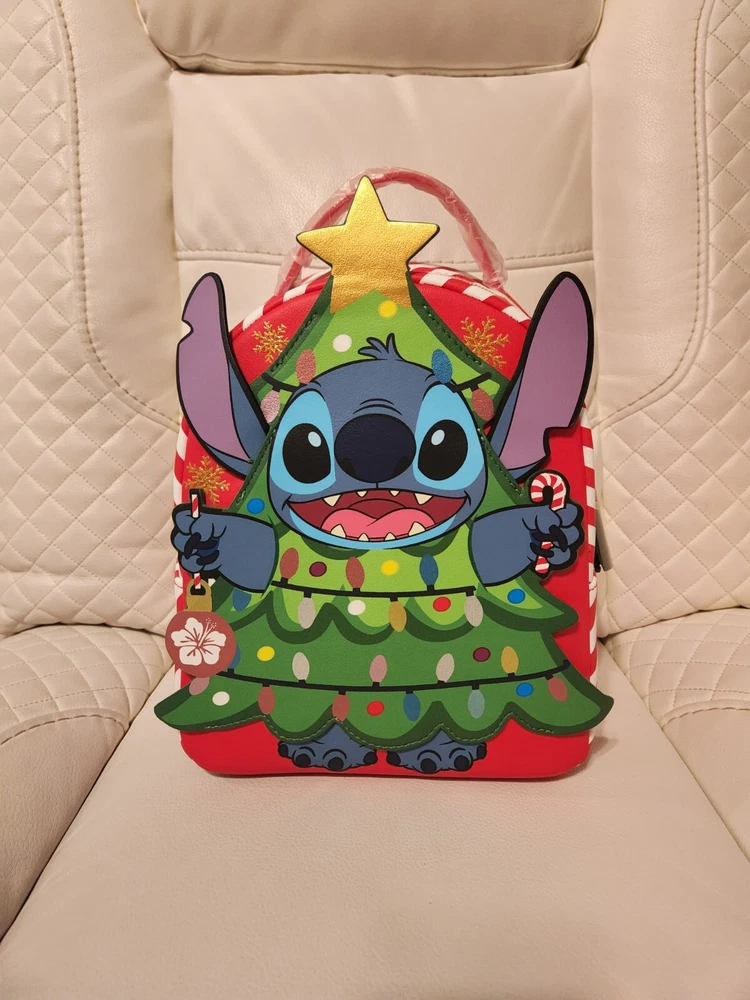 Show off your festive spirit with this Stitch figural mini backpack. It has an appliqued Stitch dressed as a Christmas tree holding a hibiscus ornament and candy cane. The sides have candy cane striping. Adjustable straps and interior pocket. 9" x 4" x 10 1/2" Polyurethane