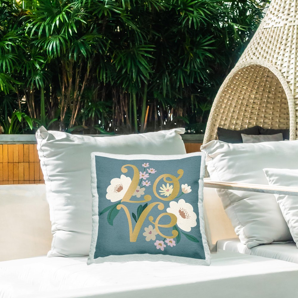 Dimensions: 18 x 18 Inches, Including Filling Insert Decorative outdoor pillows are a great and easy way to decorate your outdoor living space, adding both a decorative accent and comfort. Pillows arrive with insert already zipped inside and ready to fluff. Casing and filling insert are both made of quick-dry soft polyester material. The printing process makes the ink part of the fabric for greater outdoor durability. To wash remove filling insert from casing using invisible zipper. Clean pillow case separately, machine wash on delicate with cold water and mild detergent. For best quality hang dry. Pillow insert is spot clean only. Artwork Relates To: Floral, Flower, Blossom, Love, Romance, Love Design by Heather McLaughlin