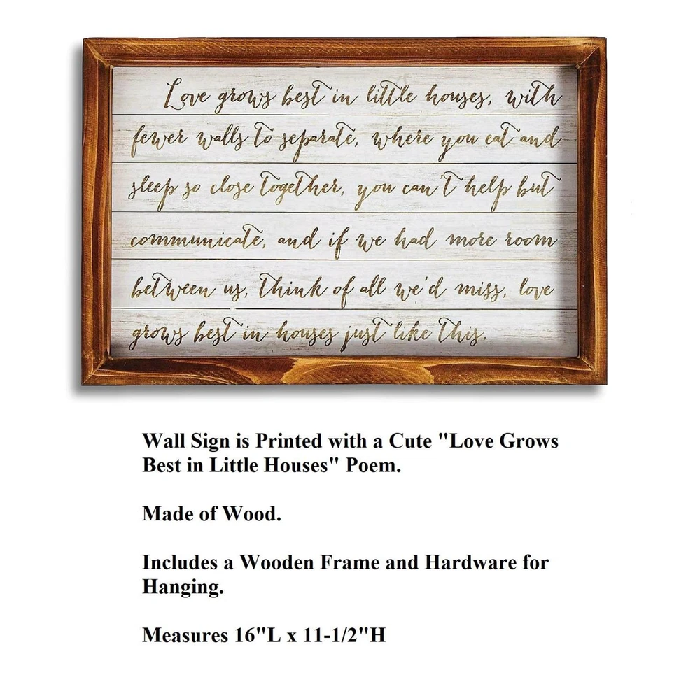 Love Grows Best in Little Houses Poem Framed Wooden Wall Decor 16"Lx11.5"H #676 Love Grows Best in Little Houses Poem Framed Wooden Wall Decor 16"Lx11.5"H #676 Click images to enlarge Description Love Grows Best in Little Houses Poem Framed Wooden Wall Decor 16"Lx11.5"H. Featuring a sentimental poem and a simple design of gold stylized text, this sign is a wonderful addition to your small home decor. Add it to a gallery wall, hang above a mantel or display prominently in the entryway. Made of Wood. Measures 16"L x 11-1/2"H. Includes frame. Heady to hang. Sign reads: Love grows best in little houses, with fewer walls to separate, where you eat and sleep so close together, you can't help but communicate, and if we had more room between us, think of all we'd miss., love grows best in houses just like this. ~Buy more than one item at the same time from our eBay store and save in shipping costs!~ (If buying different items, just put them all in your cart before paying, to get the combined shipping discount!) Shipping We use UPS SurePost, UPS, USPS and FedEx SmartPost to deliver our products to your home, depending on which method is more efficient for your order. We use suppliers for some of our orders and our suppliers will choose the service that is used for these orders. PLEASE MAKE SURE YOUR ADDRESS CAN BE VERIFIED BY USPS. Please allow 7-10 days for the item to reach your home. We cannot be responsible for items shipped to incorrect or incomplete addresses, which may result in the cancellation of your order. YES, we do combine shipping! The highest shipping cost item ships at regular price, and each additional item ships at $2.00 more in additional shipping charges. If you are buying several different items from our store, put them all into your cart before paying to get the combined shipping discount. Terms of Sale Unless otherwise noted, we accept returns up to 30 Days after your purchase, through the eBay Returns System. Please use eBay to contact us if there is any problems or issues with your order. In some cases, we order the item purchased from one of our suppliers, and it is shipped directly from our supplier to the customer. There are times when an item unexpectedly becomes unavailable from our supplier. We do our best to check on all of the items availability several timea a day. If an item is unexpectedly unavailable, we will issue a refund immediately. Contact Us Please use the message center in eBay to contact us. We check our message box in eBay several times a day. If you have any questions or concerns with your order, please feel free to contact us. We care very much about our customers being 100% happy with their purchases. We would very much appreciate you letting us resolve any issues you may have with your order by contacting us first, before taking any other unnecessary actions. Get images that make Supersized seem small. Showcase your items with Auctiva's Listing Templates! THE simple solution for eBay sellers.