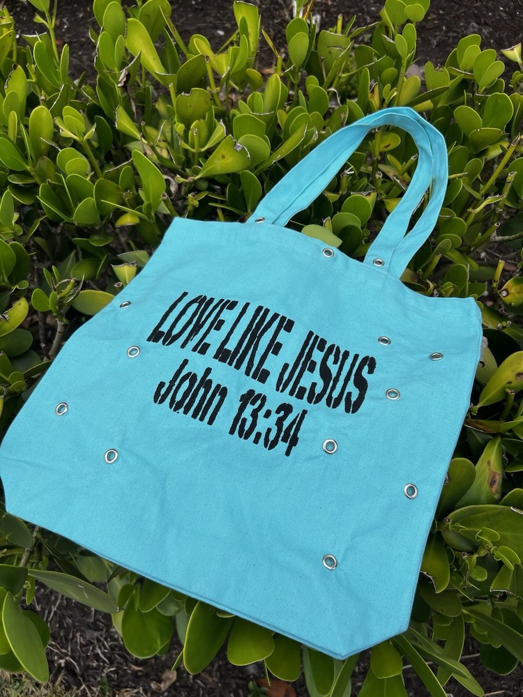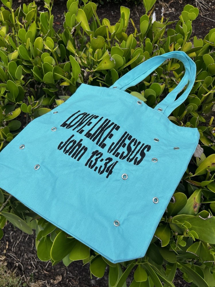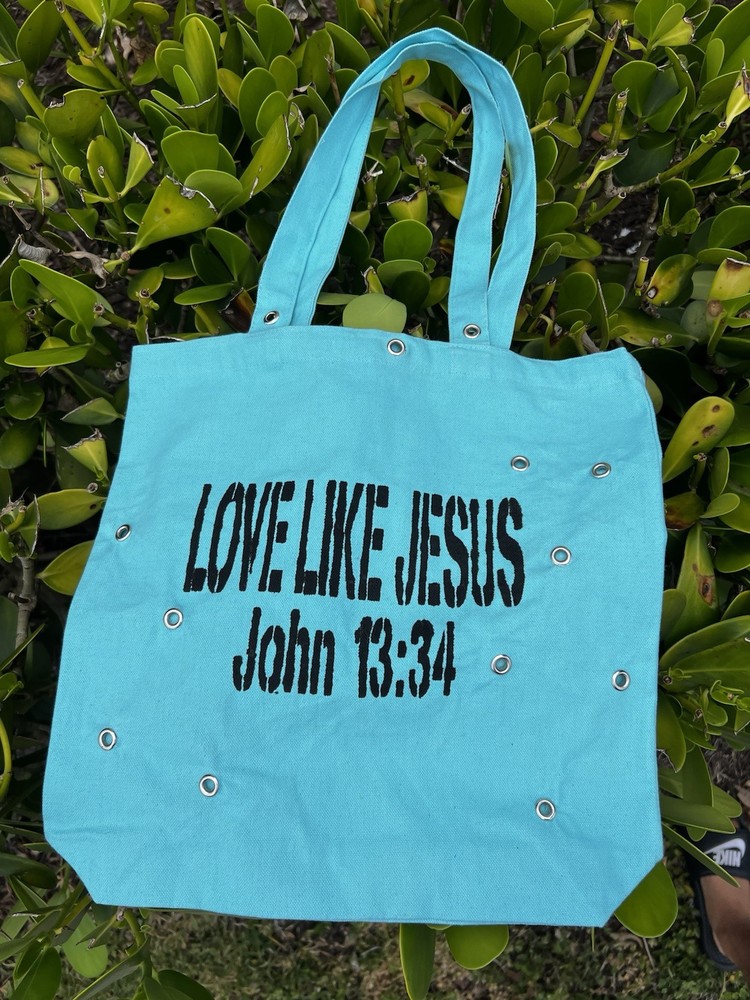 The "Love Like Jesus" Custom Hand-painted Tote Bag is a handmade, personalized accessory perfect for women. This rectangle-shaped tote features a beautiful aqua exterior made of canvas, with a polyester lining. It has double handles, a matte finish, and is lightweight, making it ideal for everyday use. Hand-painted with a theme of love, this tote is a unique and stylish addition to any outfit. Made in the United States, this tote exudes a sense of faith and positivity.