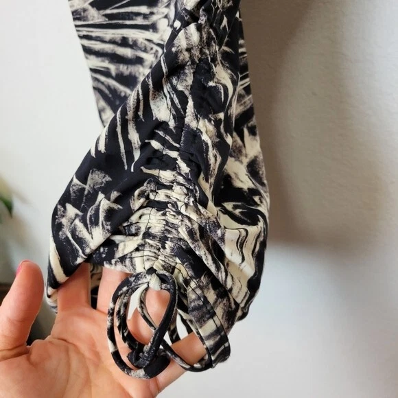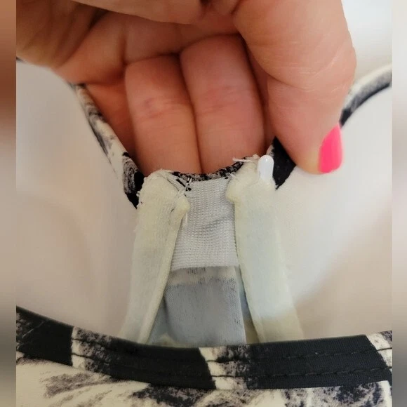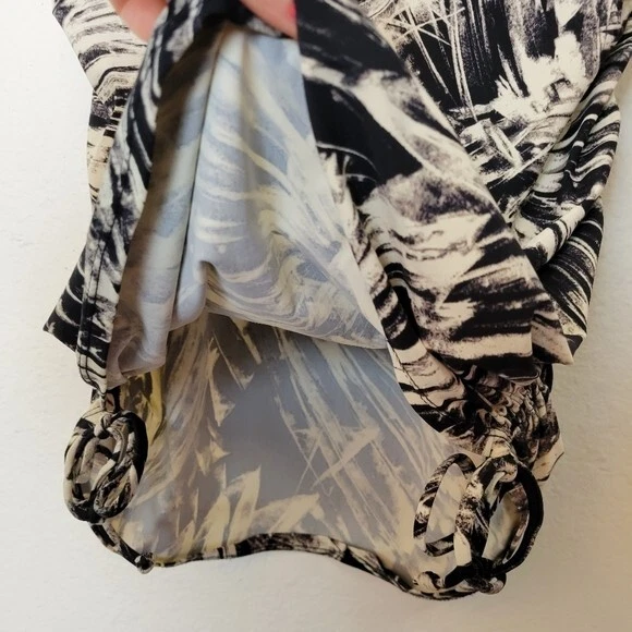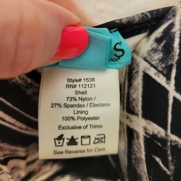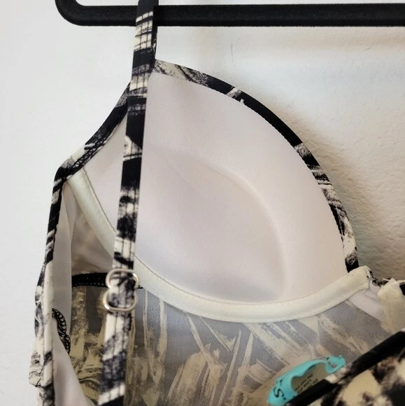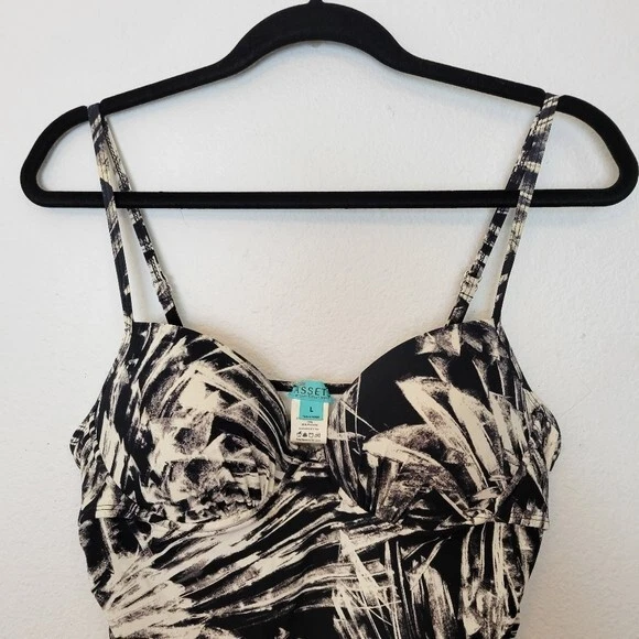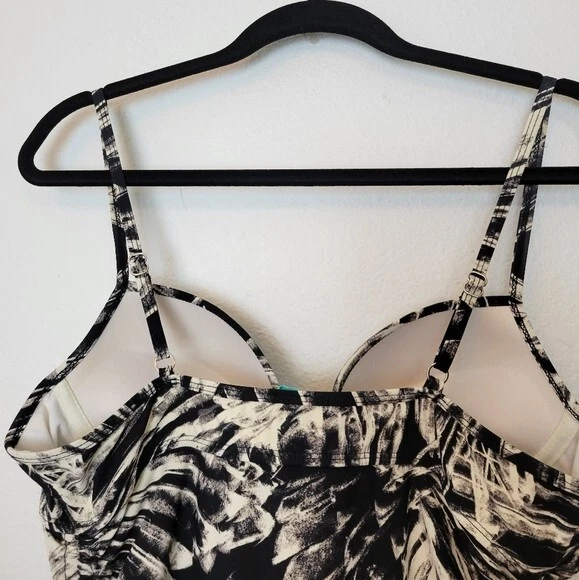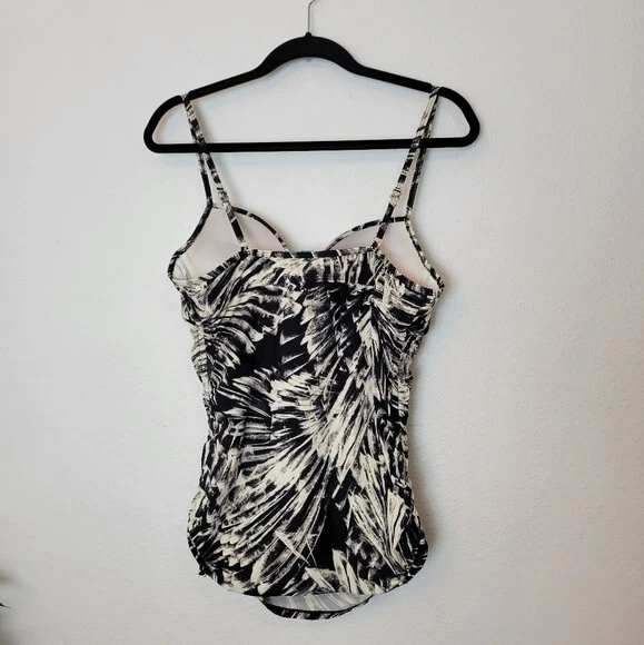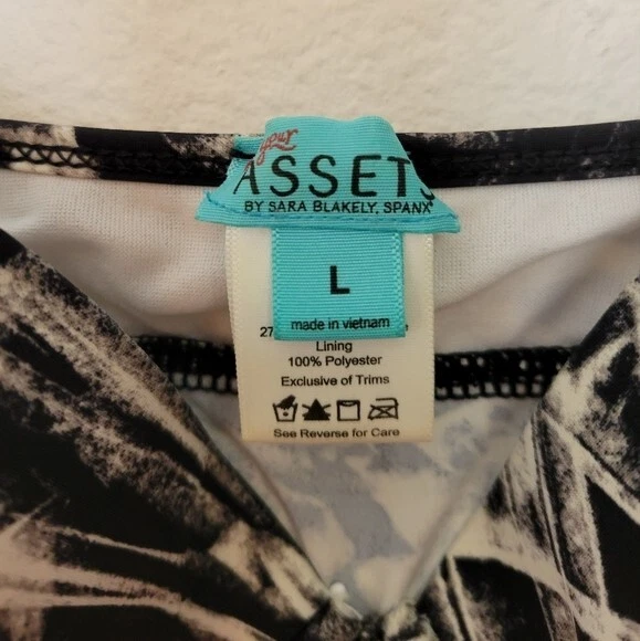 Love Your Assets Spanx Size Large Black & White Tankini Swim Top Ruched Padded. Ships With USPS First Class Mail -Tankini swim top by Love Your Assets for Spanx in a black and white tropical print -Size Large -Style 1538 -Get a boost and a slim fit in the same top Ruching along the sides and adjustable ruched ties of this tankini top give you a customized, flattering fit -Underwire cups have heavy graduated padding along the bottoms of cups -Elastic straps are adjustable -73% nylon 27% spandex -Measurements are approximately 16 in armpit to armpit 29 in long 20 in center of chest to hem -Part of the underwire is slightly poking out of the right cup as shown. Otherwise great pre-owned condition! ---------------------------------------------------- Thanks for looking…have a GREAT DAY! @mandajane223