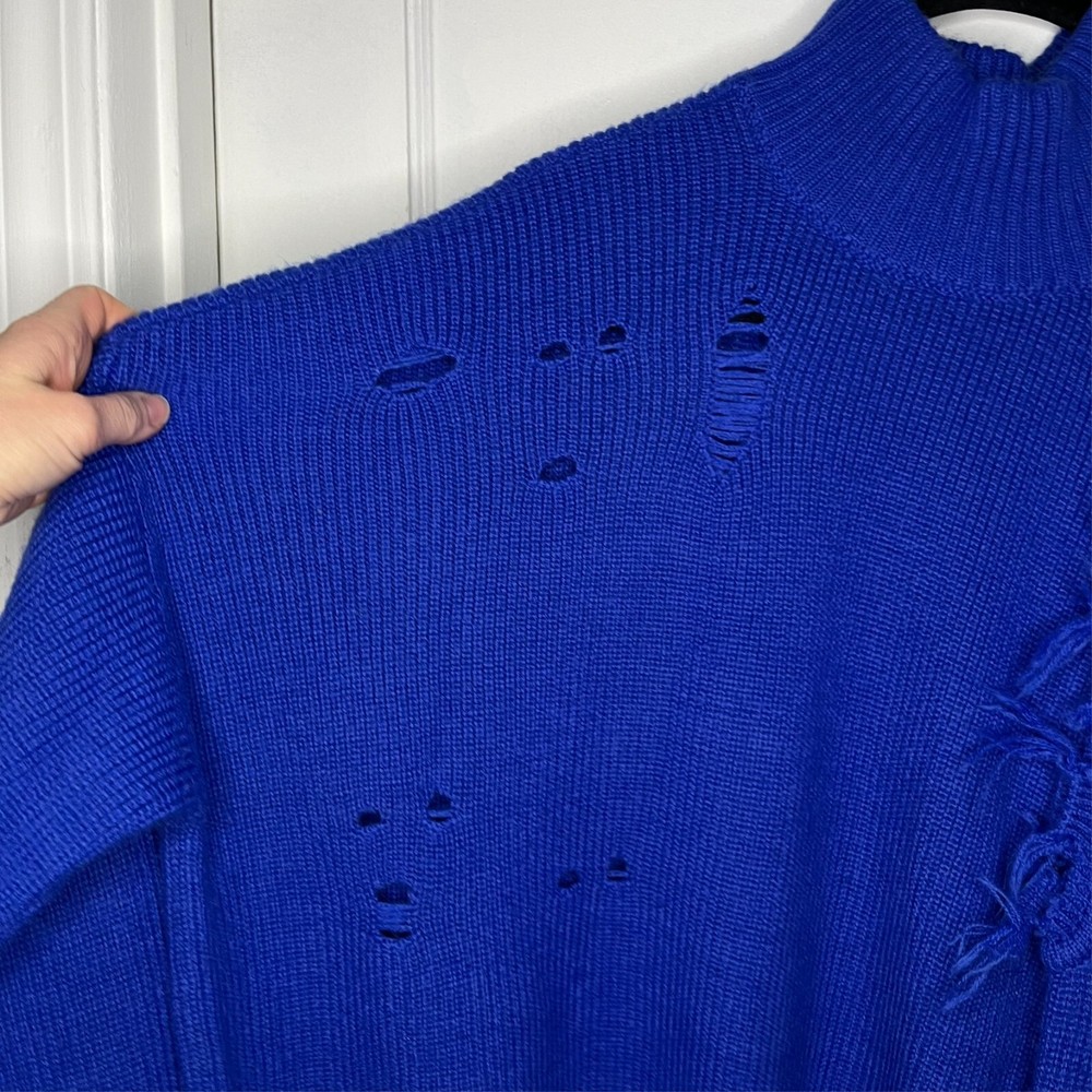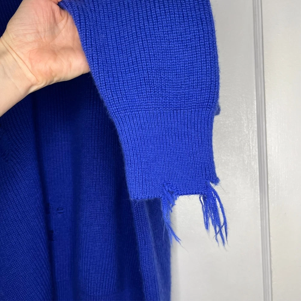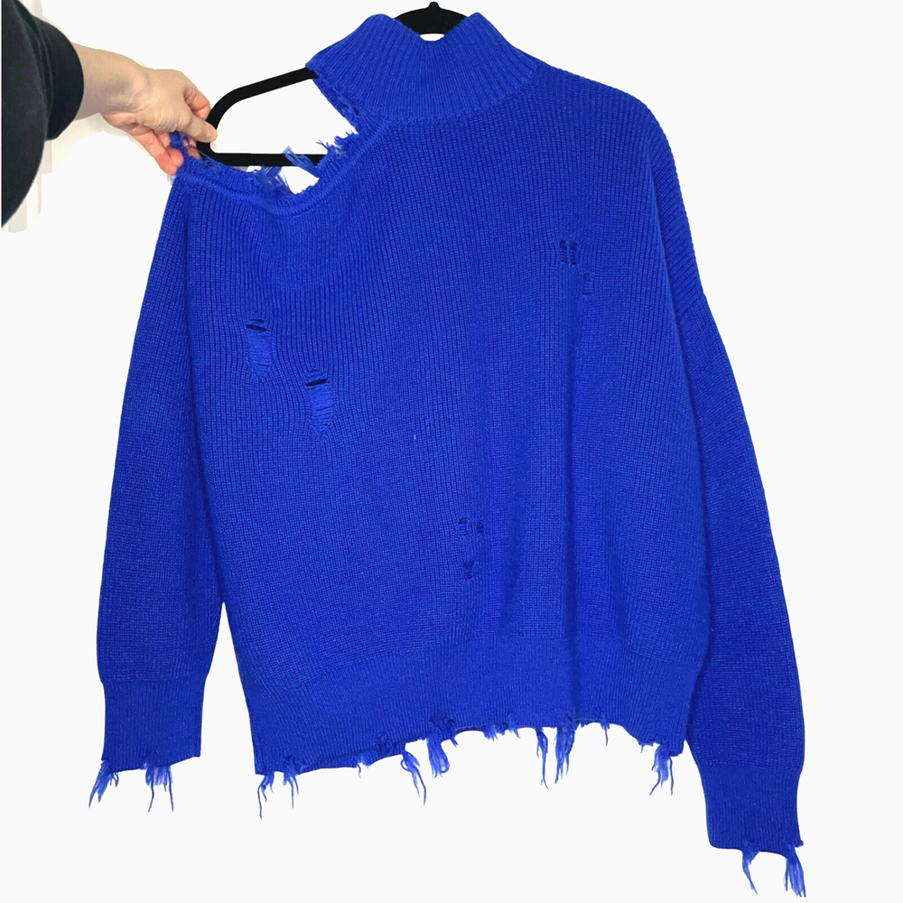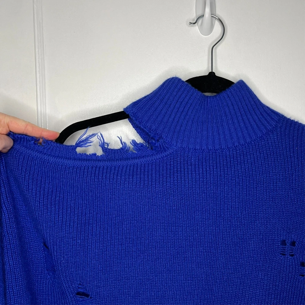 This is the Lovers & Friends Arlington sweater in a size medium and cobalt blue color. It is a wool and acrylic rib knit material, features distressing throughout, an open shoulder on the left side and a mock turtleneck neckline. Excellent Used Condition - No stains, holes, tears or other notable issues. There is a white thread that is woven into the knit on the back - not sure this is an issue, but wanted to point it out. Approximate Measurements: Length: 24" Chest: 52" Shoulders: 25.5" Sleeve length: 21" Sleeve Opening: 7.5" Bottom Hem: 42" Turtleneck height: 3.5" If you have any questions, or would like any additional measurements, please ask!