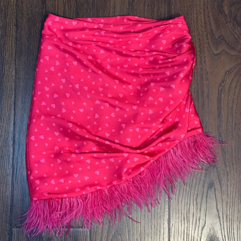 Lovers + Friends Maisey Pink Heart Asymmetrical Feather Hem Mini Skirt Originally $188 on Revolve Women's Size Small Ruched siding with zipper Waist flat - 13.5" Length - 18" measured in middle including feathers Excellent like new condition