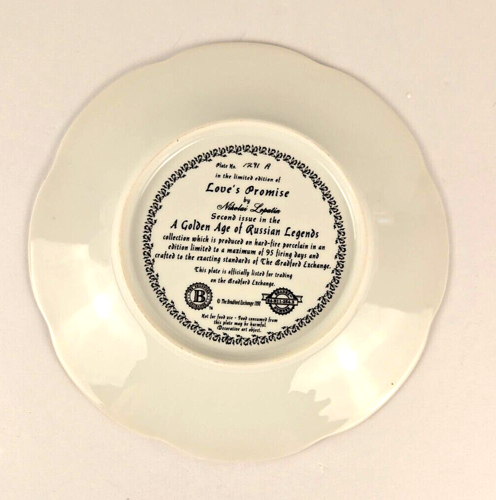 Love's Promise Russian Collectors Plate Bradford Exchange 1998 Ltd Edition This is a beautiful vintage collector plate from the late 20th century (1998) by Bradford Exchange. The round porcelain plate features a multicolor design with gold edging, depicting a theme of love and enchanting beauty from Russian culture. It is part of the "Golden Age of Russian Legends" product line and is a limited edition item. The plate measures 8 inches in diameter and weighs 7 ounces. This remarkable art piece will be a delight to any home decor. Be sure to check out my website for the other pictures in this collection. We carefully pack each item to prevent breakage. We only charge what the shipper charges and cannot control the shipping costs. We do not accept returns/refunds unless item is not as described per eBay policy or the item arrives damaged or broken beyond anything noted in the condition field or pictures. If you have any questions about any of our listed items, feel free to email us.