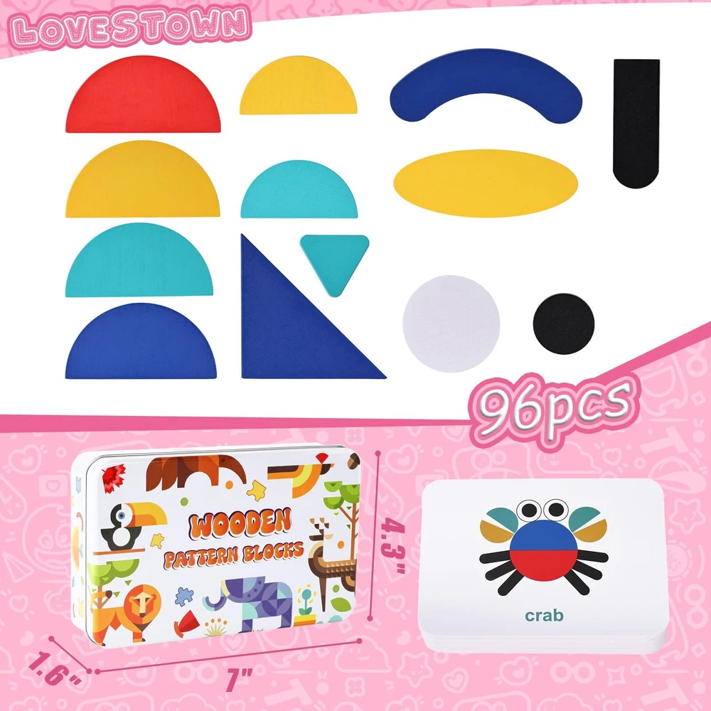 LovesTown 36 Wooden Pattern Blocks with 60 Cards, Open Ended Wooden Shape Puzzles Montessori Preschool Education Toy Tangram Shape Puzzle for Toddler Kids Super Value Set - Our pattern block set includes 36 wooden pieces and 60 pattern cards. Children can either replicate designs shown on the cards or unleash their creativity to craft their own unique designs. Superior Quality - Crafted from safe materials, our wooden blocks feature a smooth surface, vibrant colors, and robust durability. The blocks are both safe and odor-free for a secure and enjoyable play experience. Enhance Children's Skills - Pattern puzzles are designed to ignite children's interest, nurture creativity, and promote the development of fine motor skills. Through these puzzles, children learn to sort wooden pieces by shape and color, as well as create patterns. Promotes Quiet Engagement for Kids - Looking to provide your child a respite from screen-based games or TV? Introduce them to this toy, ensuring hours of joy and entertainment. Meanwhile, you can enjoy the tranquility to focus on whatever tasks you need to accomplish. Ideal Gift Option - This wooden pattern puzzle is sure to delight kids. Crafted with care and non-toxic materials, it's a gift that parents can appreciate as well. Ideal for toddlers and preschoolers aged 3 years and older. Super Value Set - Our pattern block set includes 36 wooden pieces and 60 pattern cards. Children can either replicate designs shown on the cards or unleash their creativity to craft their own unique designs. Superior Quality - Crafted from safe materials, our wooden blocks feature a smooth surface, vibrant colors, and robust durability. The blocks are both safe and odor-free for a secure and enjoyable play experience. Enhance Children's Skills - Pattern puzzles are designed to ignite children's interest, nurture creativity, and promote the development of fine motor skills. Through these puzzles, children learn to sort wooden pieces by shape and color, as well as create patterns. Promotes Quiet Engagement for Kids - Looking to provide your child a respite from screen-based games or TV? Introduce them to this toy, ensuring hours of joy and entertainment. Meanwhile, you can enjoy the tranquility to focus on whatever tasks you need to accomplish. Ideal Gift Option - This wooden pattern puzzle is sure to delight kids. Crafted with care and non-toxic materials, it's a gift that parents can appreciate as well. Ideal for toddlers and preschoolers aged 3 years and older. Shipping from the USA All of our products are shipped from the USA, ensuring quick delivery to your destination. Payment We offer the following payment methods: PayPal, credit card, bank transfer, and eBay's secure payment system. Free Shipping & Free Returns Shipping within the USA is FREE. Additionally, any return is absolutely free for you. Risk-Free Purchase You have the option to return an item within 30 days without any justification. We cover the return shipping costs! Fast Shipping We ship immediately upon receipt of payment. Generally, the package is delivered within 2-3 days in the USA. If it takes longer, we will contact you. Quality and Costs Made in Europe, USA, China No customs fees or additional charges Total satisfaction guarantee Invoice with declared VAT available upon request in .pdf format Feedback Your feedback is very important to us. After you pay for your purchase, you will automatically receive positive feedback from us.