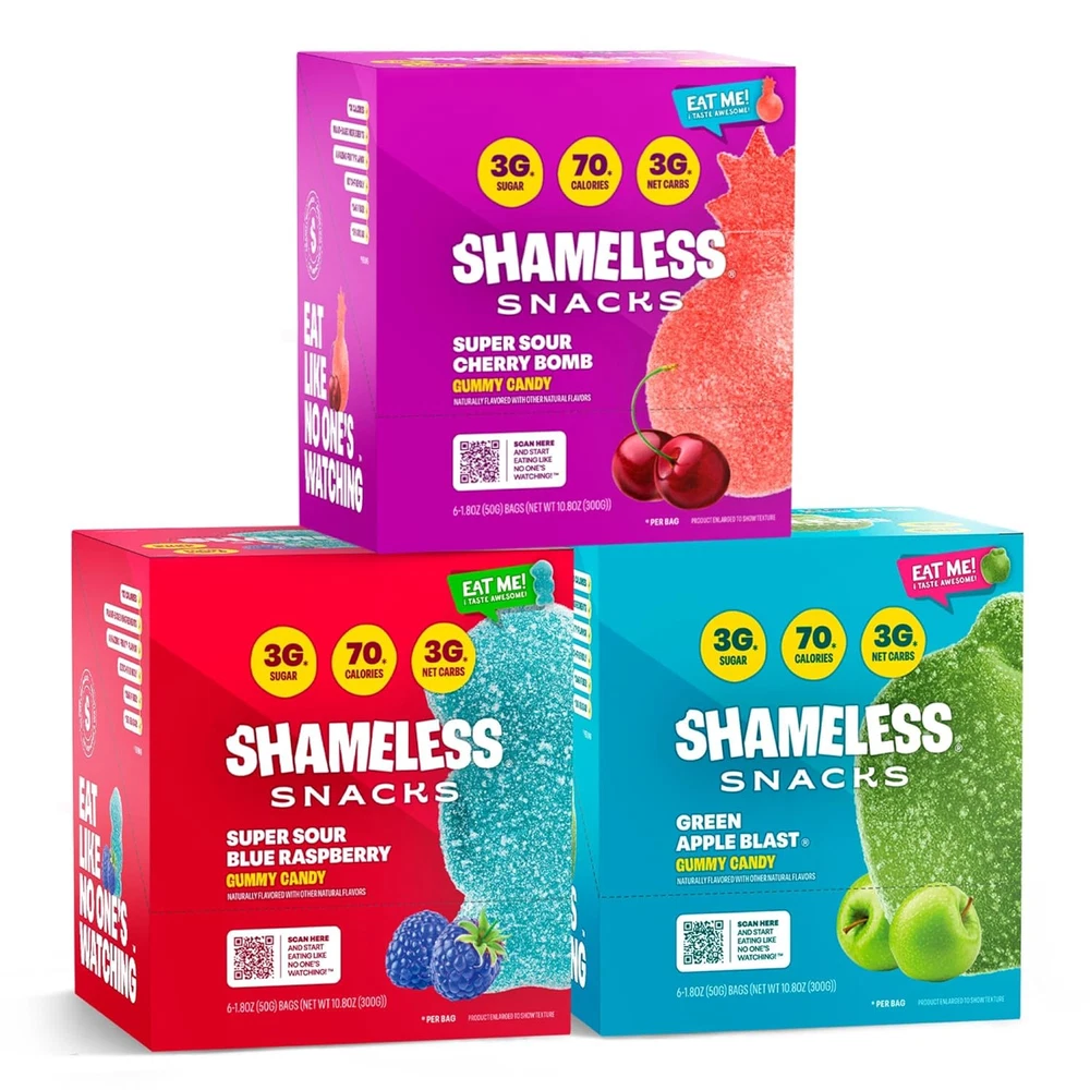 LIP SMACKIN' FLAVOR: Carefully crafted and tested fruit candy to taste just as good as classic candy — but without all the carbs, sugar, or calories. Super Variety Pack candies comes in different childhood favorite flavors — Watermelon, peach, cherry, green apple, red raspberry, and blue raspberry! 70 CALORIES PER BAG: Compare that to an equal serving of candy-aisle gummies, which have a whopping 166 calories on average! Keto gummies, keto candy, healthy candy by Shameless. 3G SUGAR: At 3g of sugar per bag, Shameless Snacks sour candies have up to 92% less sugar than regular candy, with the same great taste! True exotic candy gummies. KETO-FRIENDLY: With 3g of Net Carbs per bag, these gummy snacks are a great way to satisfy your cravings without the high-carb count. 6 pack candy bulk package. VEGAN: Shameless Snacks healthy candies are proudly made without any animal products! Shameless sour gummies are great vegan gummies and smart sweets for smart people. Product Description Satisfy your sweet tooth without worrying about calories & sugar If you love sweets but you’re watching your weight, Shameless Snacks gives you the perfect alternative to sugar-loaded store-aisle candy. Each bag has 70 calories, 3g net carbs, 3g sugar, and loads of appetite-suppressing dietary fiber, giving you the most effective — and delicious — way to cut down on calories and curb cravings while still enjoying the tasty treats you love and deserve. 1 3G SUGAR 2 3G CARBS 3 KETO-FRIENDLY 4 26G FIBER 5 VEGAN + GLUTEN-FREE Shameless Snacks Add to Cart Add to Cart Add to Cart Add to Cart Add to Cart Customer Reviews 4.2 out of 5 stars 4,969 4.2 out of 5 stars 4,969 4.2 out of 5 stars 4,969 4.2 out of 5 stars 4,969 4.2 out of 5 stars 4,969 Price $19.00 $ 19 . 00 $23.79 $ 23 . 79 $19.00 $ 19 . 00 $19.00 $ 19 . 00 $18.35 $ 18 . 35 Calories per bag 70 70 70 70 70 Sugar per bag 3G 3g 3g 3g 3g Net carbs per bag 3g 3g 3g 3g 3g Fiber per bag 26g 26g 26g 26g 26g Bag Size 1.8 oz 1.8 oz 1.8 oz 1.8 oz 1.8 oz Real Fruit Flavors ✔ ✔ ✔ ✔ ✔ No Artificial Colors ✔ ✔ ✔ ✔ ✔ Keto-Friendly ✔ ✔ ✔ ✔ ✔ Vegan ✔ ✔ ✔ ✔ ✔ Gluten-Free ✔ ✔ ✔ ✔ ✔