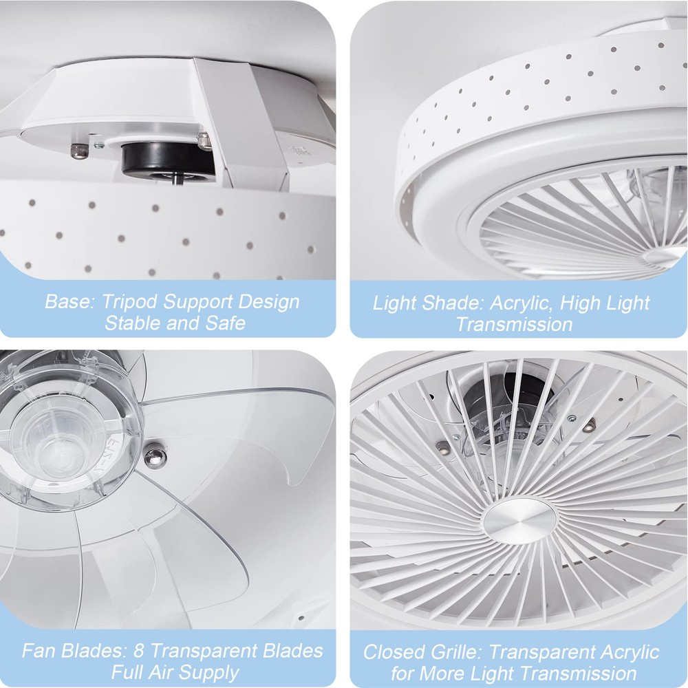① Iron Lampshade: Modern ceiling fans with lights are made in metal, with high-grade and durable appearance, which enhances your home decoration style. 19×7 inch ultra-thin design indoor ceiling fan with led light is suitable for low ceiling living room, bedroom, kitchen, attic, dining room, outdoor patio. ②Intelligent Ceiling Fan: Remote control ceiling fans can control the timing mode, and the timing time can be set to 1h or 2h. The light is able to be changed by remote control and the color temperature remains the same status as it was turned off, making it more convenient for you to use. ③ Strong Wind Speed: Bladeless ceiling fan can be adjusted to 3 speeds for good airflow. Hidden 8-blade design, quiet, creating a quiet and comfortable sleeping environment for you. The ceiling fan with light fixture makes it easy for you and your family to enjoy the coolness of the natural wind. The deflector can be removed for easy cleaning. ④High-Quality LED Lamp Beads: The low profile ceiling fan features high-qualiyt LED lamp beads, the light is soft and flicker-free, and the longevity is up to 50,000 hours. 3 color temperatures (3500K-4500K-6500K) can be controlled by the remote control, and the brightness can also be adjusted (10%-100%) to meet various needs of home lighting. ⑤ Safe & Easy to Clean: Enclosed ceiling fan with lights uses a hidden fan blade design, and the dense grille prevents foreign objects from touching the fan blades, ensuring the safety of the ceiling fan. At the same time, the wind deflector can also be easily disassembled. Very convenient, suitable for installation in the kitchen, etc. ⑥ Easy Installation: Ceiling fan with lights flush mount installation design, easy installation (installation instructions and installation accessories are included in the package). brand ceiling fans come with a one-year warranty. If you have any questions, you can contact us anytime, we will reply you within 24 hours. Here you can get the service you want.