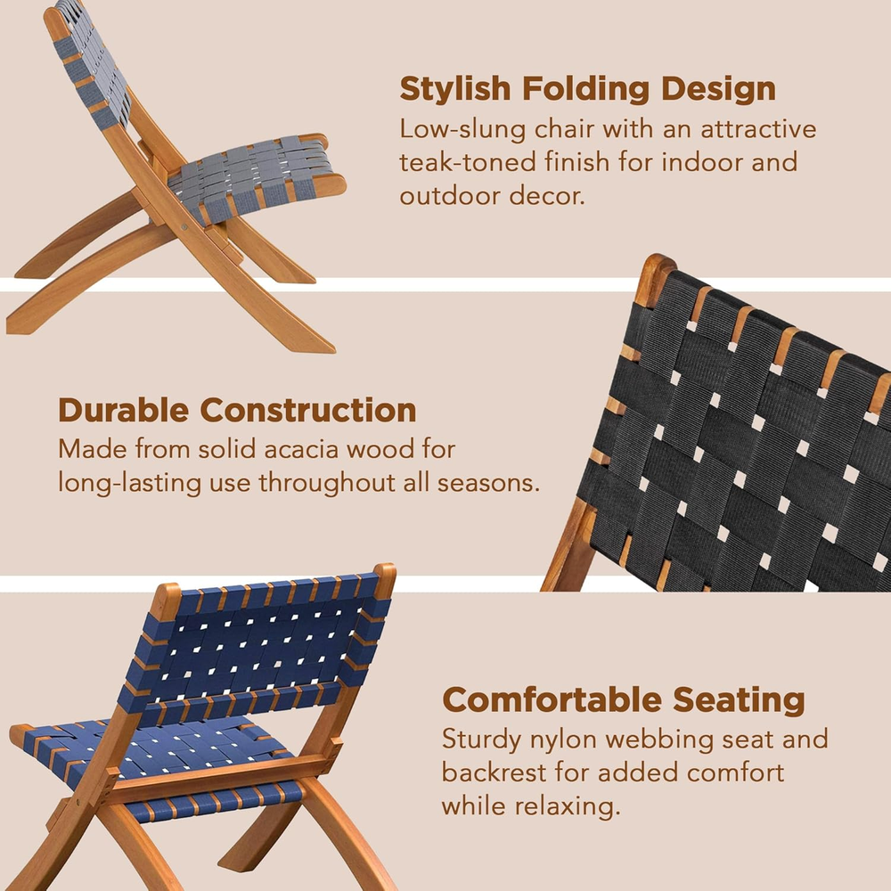PATIO SENSE 63636: The Sava Folding Chair is low-slung, portable seating with a solid acacia wood frame and woven webbing seat and back. SAVA INDOOR OUTDOOR FOLDING CHAIR IN NAVY BLUE WEBBING: The attractive teak-toned finish is the perfect accent for any patio or indoor living area, and also conveniently folds for storage or transport. SOLID ACACIA WOOD CONSTRUCTION: The comfortable design is perfect for relaxing poolside or creating casual seating arrangements. The Sava Chair can be used all season long with basic care and maintenance & may be easily stored away in the off-season thanks to its folding design. FEATURES: Sturdy nylon webbing seat and backrest | Solid acacia wood construction | Beautiful teak toned oiled finish | Chair can be used indoors or out | Low maintenance; just wipe down with soft cloth | No assembly - just unfold | Light weight for transportability. ASSEMBLED DIMENSIONS: 31" D x 24"W x 28"H, Weight: 11 lbs Product Description