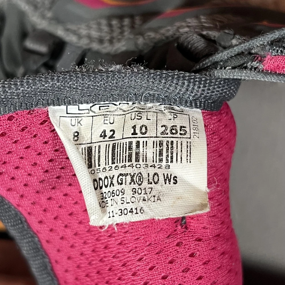 Brand: Lowa Model: Innox GTX Lo Ws waterproof low-cut hiking and trail shoes with quicklace system. Color: Dark gray with pink and orange accents, gray midsole and gum rubber outsole. Size: Womens US 10, UK 8, EU 42, 265 mm (per size tag). Upper appears to be synthetic and mesh with GORE-TEX breathable waterproof lining and padded collar. Details: Speed-lace bungee closure with cord lock, cushioned DynaPU midsole, durable lugged outsole for traction, branded tongue, side and heel logos. Made in Slovakia; style code: 320609 9017. EAN: 4056264403428