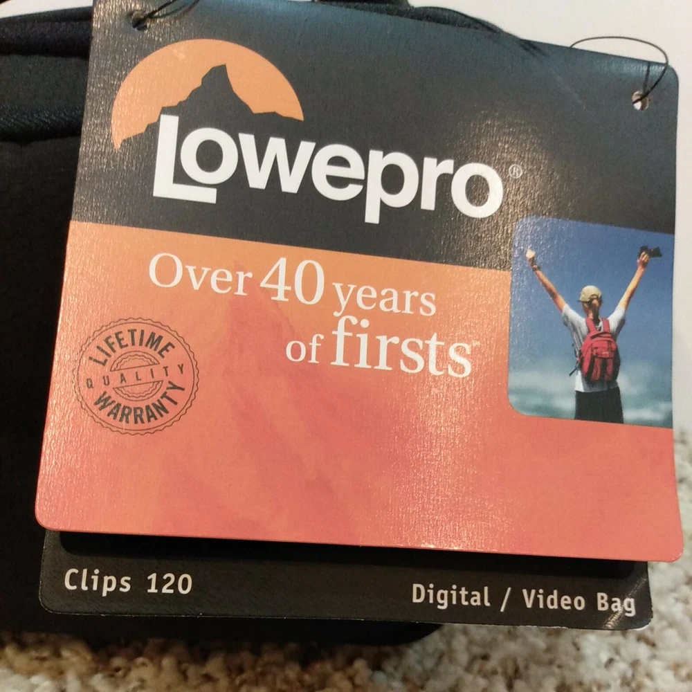 Lowepro Clips 120 Shoulder Bag for Digital Camcorder Black 9"x6"x6". New with tags. Fast, free shipping! * Hinged design provides quick, easy access * Soft, brushed tricot lining protects against dust & scratches * Adjustable divider creates a customized fit. * Media pocket holds 3.5 in DVD-RDL Disks or a mini DV tape. * Easily accessible side pockets hold tapes batteries or personal items * Adjustable shoulder strap and padded handle provide carrying options * Tough water resistant outer fabric protects against moisture