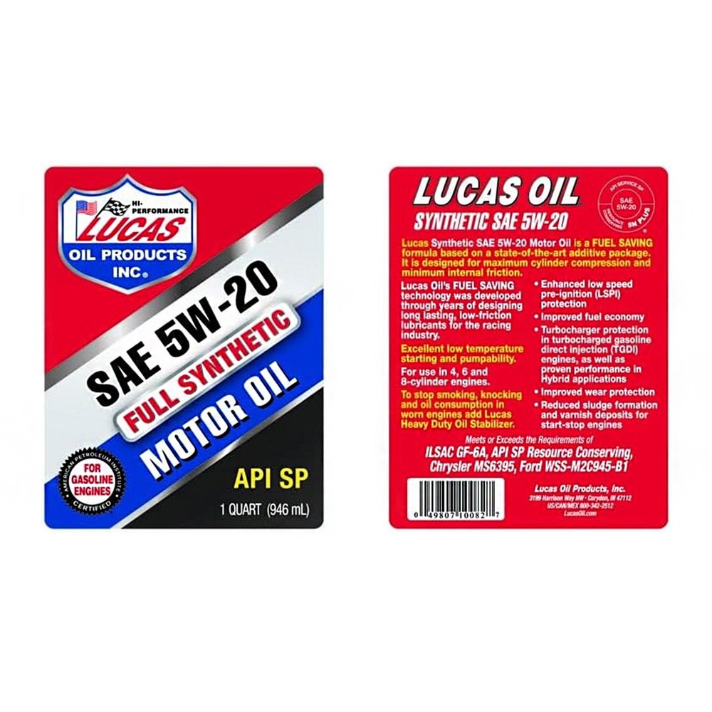 https://ebaystores.s3.us-east-2.amazonaws.com/trendsauto/Lucas-Oil/LUCAS-OIL-10082-01.jpg Lucas Oil SAE 5W-20 Full Synthetic API SP Passenger Car Motor Oil 1 Quart Bottle PART NUMBER: 10082 BRAND: Lucas Oil DESCRIPTION Lucas Full Synthetic Passenger Car Motor Oil (PCMO) Lucas Oil Products Synthetic API SP passenger car motor oils (PCMO) are blended from the highest quality API Group III and Group IV base oils and combined with a cutting-edge additive package of detergents, dispersants, antioxidants, and corrosion inhibitors. Shear stable viscosity modifiers insure multi-grade performance throughout the life of the oil. With the advent of API SP/ILSAC GF-6 comes new engine oil qualifying tests and the retirement of some older tests. Specifically, enhanced performance can be seen in the following improvements: maintaining piston cleanliness, oxidation control, engine oil sludge prevention, timing chain wear protection and fuel economy benefits. Protect your investment and rely on Lucas Oil for your car’s engine oil. FEATURES Outstanding low speed pre-ignition (LSPI) protection. Improved fuel economy and fuel economy retention over the oil drain interval. Turbocharger protection in turbocharged gasoline direct injection (TGDI) engines, as well as proven performance in Hybrid vehicles. Improved wear protection with low phosphorus and zinc for emissions system protection. Reduced sludge formation and varnish deposits for start-stop engines MAIN APPLICATIONS Lucas Oil offers a premium line of synthetic motor oils in the most common viscosity grades. Follow your owner’s manual recommendation for the correct viscosity grade for your engine. Lucas Oil recommends our synthetic motor oils for all cars and trucks with gasoline engines. Lucas Oil Synthetic Motor Oils will blend with all other conventional or synthetic motor oils. VEHICLE COMPATIBILITY Universal/No Fitment