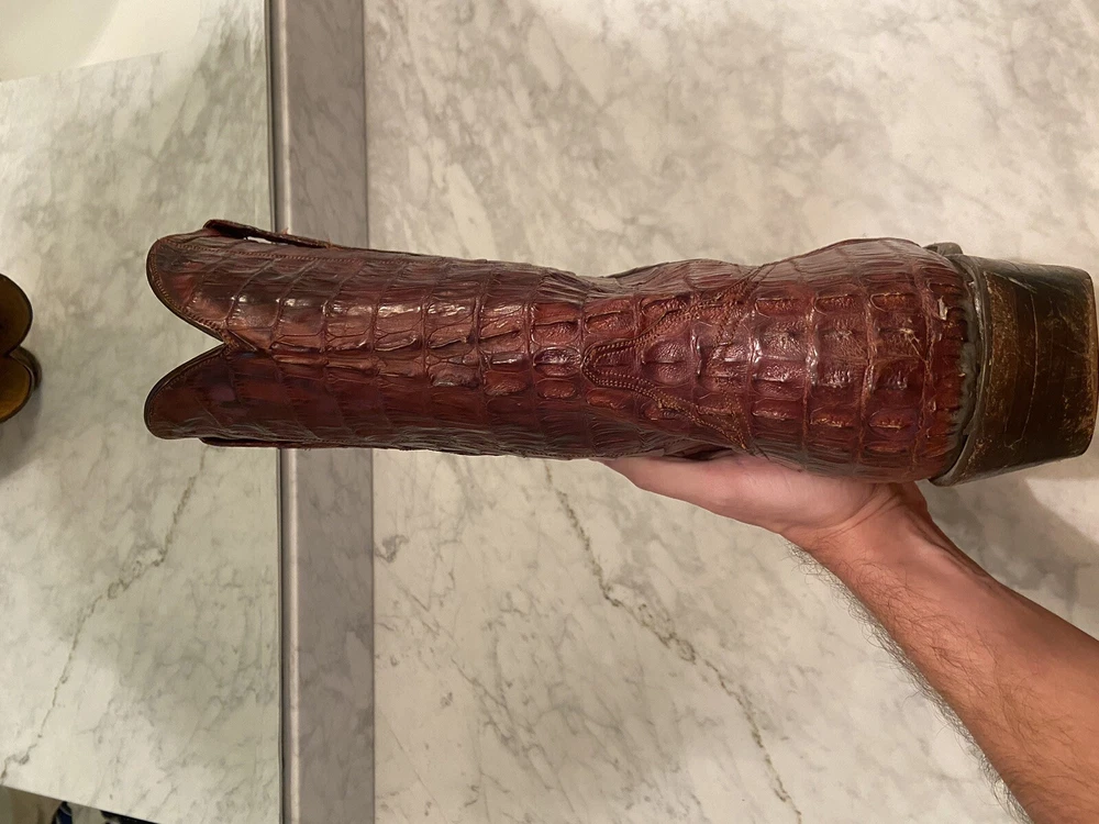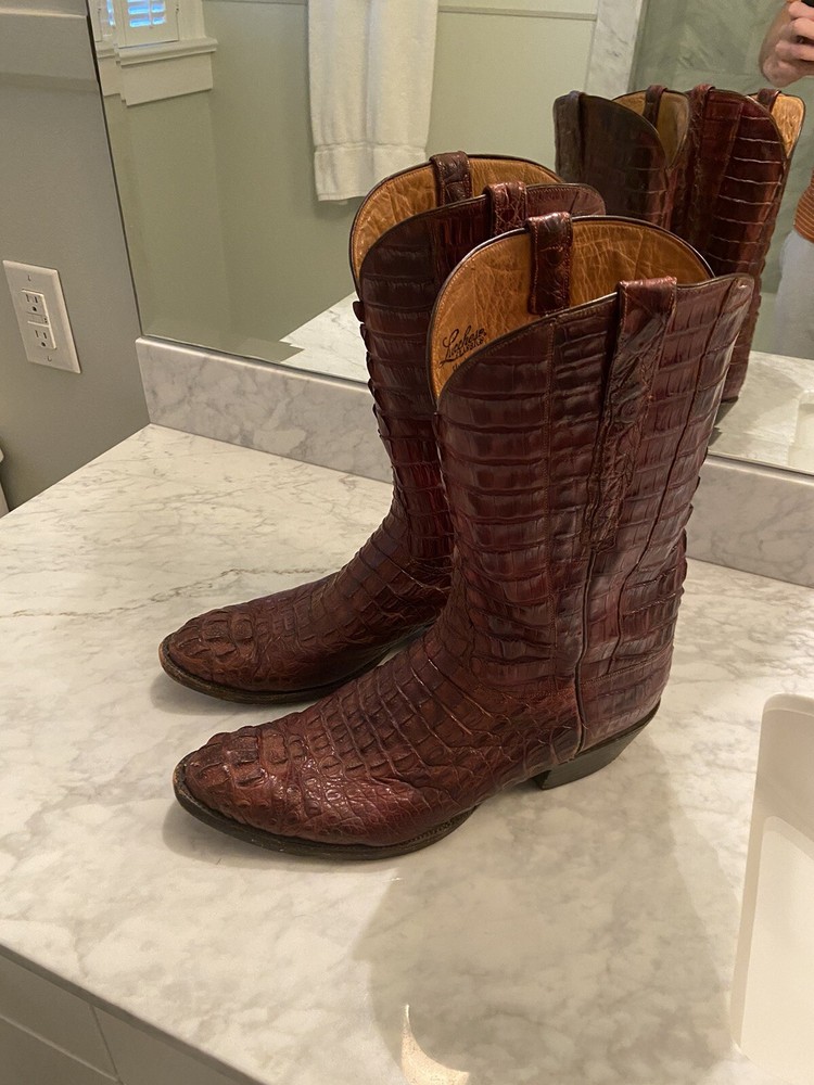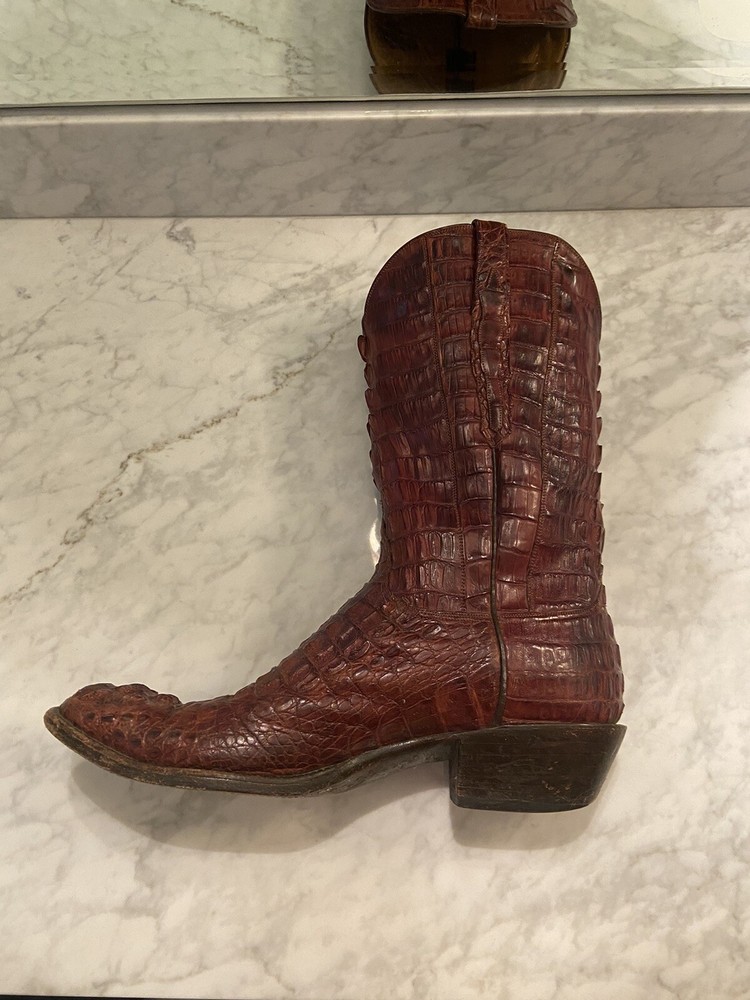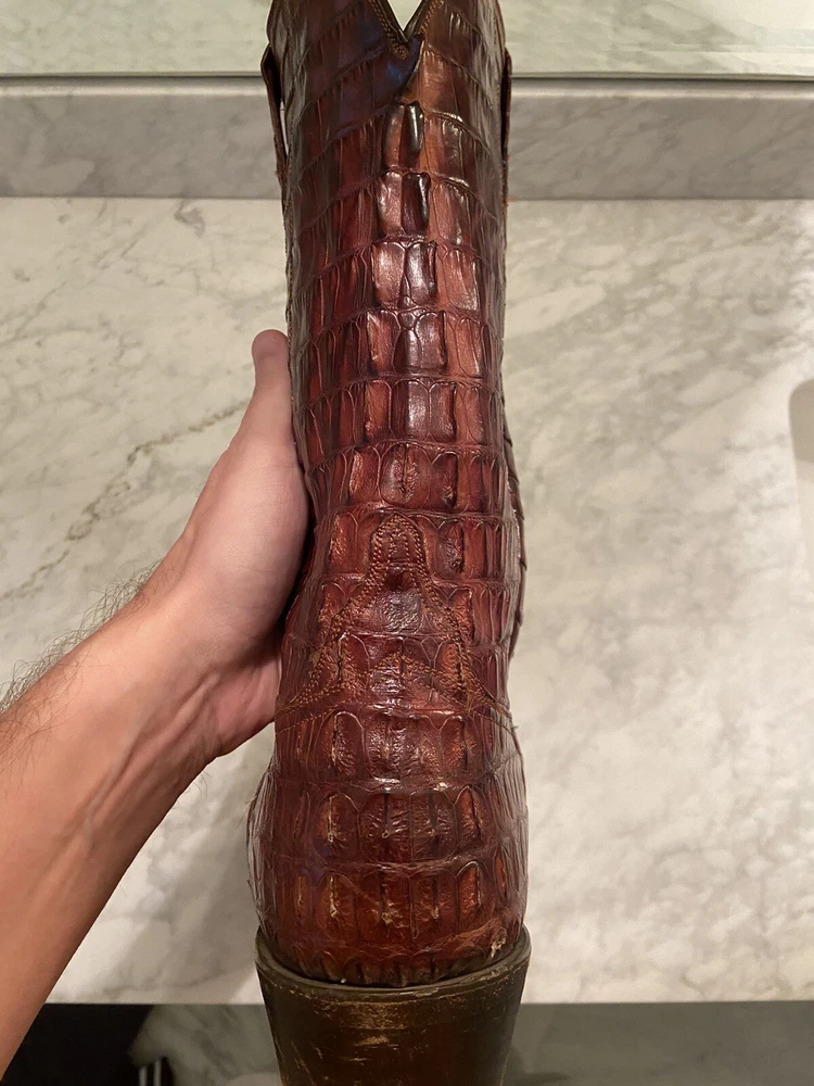 These full Aligator Lucchese boots in size 13 for men are a stylish addition to any wadrobe. The brown color of the boots complements any outfit, and the durable construction ensures long-lasting wear. These boots are perfect for any man who wants to make a statement with his footwear. Get your hands on these Lucchese boots today and step out in style! Lucchese boots are top quality and do complimentary repairs on boots when sent to their main office. Be able to take advantage of my mistake and buy these boots for a steal! Originally bought for 15k, comes with boot covers but no original box (my wife threw it out haha)