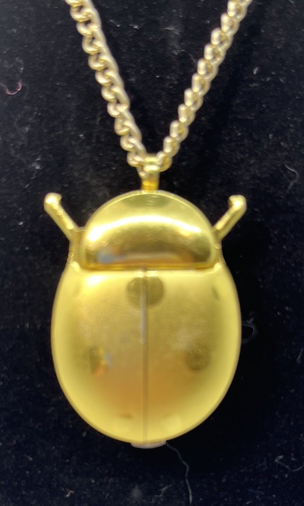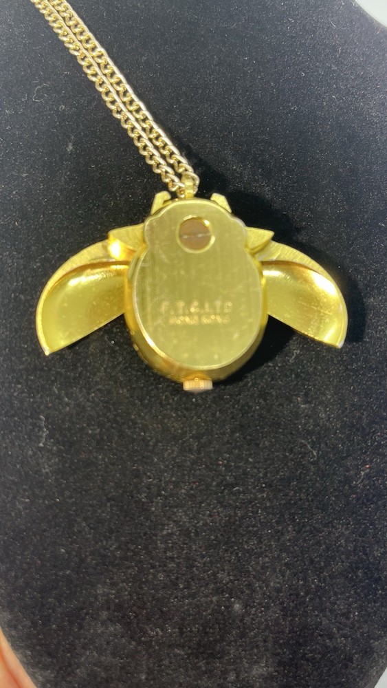 This Lucerne Lady Bug Necklace Watch features a charming design with a yellow gold case and a pearl dial. The unique feature of this vintage piece is that the wings of the ladybug open and close. It is made of gold-plated material and was manufactured in Hong Kong. Although it is not currently working and needs to be cleaned, this necklace watch would make a stylish accessory for women who appreciate vintage jewelry.