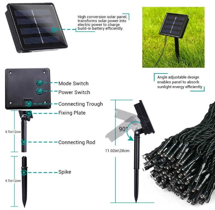 Luces solares navideñas, paquete de 2, 144 pies, 400 LED, resistentes al agua... Energía solar y encendido/apagado automático: estas luces navideñas solares multicolor utilizan energía solar, lo que elimina los costos adicionales de electricidad y los reemplazos de batería. El sensor de luz carga las luces durante el día y las enciende automáticamente por la noche 8 modos y función de memoria: use los botones de encendido/apagado y modo para seleccionar entre 8 modos de iluminación. El chip de memoria incorporado guarda su última configuración de modo, por lo que no necesita restablecerlo diariamente Impermeable: con una clasificación IP65, estas luces navideñas solares están diseñadas para soportar todas las condiciones climáticas, incluidas las fuertes lluvias y la nieve, lo que las hace adecuadas para uso en interiores y exteriores Fácil de instalar: paquete de 2, cada cadena de 72 pies (incluido un cable de 6,5 pies) con un panel solar y una estaca de tierra es ideal para envolver árboles o decorar varios espacios al aire libre. Asegúrese de que el panel solar esté expuesto a la luz solar Cadena de luces solares de uso generalizado: estas cadenas de luces alimentadas por energía solar son perfectas para Halloween, Navidad, bodas, días festivos, jardines, patios, céspedes, cercas, porches, árboles, techos y terrazas Especificaciones: Color del LED: Multicolor Configuración: Exterior Cantidad de LED: 200 LED Panel solar: 2 V/300 mA Tipo de batería: Batería recargable NI-MH de 1200 mAH Fuente de luz: LED Interruptor: ON/OFF, MODE Modos de funcionamiento: 8 modos de iluminación Tiempo de carga: 6-8 horas Longitud total: 72 pies (22 m) Longitud entre 2 bombillas: 3,9 pulgadas (0,1 m) Longitud desde el panel solar hasta el primer LED: 6,5 pies (2 m) ¿Qué hay en la caja? 2 x 200 luces LED solares de cadena 2 x Panel solar con estaca de tierra 1 x Manual del usuario NOTAS 1. ¿Cómo comprobar que las luces de cadena funcionan durante el día? A. Cubra completamente el panel solar, las luces de cadena se encenderán. B. Si no es así, deje el panel solar al sol durante una hora y luego vuelva a cubrir completamente el panel solar y debería encenderse. 2. Asegúrate de que el panel solar NO esté protegido del sol, ya que necesita absorber suficiente energía del sol. 3. SOLO está diseñado para protegerse de la lluvia. NO lo sumerjas en el agua. 4. La cadena de luces solares tiene función de memoria. Volverá a su configuración anterior cuando la apagues y la enciendas de nuevo. 5. El panel solar tiene una función de sensor de luz, por lo que puede apagarse automáticamente al amanecer y encenderse al anochecer. Condiciones de venta y comentarios: Los comentarios son muy importantes para nosotros y para eBay. Si estás satisfecho con nuestra transacción, tómese un momento para dejar un comentario positivo. ¡SU satisfacción es nuestra prioridad número uno! Si hay algún problema, POR FAVOR contáctenos ANTES de dejar una calificación neutral o negativa para que podamos resolver cualquier inquietud. PROMETEMOS que podemos hacerlo feliz si nos da una oportunidad justa.