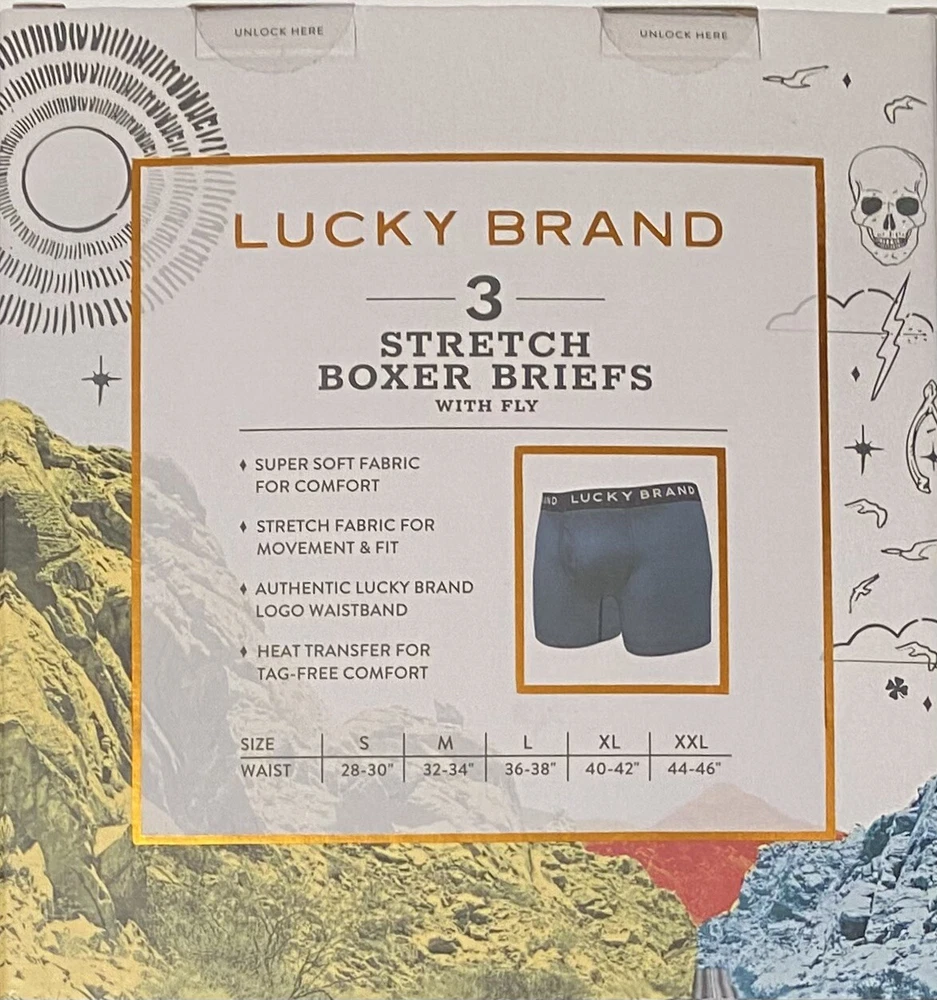 Lucky Brand Box Of 3 Always Wear The Clover 3- Stretch Boxer Briefs With Fly 1- Navy 1-Gray Print 1-Dark Heather Gray 95% Cotton/5% Spandex Heather Gray - 57% Cotton/38% Polyester/5% Spandex Large (36-38) Ne w In Box