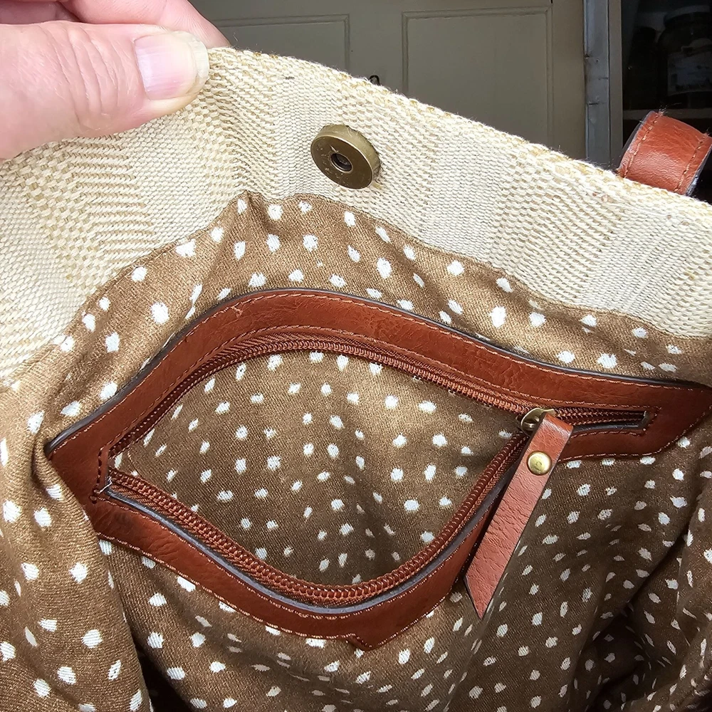 Spacious and stylish tote bag with intricate blue patterns, ideal for daily use. Durable leather straps and secure zipper closure. • Snap closure • Leather straps • Spacious interior • Intricate blue patterns • Durable materials Features: • Beaded Detail • Tassel Detail • Inside Pockets • Southwestern Style, Single Compartment Size: Womens Medium Size Bag Measurements: Length 14 in / 36 cm Width 4.5 in / 11 cm Height 13 in / 33 cm Chain Drop 13 in / 33 cm Condition: Pre-Owned Good Very Good condition Gently used No rips, stains, tares, or pilling No visible signs of wear Measurements are found in the description Please review all photos and descriptions closely before purchasing. Thank you! Smoke free workspace Please read the description for further details and measurements, Thank you!
