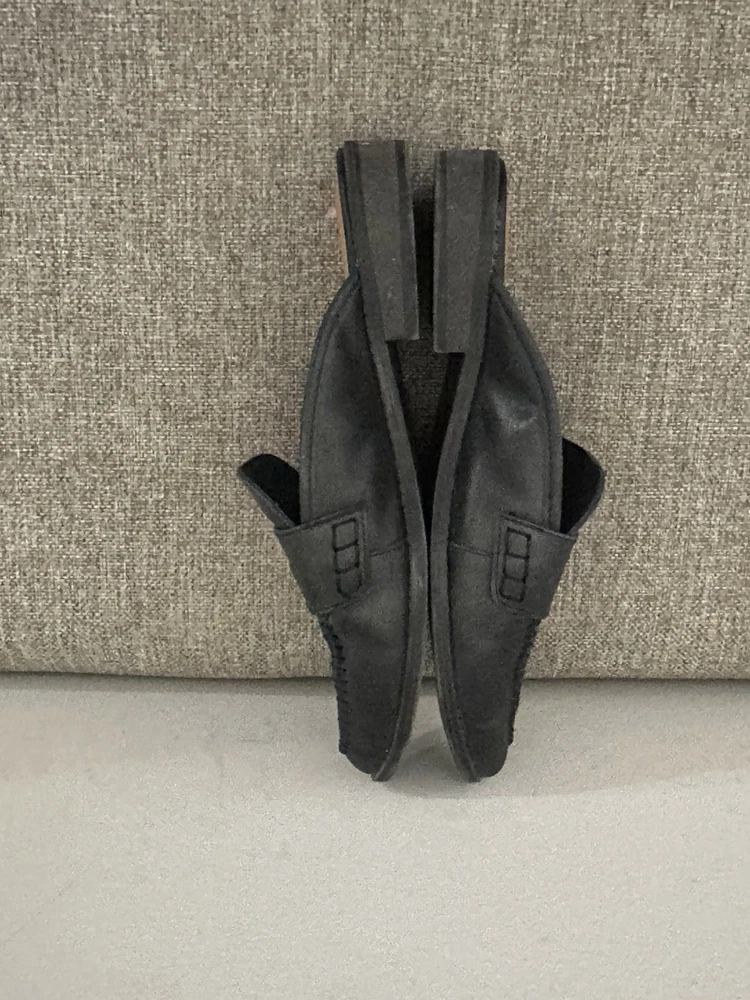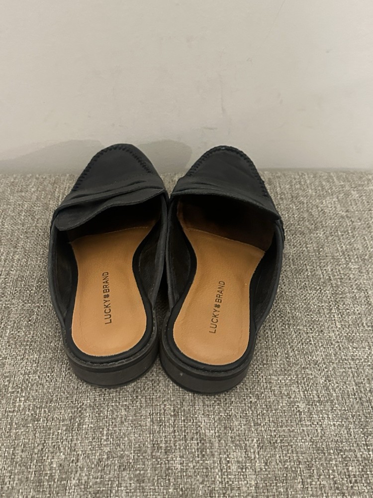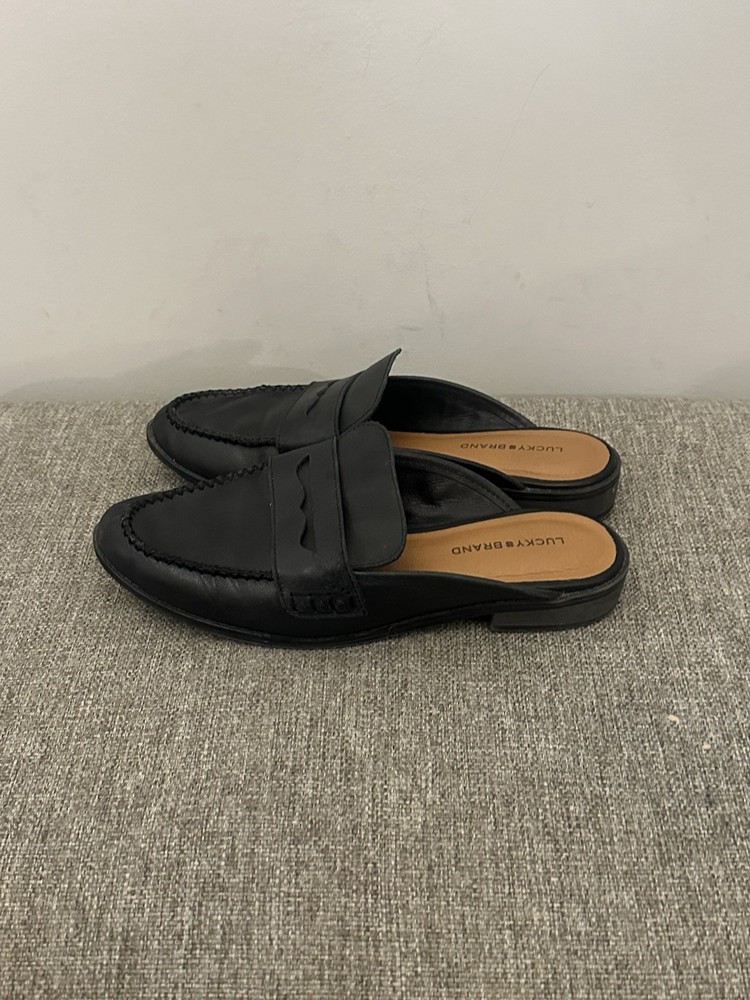 These Lucky Brand Women’s Black Leather Slip On Mule Penny Loafers in size 7.5 offer a stylish and comfortable option for casual or businesswear. The almond toe shape and slip-on style make them easy to wear, while the leather lining and insole provide a luxurious feel. With a rubber outsole for traction, these loafers are lightweight and designed for all-day comfort. The classic black color and preppy theme make them versatile for various occasions, making them a staple in any woman's wardrobe. Preowned Good Condition