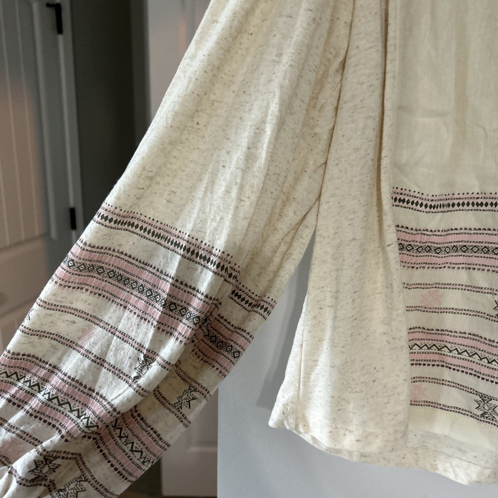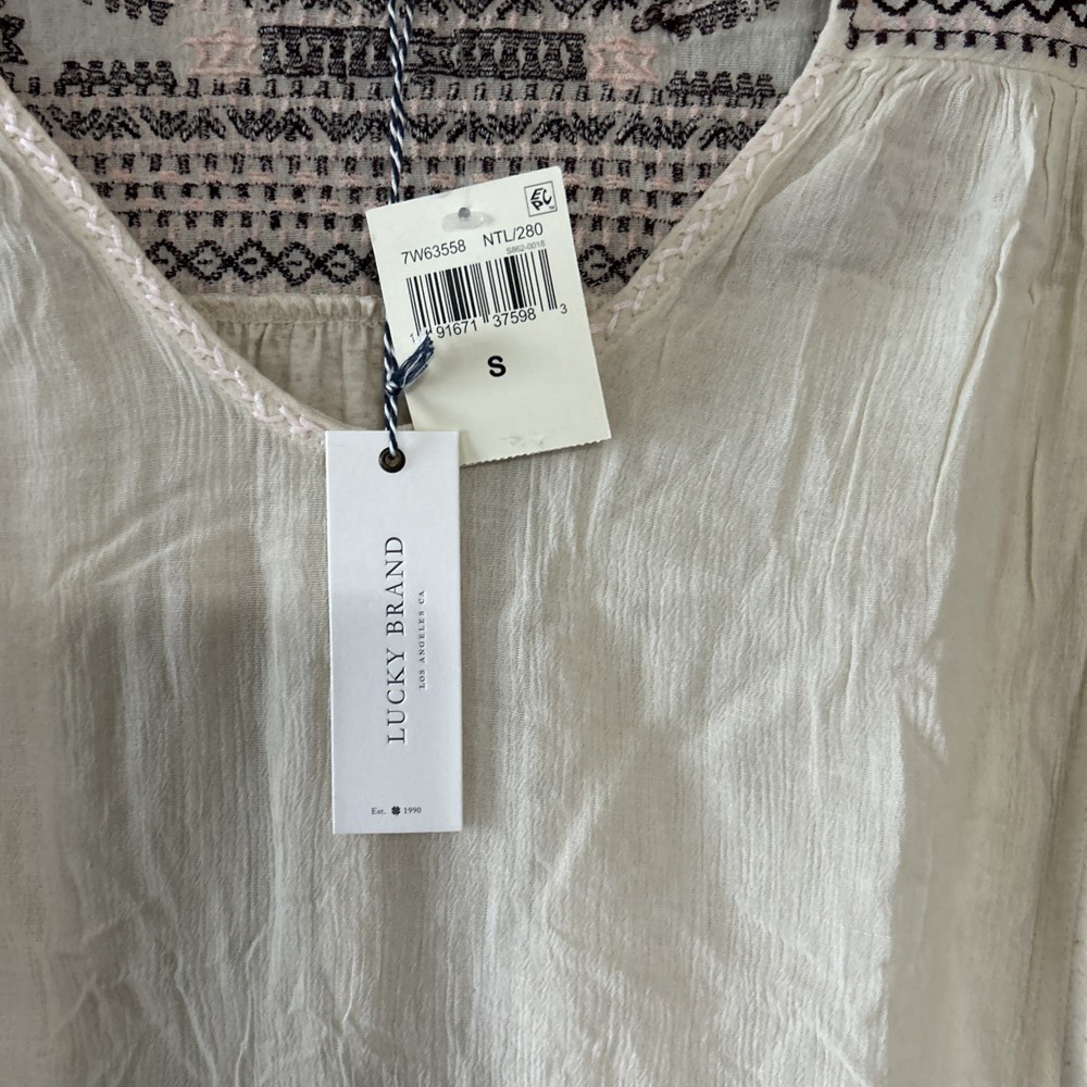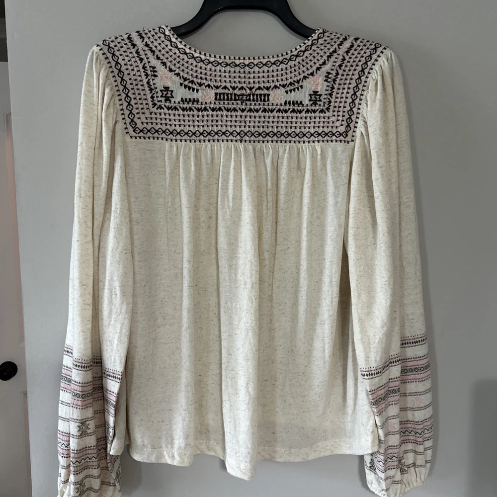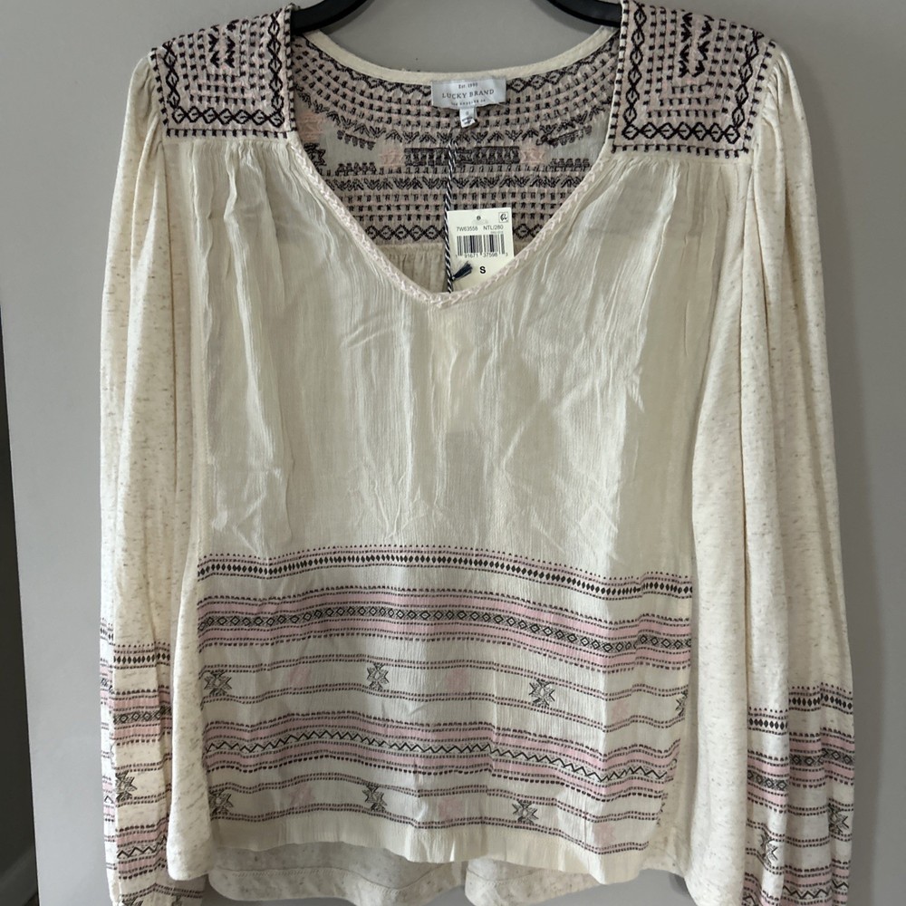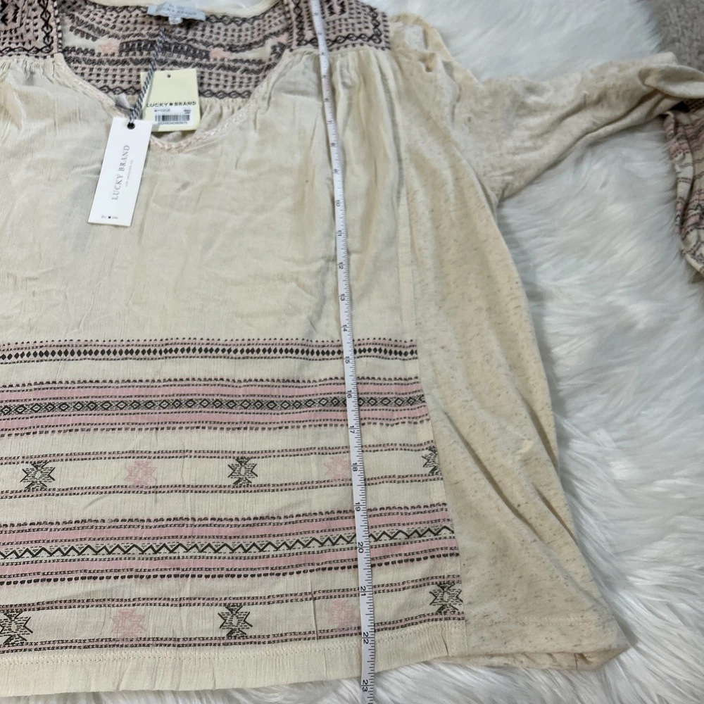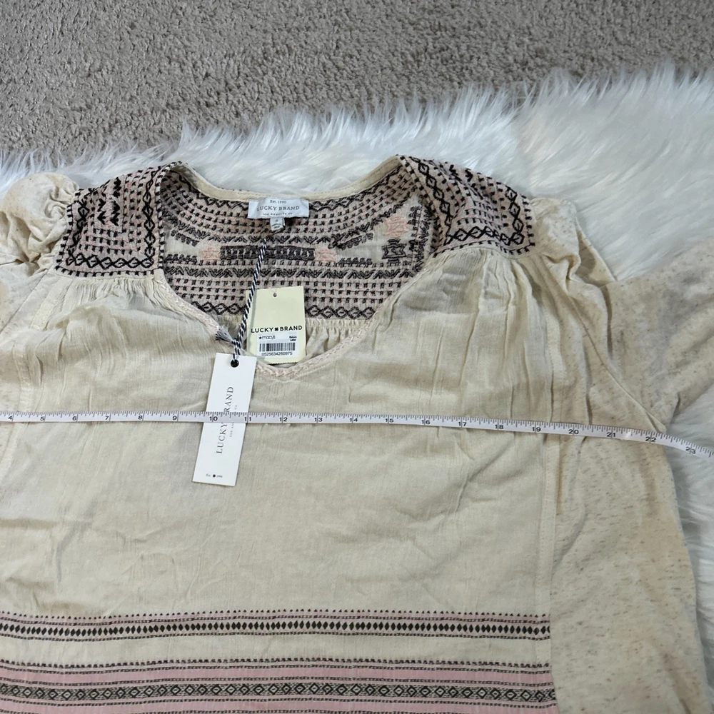 The Lucky Brand oversized women's tan embroidered boho long balloon sleeve top is a stylish and versatile garment perfect for casual or workwear occasions. This top features a geometric pattern with embroidered accents, a scoop neckline, and long balloon sleeves. Made from a blend of polyester and linen, it offers a comfortable fit with a regular size S. The pullover closure and collarless design make it easy to wear, while the boho style adds a trendy touch to your outfit. Ideal for all seasons, this blouse from Lucky Brand is a must-have for any fashion-forward woman.