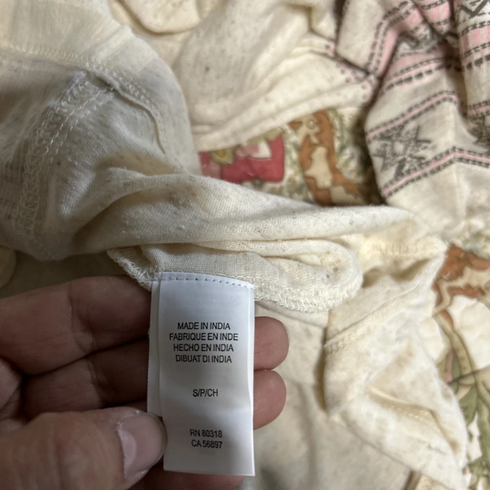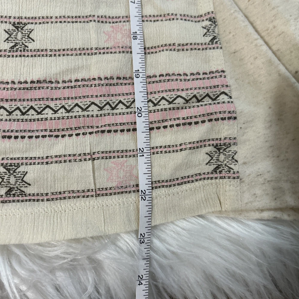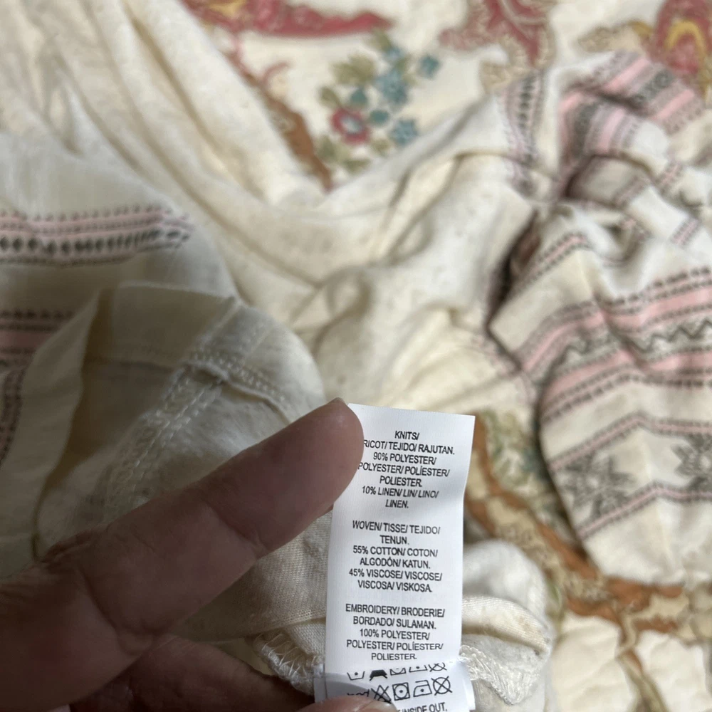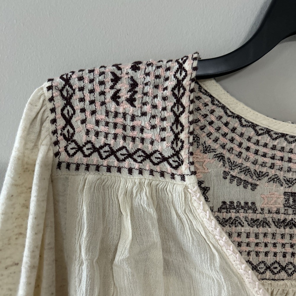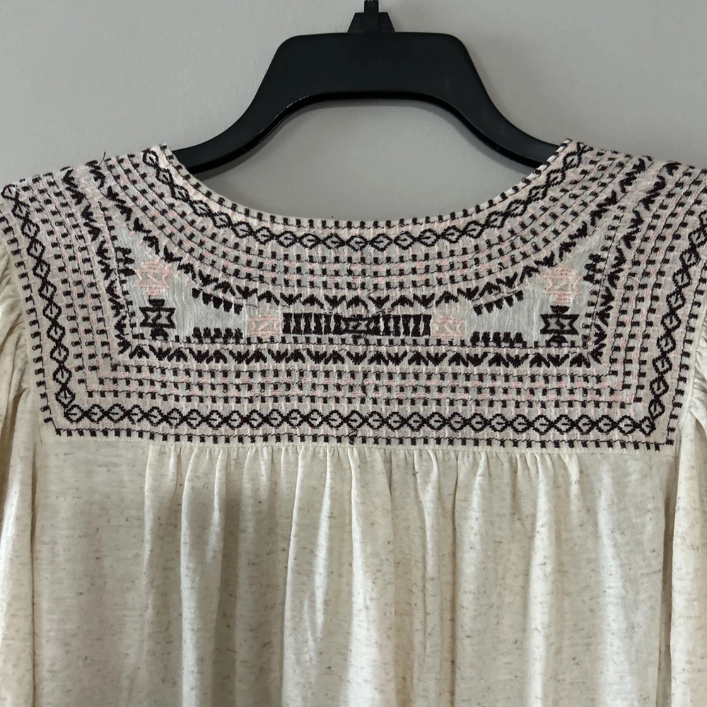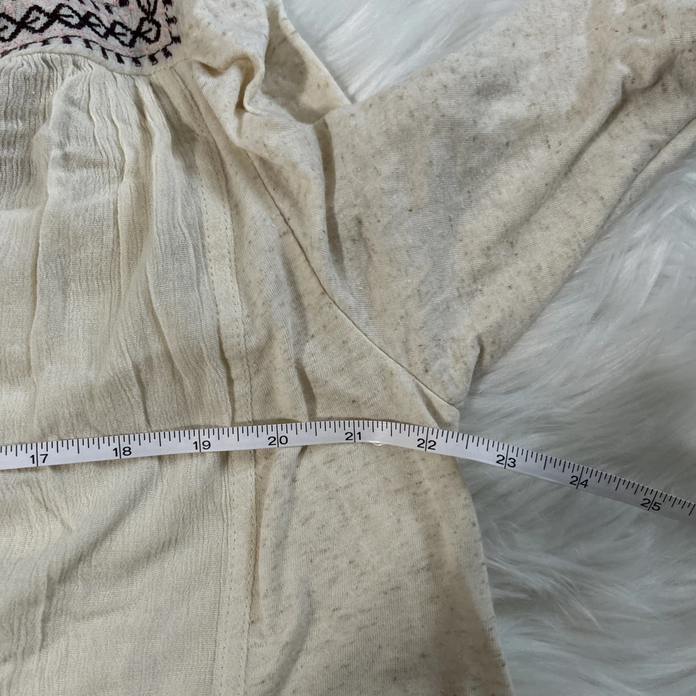The Lucky Brand oversized women's tan embroidered boho long balloon sleeve top is a stylish and versatile garment perfect for casual or workwear occasions. This top features a geometric pattern with embroidered accents, a scoop neckline, and long balloon sleeves. Made from a blend of polyester and linen, it offers a comfortable fit with a regular size S. The pullover closure and collarless design make it easy to wear, while the boho style adds a trendy touch to your outfit. Ideal for all seasons, this blouse from Lucky Brand is a must-have for any fashion-forward woman.