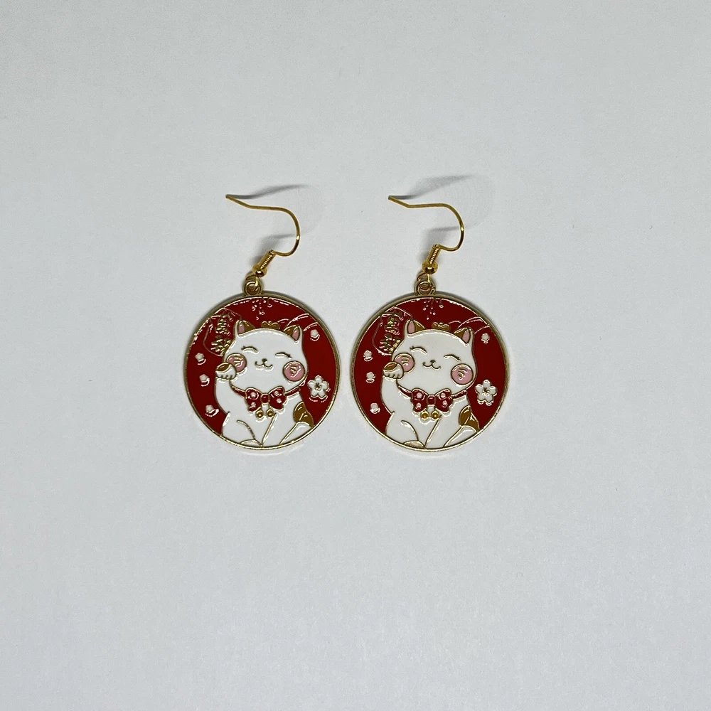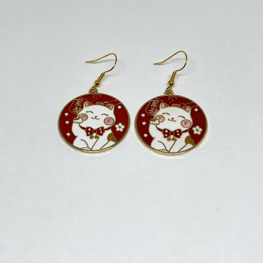 The cat charm is 1.18in x 1.3in. Adorn your ears with these beautiful handmade Lucky Cat earrings, perfect for celebrating special occasions such as Lunar New Year, Christmas, and Valentine's Day. The earrings feature a charming red enamel cat shape, dangling from a gold hook closure. The feline-inspired earrings are a symbol of good fortune, luck, and prosperity, making them an ideal gift for those seeking positivity and good vibes. The design is ideal for lovers of the Lunar New Year, Money Cat, Fortune Cat, Red Lucky Cat, and Lucky Cat themes. Add these delightful earrings to your collection today and spread joy wherever you go. A perfect gift idea! Limited production!