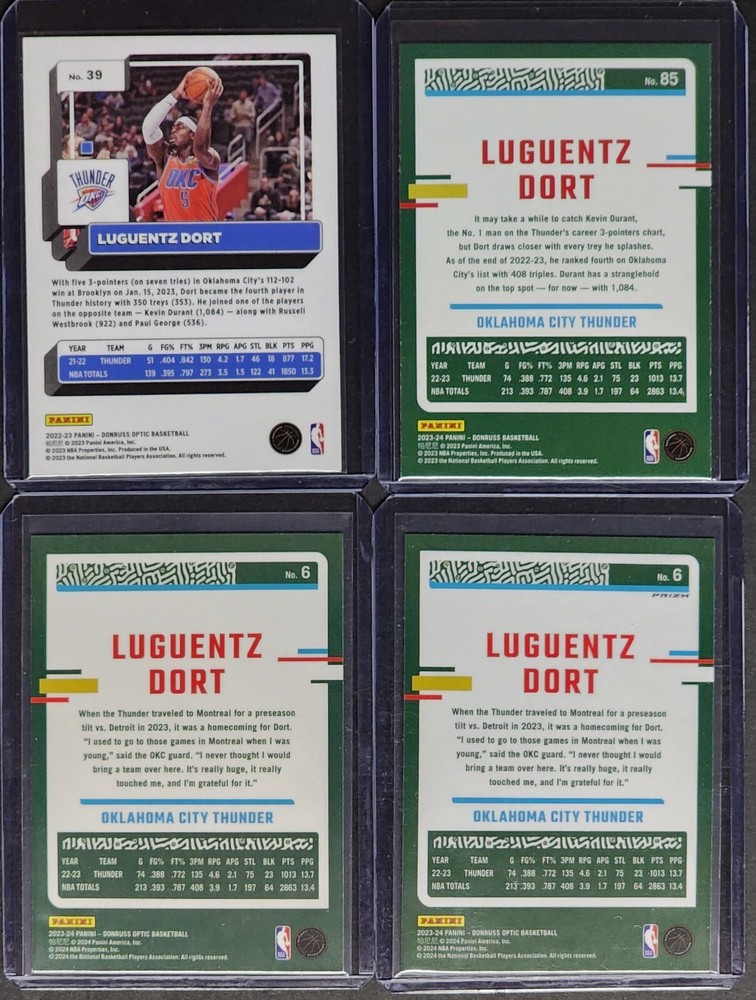 Season: 2022-24 Team: Oklahoma City Thunder Sport: Basketball Manufacturer: Panini League: National Basketball Association (NBA) Language: English Seller Notes: “Near mint or better.” Set: 2022-23 Panini Donruss Optic, 2023-24 Panini Donruss Optic, 2023-24 Panini Donruss Player/Athlete: Lugentz Dort Year Manufactured: 2023 Features: Base Set, Hologram, Parallel, Short Print Card Size: Standard Original/Licensed Reprint: Original Vintage: No Type: Sports Trading Card Country/Region of Manufacture: United States Number of Cards: 4 Material: Card Stock Autographed: No