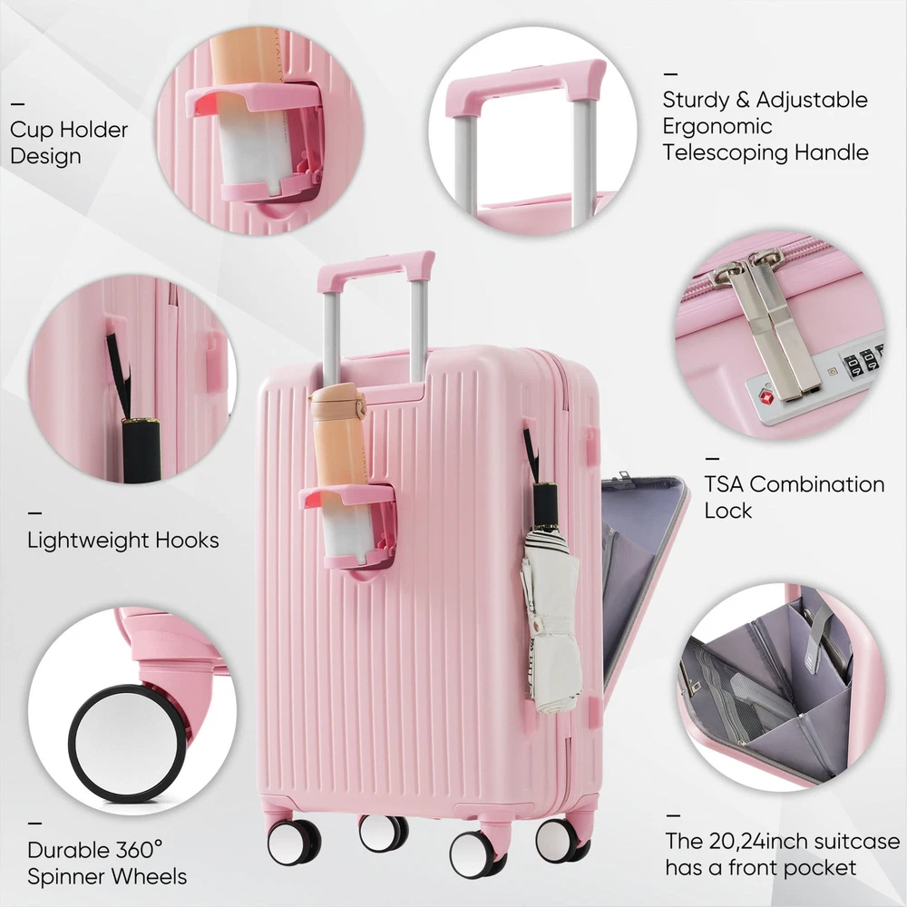 Luggage Set of 4 with USB Port, 20, 24inch with front opening design Airline Certified Carry on Luggage with Cup Holder, ABS Hard Shell Luggage with Expandable Travel Bag, pink Specifications Place of Origin #originPlace# Main Color Pink Main Material ABS Dangerous Goods #dangerFlag# Dimensions & Weights Assembled Length (in.) 20.00 Assembled Width (in.) 12.00 Assembled Height (in.) 30.00 Weight (lbs) 27.70 Product Features Effortless Travel: Say goodbye to travel hassles with our 3-piece suitcase set featuring sizes of 20, 24, and 28 inches. The 20 and 24-inch cases open from the front for easy access to your belongings, making packing and unpacking a breeze.<