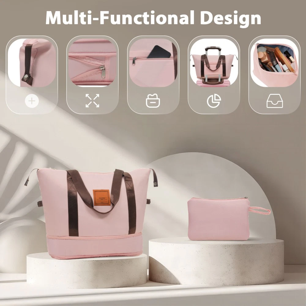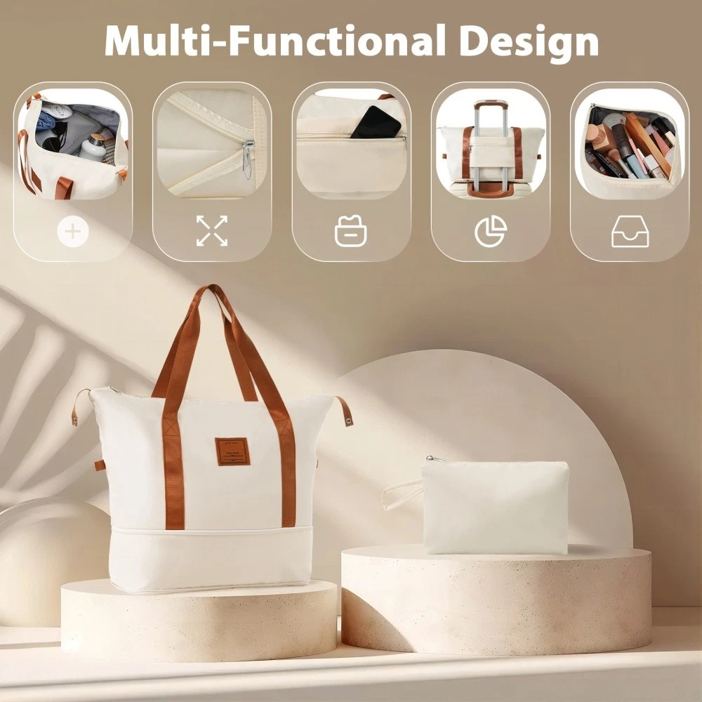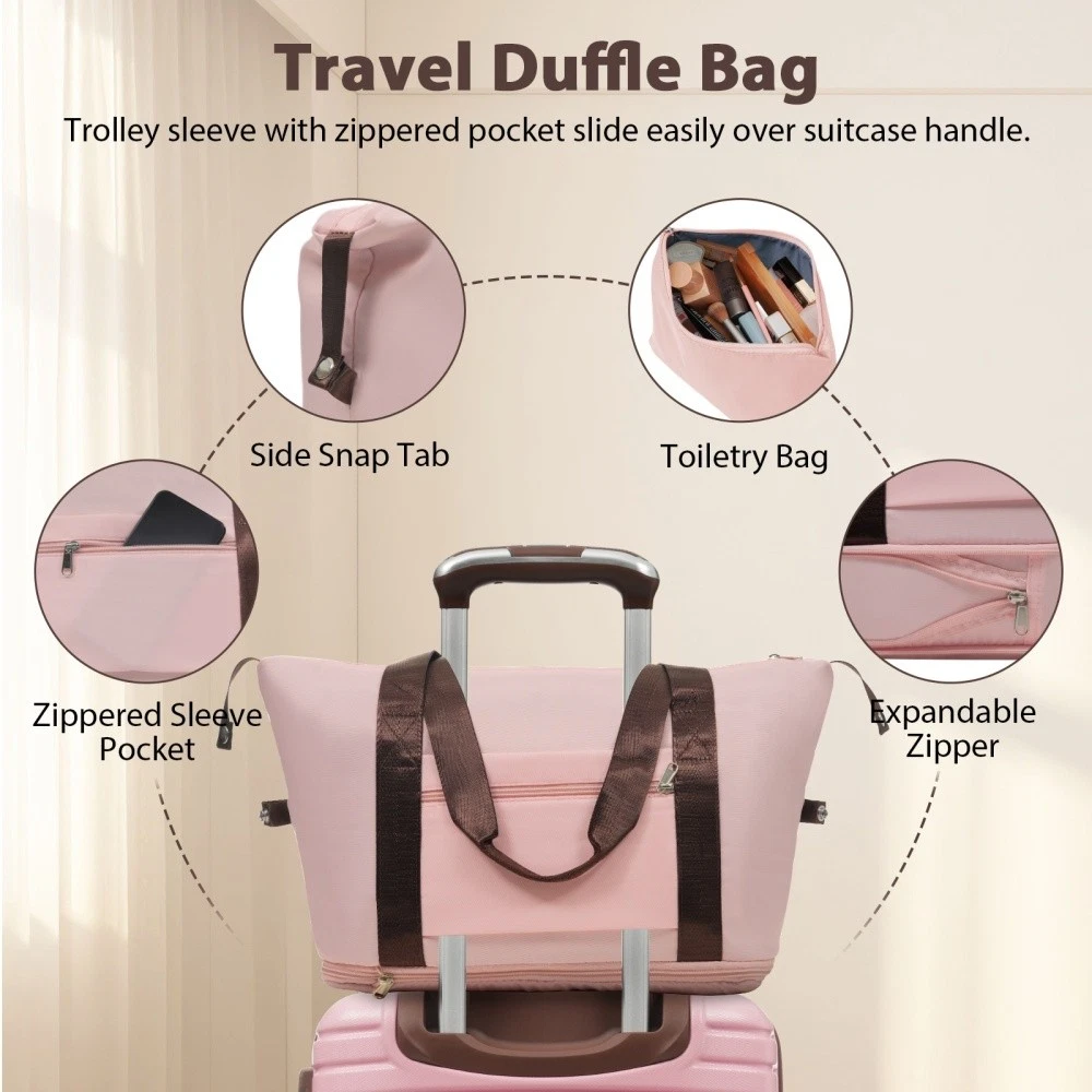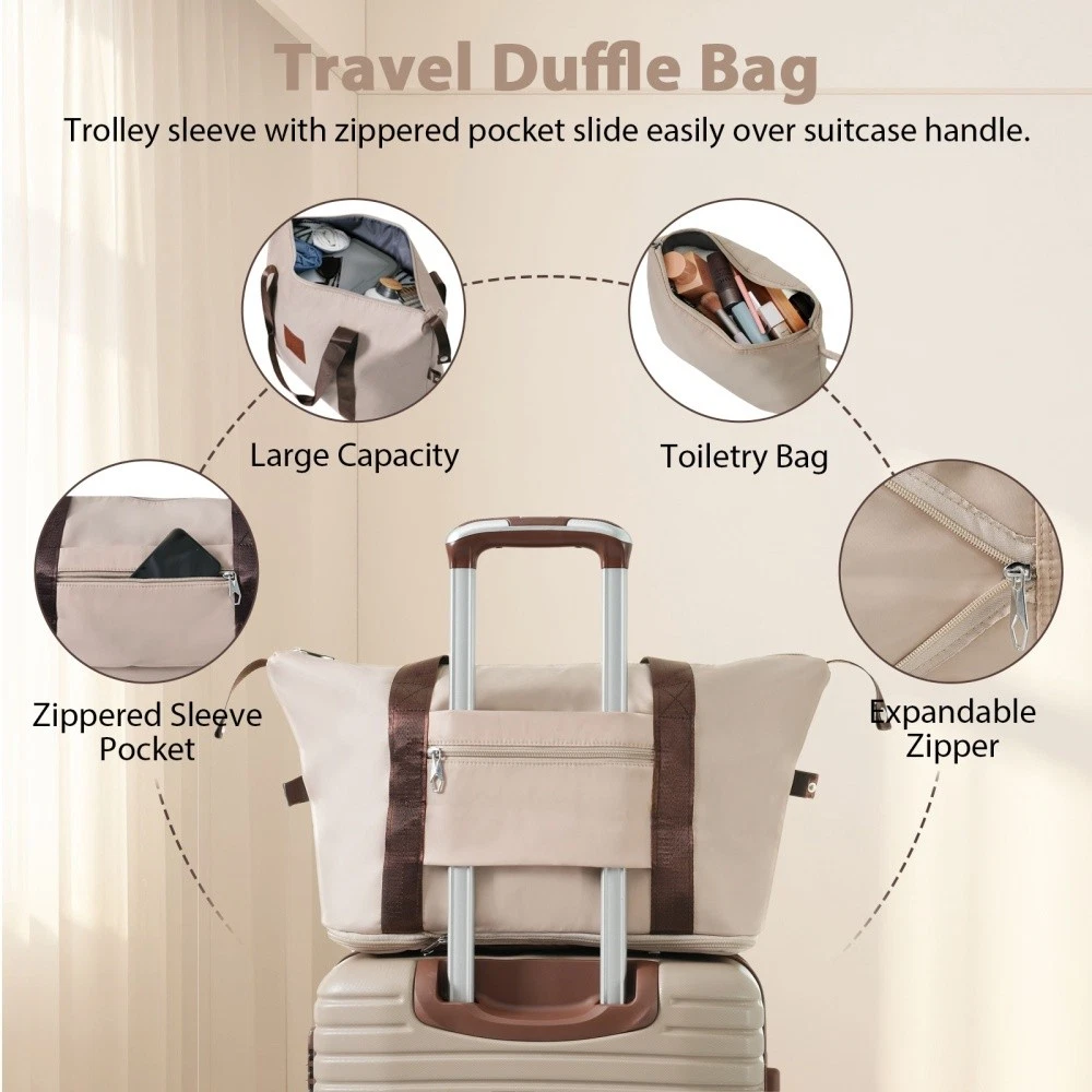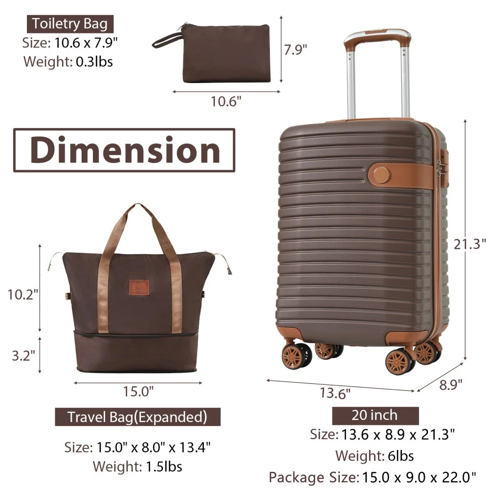 3 piece set offers a 20" luggage, a weekender travel bag and a toiletry bag. The 20-inch carry-on luggage meets the size requirements of most airlines - 22x14x9, allowing you to travel worry-free. Perfect for weekend getaways and short trips. 20-inch size:13.6"x 8.9"x 21.3". 20-inch suitcase is made of lightweight, durable and impact-resistant high-quality ABS material, and the travel duffel bag and toiletry bag are made of waterproof and scratch-resistant Oxford cloth, providing comprehensive security for all your belongings. Superior quality, silent-running, multi-directional silent spinner wheels assure smooth maneuverability. 360° double wheels are more durable and adaptable to various road conditions. Bring comfort to your journey. Upgraded zipper bites tightly and pulls smoothly, effectively preventing the chain heads from falling off and zippers from tearing. Paired with a 3-dial TSA lock, it provides security and convenience for travel. Expandable duffel bag: The duffel bag comes with a trolley sleeve with zippered pocket, and you can conveniently attach it to the adjustable handle. HOW TO RESET THE TSA COMBINATION LOCK 1. The lock is set to 0-0-0 at the factory. 2. Make sure the dials are rotated at 0-0-0 or any other code you've set before resetting it. 3. Use a pen or something pointed to press the reset hole adjacent to the dials. 4. Enter your new code by rotating the dials 5. Push the key button once and your code is now set. 6. Scramble the dials and test your new code to be sure the correct one is set.