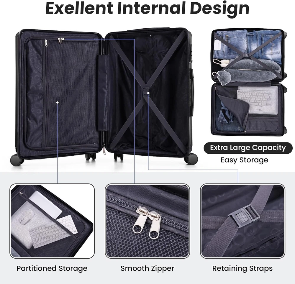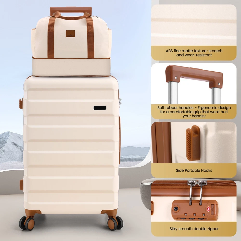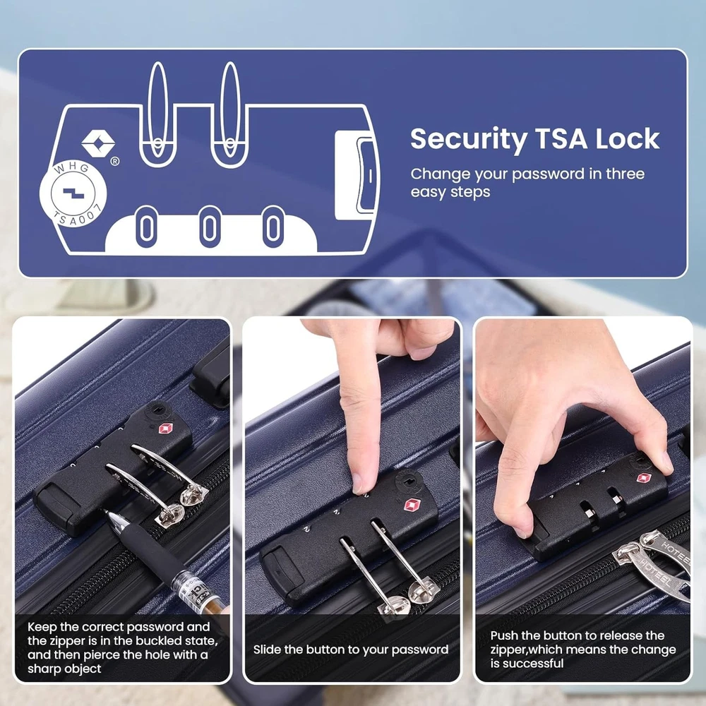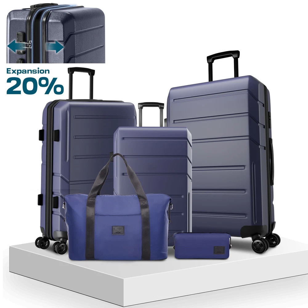 Product description Product Description [Multi-functional 5-Piece Travel Set] 5 piece luggage set features three expandable suitcases (20 inch carry-on, 24 inch and 28 inch checked luggage), each with 20% expansion capacity. Complete with a matching travel bag and toiletry bag, it's perfect for any journey. TSA-approved locks ensure secure travel and hassle-free security checks. [360° Spinner Wheels] Featuring multi-directional silent double wheels that rotate 360°, the spinner luggage set glides smoothly across various surfaces including slopes, cobblestones, and grass. The effortless maneuverability reduces physical strain, making it perfect for both business trips and leisure travel. [Adjustable Handle System] 3-step telescoping handle features a PC-reinforced grip for comfort and durability. Convenient handles on top and sides offer multiple carrying options, while four sturdy side feet keep thehard case suitcase stable when upright or sideways, protecting the shell from damage. The ergonomic design ensures easy handling throughout your journey. [Premium Materials] Crafted from durable ABS+PC material with a scratch-resistant textured surface, this hardcase luggage with spinner wheels maintains its elegant appearance over time. The spacious interior features partitions for efficient organization. Both the travel bag and toiletry bag are made of water-resistant, high-quality polyester fabric. [Quality Assurance] Our suitcase set has passed rigorous drop tests, ensuring excellent impact resistance. All components including the trolley handle, carrying handles, wheels, and straps are replaceable if damaged. Please don't hesitate to contact us with any questions or concerns about your product. Set Password Expandable Storage Capacity Luggage Case Details Easy-Carry Suitcase 20/24/28" Hard Shell Luggage Set Product Description 【Practical 5-in-1 Set】5 piece luggage set features a 20 inch carry on luggage, 24 inch/28 inch luggage, duffel bag and toiletry bag. Perfect for short trips, the carry-on meets airline requirements. The smooth-rolling dual wheels ensure quiet, effortless movement on various surfaces, making your journey more comfortable. TSA-approved locks ensure secure travel and hassle-free security checks. 【Hard Shell Carry On Luggage】Upgraded with premium ABS+PC hard shell material, the suitcase set 5 piece offers superior impact resistance and has passed rigorous drop tests. The textured surface prevents scratches, maintaining its sleek appearance. Inside, mesh compartments and cross straps keep your belongings organized and secure. 【3-stage Telescopic Handle】The handle can be adjusted according to your height. Ergonomic rubber handles on top and sides ensure comfortable grip and hand protection during transport. Side feet ensure stability when luggage is placed sideways, while integrated hooks let you hang shopping bags for added convenience during travel. 【Large Capacity Bag】This spacious duffel bag accommodates 2-3 days of clothing and features waterproof compartments for toiletries and liquids. The complementary toiletry bag helps organize personal care items for efficient travel. 【Replaceable parts】Components of hard luggage sets including telescopic handles, carry handles, wheels, and duffel bag straps are replaceable. Please contact us if any parts need replacement or if you have questions. Double Handle Design Handles on the top and sides of the suitcase make it easy to lift both horizontally and vertically. Comfort Puller Tie rod reinforced non-slip, give you a better experience. Side Support Silicone It serves to protect the luggage shell when security checks etc. require the case to be placed on its side. Spinner Wheels The double-wheel structure is more stable, making it less likely to tip over when pushed upright.