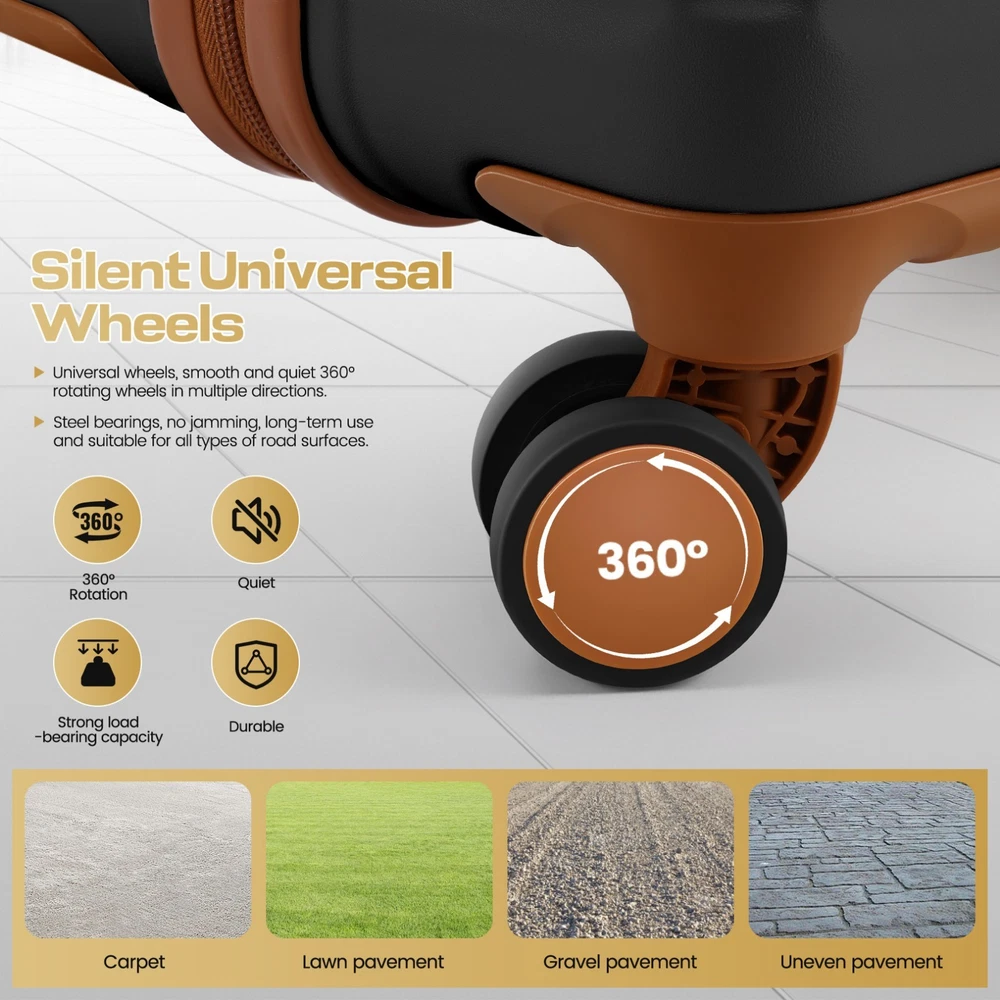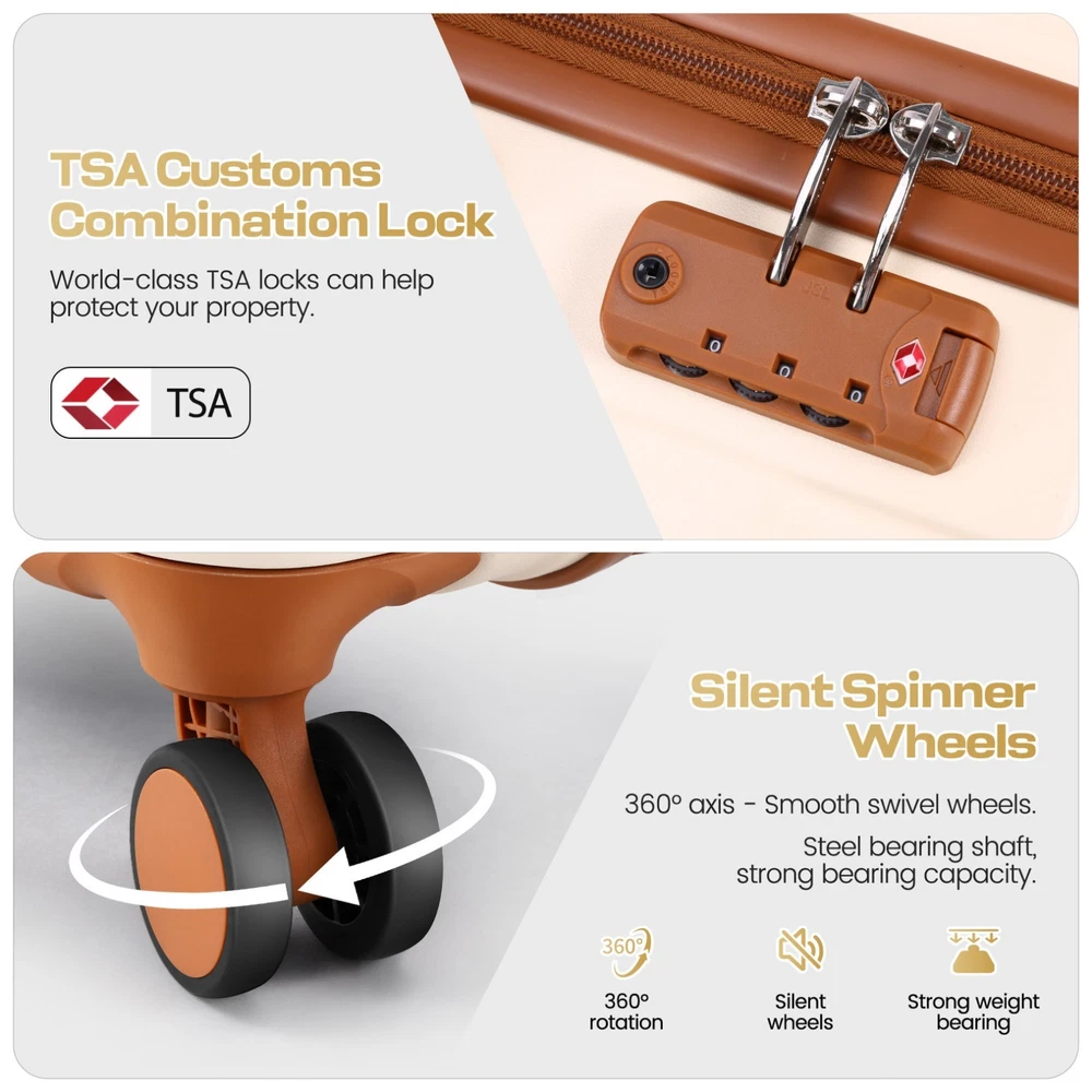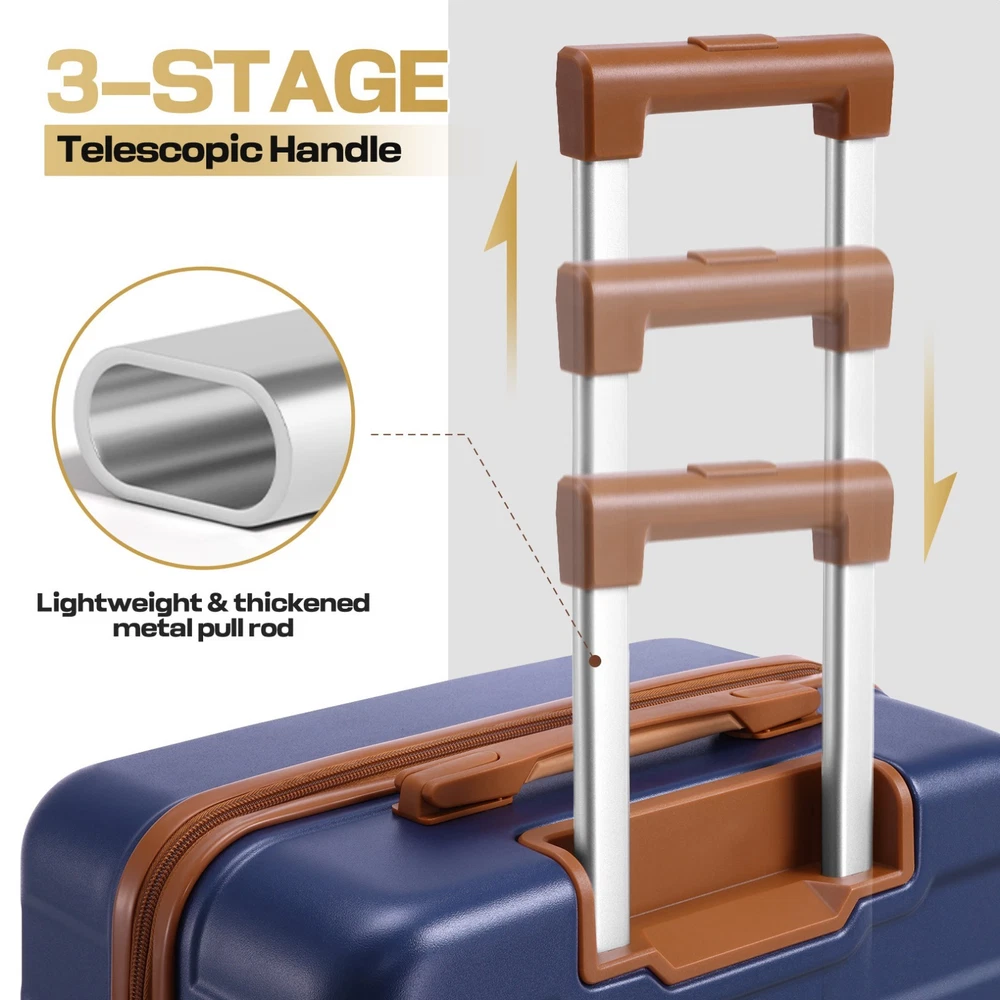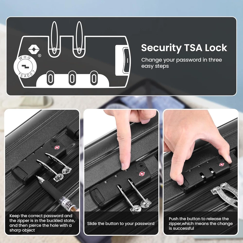Product description Product Description [Multi-functional 5-Piece Travel Set] 5 piece luggage set features three expandable suitcases (20 inch carry-on, 24 inch and 28 inch checked luggage), each with 20% expansion capacity. Complete with a matching travel bag and toiletry bag, it's perfect for any journey. TSA-approved locks ensure secure travel and hassle-free security checks. [360° Spinner Wheels] Featuring multi-directional silent double wheels that rotate 360°, the spinner luggage set glides smoothly across various surfaces including slopes, cobblestones, and grass. The effortless maneuverability reduces physical strain, making it perfect for both business trips and leisure travel. [Adjustable Handle System] 3-step telescoping handle features a PC-reinforced grip for comfort and durability. Convenient handles on top and sides offer multiple carrying options, while four sturdy side feet keep thehard case suitcase stable when upright or sideways, protecting the shell from damage. The ergonomic design ensures easy handling throughout your journey. [Premium Materials] Crafted from durable ABS+PC material with a scratch-resistant textured surface, this hardcase luggage with spinner wheels maintains its elegant appearance over time. The spacious interior features partitions for efficient organization. Both the travel bag and toiletry bag are made of water-resistant, high-quality polyester fabric. [Quality Assurance] Our suitcase set has passed rigorous drop tests, ensuring excellent impact resistance. All components including the trolley handle, carrying handles, wheels, and straps are replaceable if damaged. Please don't hesitate to contact us with any questions or concerns about your product. Set Password Expandable Storage Capacity Luggage Case Details Easy-Carry Suitcase 20/24/28" Hard Shell Luggage Set Product Description 【Practical 5-in-1 Set】5 piece luggage set features a 20 inch carry on luggage, 24 inch/28 inch luggage, duffel bag and toiletry bag. Perfect for short trips, the carry-on meets airline requirements. The smooth-rolling dual wheels ensure quiet, effortless movement on various surfaces, making your journey more comfortable. TSA-approved locks ensure secure travel and hassle-free security checks. 【Hard Shell Carry On Luggage】Upgraded with premium ABS+PC hard shell material, the suitcase set 5 piece offers superior impact resistance and has passed rigorous drop tests. The textured surface prevents scratches, maintaining its sleek appearance. Inside, mesh compartments and cross straps keep your belongings organized and secure. 【3-stage Telescopic Handle】The handle can be adjusted according to your height. Ergonomic rubber handles on top and sides ensure comfortable grip and hand protection during transport. Side feet ensure stability when luggage is placed sideways, while integrated hooks let you hang shopping bags for added convenience during travel. 【Large Capacity Bag】This spacious duffel bag accommodates 2-3 days of clothing and features waterproof compartments for toiletries and liquids. The complementary toiletry bag helps organize personal care items for efficient travel. 【Replaceable parts】Components of hard luggage sets including telescopic handles, carry handles, wheels, and duffel bag straps are replaceable. Please contact us if any parts need replacement or if you have questions. Double Handle Design Handles on the top and sides of the suitcase make it easy to lift both horizontally and vertically. Comfort Puller Tie rod reinforced non-slip, give you a better experience. Side Support Silicone It serves to protect the luggage shell when security checks etc. require the case to be placed on its side. Spinner Wheels The double-wheel structure is more stable, making it less likely to tip over when pushed upright.
