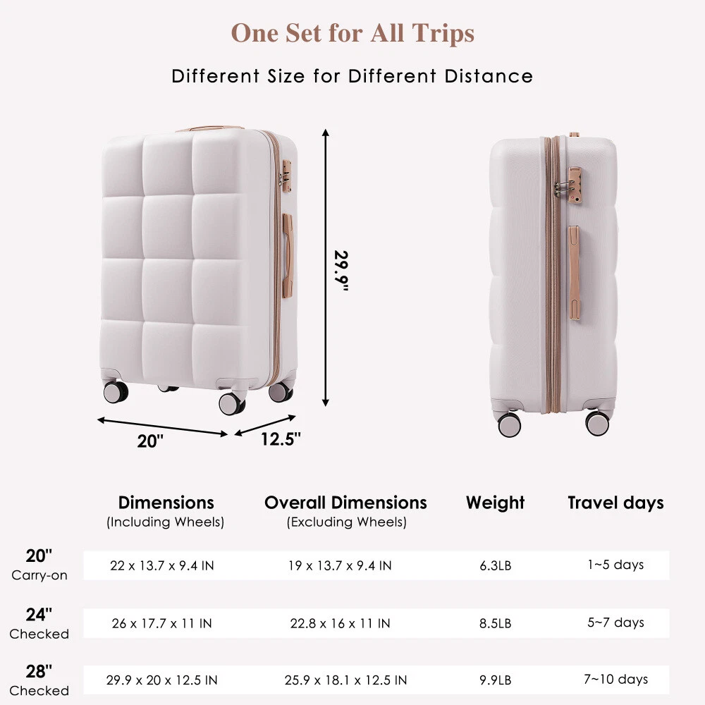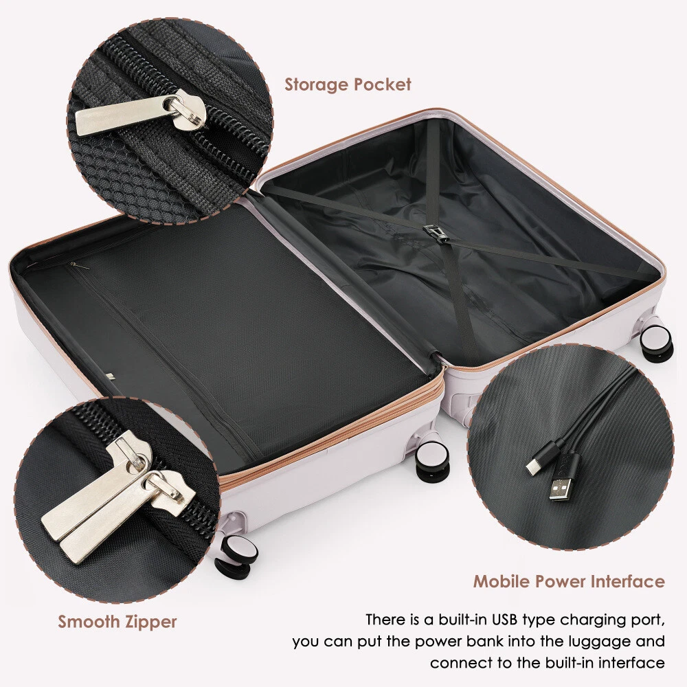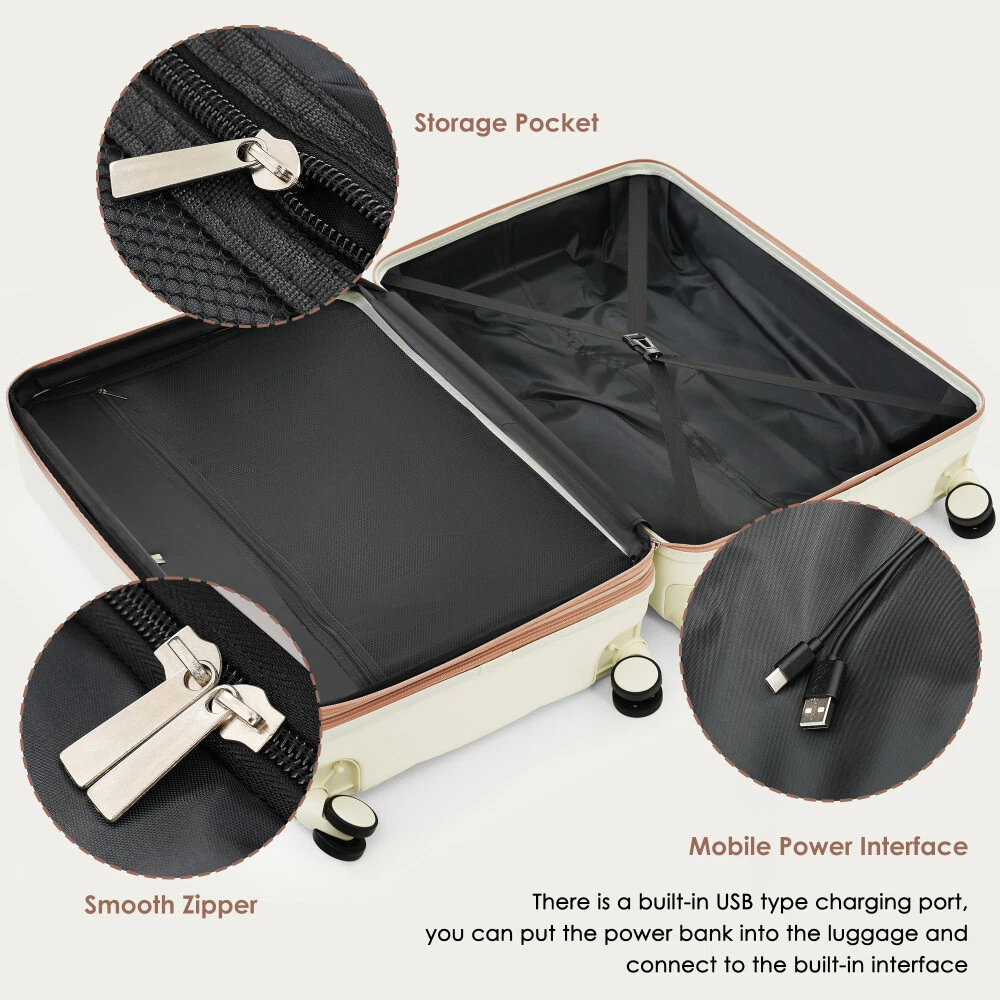Luggage Sets 4 Piece, 20-inch with USB Port, Expandable ABS Durable Suitcase with Travel Bag, Cup Holder, ABS Hard Shell Luggage with Spinner Wheels Product Features 【High Quality Luggage Sets】Made from extra strong ABS material, which is lightweight and extremely durable. Features textured finish to prevent against scratches,keeping lightweight luggage set beautiful trip after trip. 【3 Piece Luggage set】The 20" carry on suitcase features USB charging ports (Power bank not included), 24", 28 "are expandable, adding 25% space capacity for hardshell luggage. 【Easy Maneuvering】 4 360-degree rotating wheels make this suitcase as mobile as they get. Regardless of direction, these wheels allow your suitcase to stay upright while getting pushed, pulled and dragged in any direction. 【Side hooks】 Side hooks to reduce the burden on hands. 【Handy Packing】 Includes a spacious, highly functional interior with mesh pockets and elastic tie-down straps. Pack neatly and securely. 【Free Your Hands】 The newly designed cup holder is perfectly integrated into the structure of the spinner luggage, providing you with a convenient option to put your cup on the go without worrying about it tipping or slipping. 【Expandable weekender travel bag】 Made of polyester fabric, the bags are mild water-repellent with multiple pockets for organization.