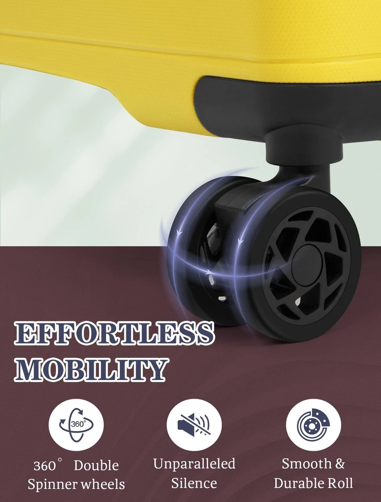 Description Luggage Sets 4 Piece, Suitcases with Wheels, PP Hard Case Luggage with Upgraded Shock-absorbing Spinner Wheel&TSA Lock, Carry On Luggage Set 【4 Piece Luggage Set】Luggage sets include a 24-inch large suitcase, 20-inch carry on luggage, extended duffel bag, and a toiletry bag. The duffel bag features a back sleeve so you can conveniently attach it to the retractable luggage handle. 【High-quality PP Material】PP luggage sets feature high-quality PP material, known for its recyclability and environmental friendliness compared to ABS. The PP luggage boasts superior resistance to extreme temperatures, increased impact resistance, and a reduced risk of cracking, making it a durable and sustainable choice for travelers. 【TSA Lock & YKK Zipper 】luggage sets are equipped with premium features, including a mounted TSA-approved lock for enhanced security and a fully-lined interior divider with organization pockets to keep belongings neat. The reinforced and upgraded YKK zippers effectively prevent splitting, ensuring reliable and secure travel for your valuables. 【Upgraded Shock-absorbing Wheel】 Enjoy silent and smooth mobility with our luggage's 360° double spinner wheels. Equipped with 8 high-quality, shock-absorbing wheels, this design ensures quiet and smooth travel. The double wheel configuration enhances durability and provides superior directional control for effortless maneuverability in any direction. 【Full Aluminum Telescopic Handle】Hard shell suitcases feature an ergonomic 3-stage retractable trolley with TPU handles on the top and sides, making it effective for a variety of occasions