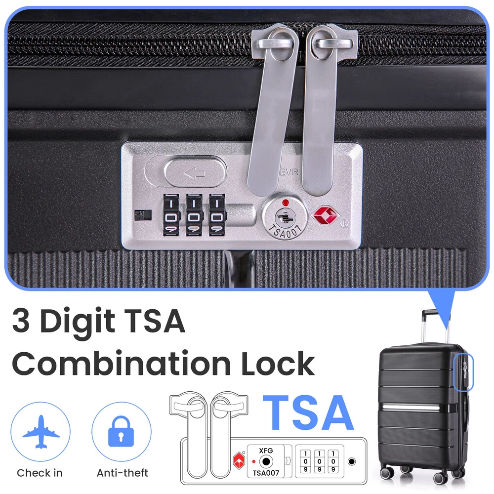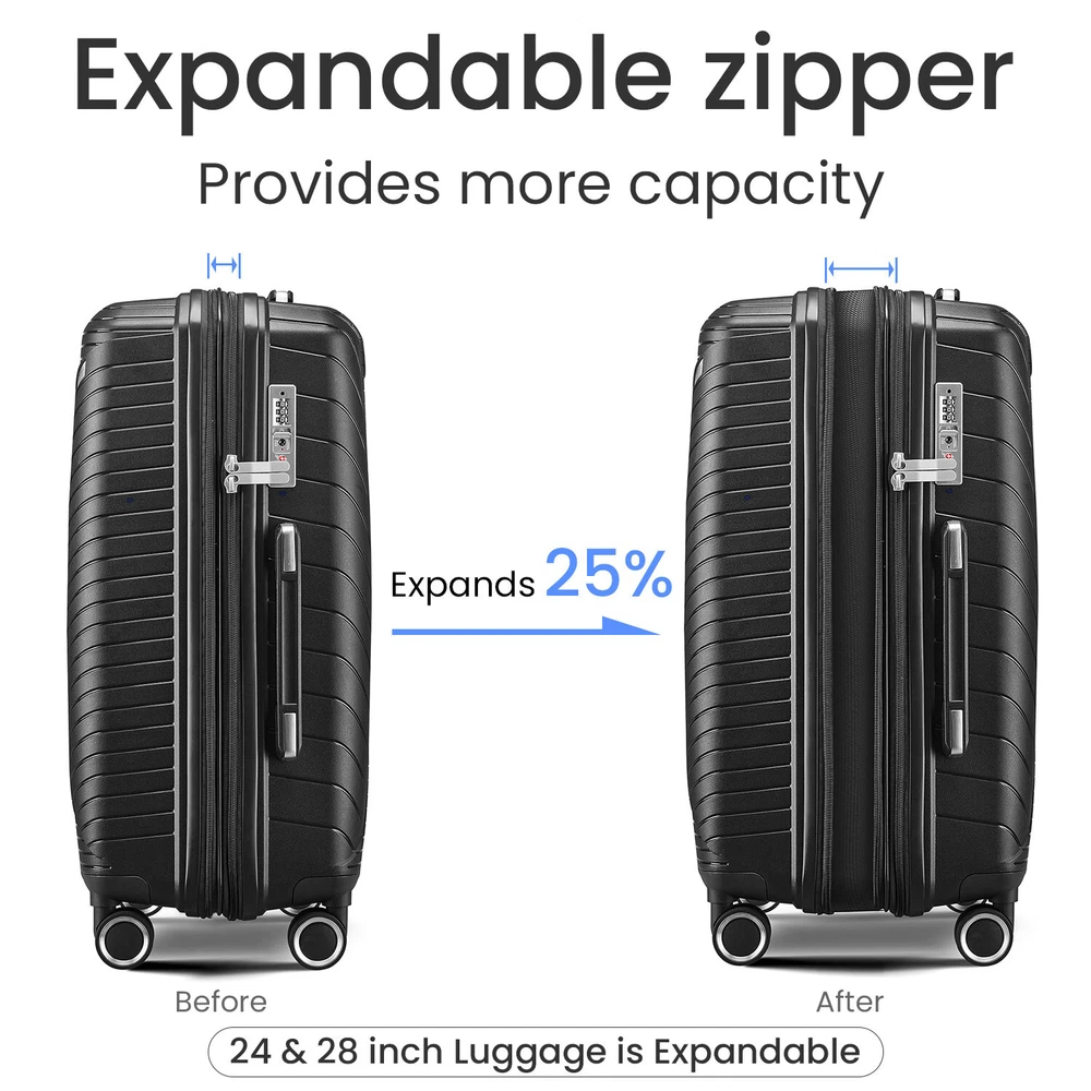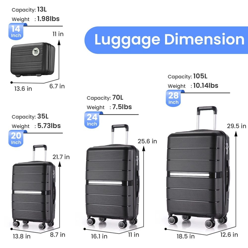 Specification Product Information Item Code:W2098126455 Product Type:General Item Product Name:Luggage Sets 4 Piece(14/20/24/28) PP Lightweight & Durable Expandable suitcase Place of Origin:China Main Color:Black Main Material:Polypropylene Product Dimensions Assembled Length (in.):18.30 Assembled Width (in.):10.80 Assembled Height (in.):29.00 Weight (lbs.):24.00 Package Size Length (in.):19.30 Width (in.):11.80 Height (in.):30.00 Weight (lbs.):26.50 Product Features Top quality luggage sets, PC material for hardshell, which makes the luggage more durable, lighter and impact-resistant. 21in is best for carry on, 29in expands 20% for more spaces. Organized and Spacious Interior. The fully lined luggage includes a handy divider and an interior organizer with zippered pocket for smaller items. Organized and Spacious Interior. The fully lined luggage includes a handy divider and an interior organizer with zippered pocket for smaller items. Adjustable 3-level aluminum telescoping handle allows you to quickly maneuver in tight spaces and it's sturdier than most of the telescoping handle on the market. The top/side soft reinforced grip handles for easy carrying when in a hurry, or it can be really handy when lifting the suitcase with heavy weight. Side-mounted TSA LOCK with smooth YKK zipper act to deter theft, ensuring that only you or a TSA agent have easy access to your belongings when traveling, added security and convenience. Multi-directional spinner wheels to provide 360° effortless mobility and ease on traveler's wrist, re-engineered lightweight. Description