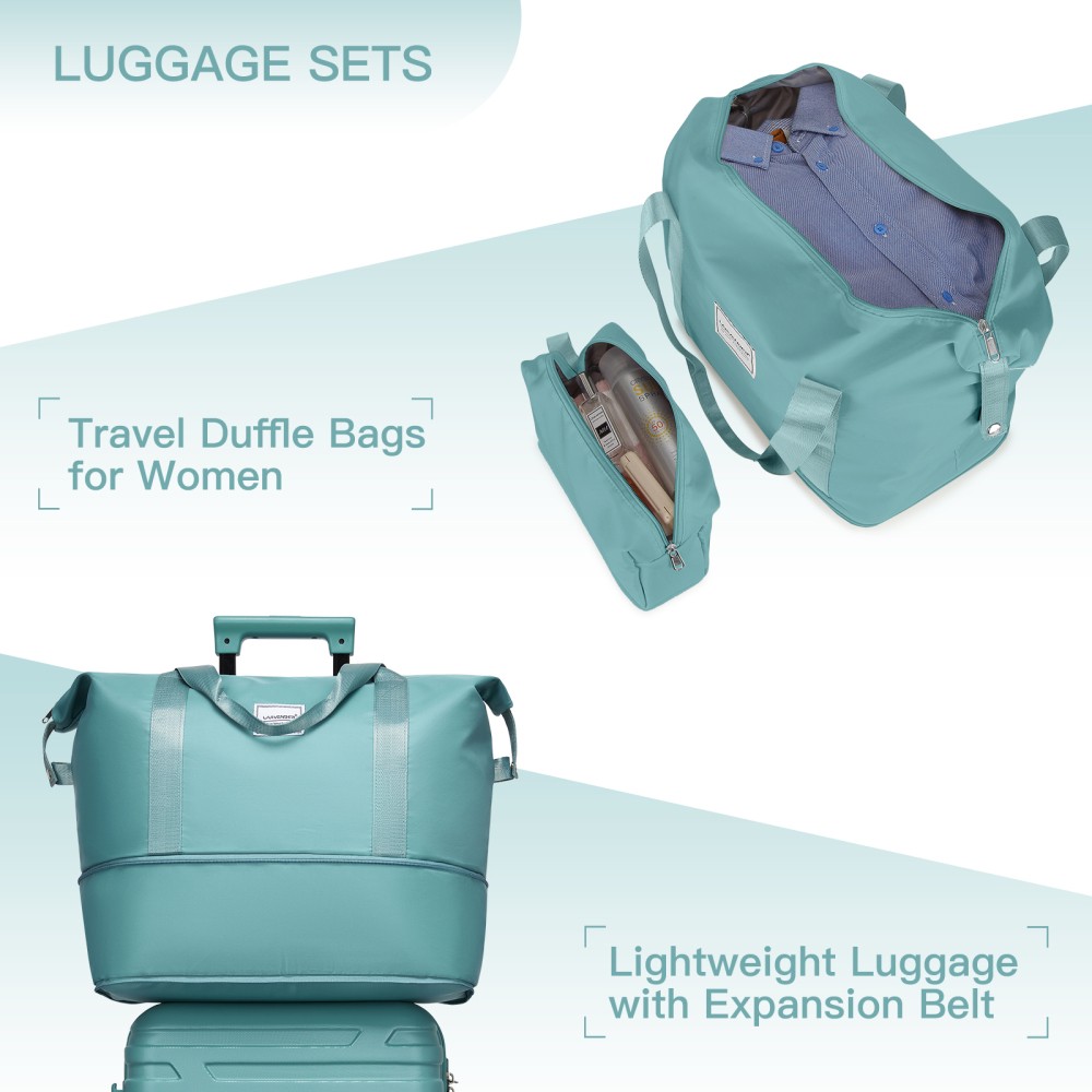 6-Piece Hardside Expandable Luggage Set with Spinner Wheels & Duffel Bags - Aqua Blue Take the stress out of travel with this 6-piece expandable luggage set in a sleek aqua blue finish—your all-in-one solution for weekend getaways, family vacations, or business trips. Designed for both style and practicality, this set caters to all your packing needs while standing out in the busiest baggage claims. Complete 6-Piece Travel Solution This versatile set includes everything you need for seamless travel: 18" and 20" carry-on suitcases, a 24" checked suitcase, a 28" large luggage, a roomy weekender duffel bag, and a compact toiletry bag. Every hardside suitcase features a smooth, durable expandable zipper that boosts capacity by 25% —perfect for fitting souvenirs or extra essentials on your return journey. Premium Durable Hardshell Construction Crafted from high-impact ABS material with an advanced scratch-resistant coating, these suitcases are built to withstand the rough handling of airports and road trips. The unique ribbed geometric texture not only adds a modern touch but also makes your luggage instantly recognizable, so you can spot it at a glance in crowded baggage claims. Secure & Hassle-Free Travel Each hardside suitcase comes equipped with a built-in combination lock, keeping your belongings safe and your privacy protected throughout your trip. The heavy-duty zippers are resistant to piercing from sharp tools like pens, adding an extra layer of security for your valuables. Multi-Functional Weekender & Toiletry Bags The included weekender duffel bag and toiletry bag are made from water-resistant polyester fabric, ideal for keeping your items dry in unexpected weather. The duffel bag features a convenient back sleeve that slides easily over the retractable luggage handle, eliminating the hassle of carrying multiple bags at once. Perfect Fit for Every Journey Assembled Dimensions : 18.00"L × 12.00"W × 29.50"H Product Weight : 28.00 lbs Package Dimensions : 18.50"L × 12.50"W × 30.00"H Package Weight : 30.00 lbs Our Reliable Guarantee 1-Year Warranty : We back the quality of this luggage set with a 1-year warranty against manufacturing defects, so you can travel with total peace of mind. 30-Day Free Return & Exchange : Not satisfied with your purchase? Enjoy a hassle-free 30-day free return and exchange policy, no questions asked.