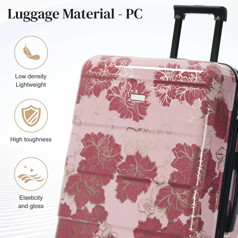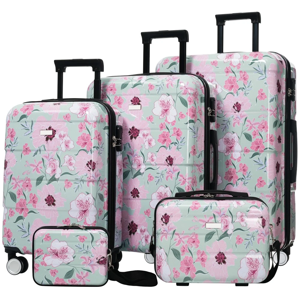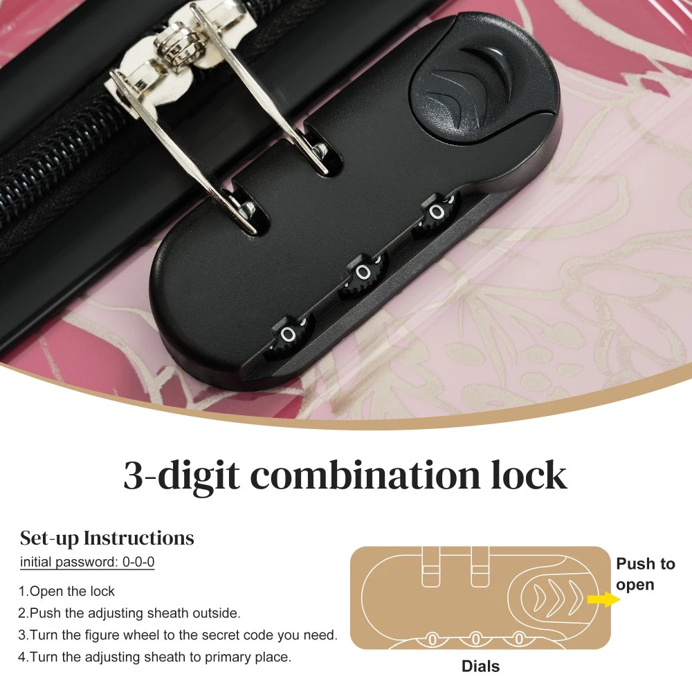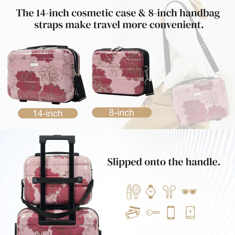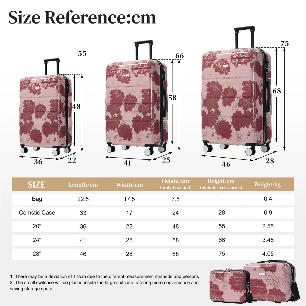 5PCS Luggage Set, PC+ABS Hardside Lightweight Suitcase with Cosmetic Case, Handbag, Spinner Wheels & Lock, Pink Flower (8"14"20"24"28") Elevate your travel experience with this stylish and practical 5-piece luggage set! Adorned with a vibrant pink flower print, this set blends summery charm with exceptional functionality, making you a fashion standout wherever you go. It includes all the travel essentials you need for different trips, from short getaways to long vacations, perfectly meeting your diverse travel demands. Complete 5-Piece Set for All Travel Needs : This set comes with 5 essential pieces: an 8" handbag, a 14" cosmetic case, and 20", 24", 28" suitcases. Whether you're heading for a weekend trip (20" carry-on size), a business trip (24" medium size), or a long vacation (28" large size), this one set has you covered. The handbag and cosmetic case are ideal for storing personal items and beauty essentials, keeping your belongings organized and easily accessible. Durable PC+ABS Hardside Construction : Crafted from high-tenacity PC+ABS material, these suitcases are harder and more pressure-resistant, effectively reducing damage caused by collisions during travel. The hardside design not only provides reliable protection for your belongings but also ensures long-lasting durability, making the set suitable for frequent travel use. Lightweight construction also eases the burden of carrying and transportation. Protective Film for Scratch Prevention : Each suitcase is covered with a protective film that can be removed before first use. This film effectively prevents scratches and bumps during shipping and transportation, ensuring your new luggage arrives in perfect condition and maintains its sleek appearance for a long time. Safe & Secure Design : Equipped with a side-mounted digital combination lock, the suitcases eliminate the trouble of losing or forgetting keys. You can set a personalized password to keep your belongings safe and protect your privacy. Additionally, the high-quality zippers are not easy to be pierced by sharp tools, providing an extra layer of security for your valuables. Easy to Carry & Maneuver : The suitcases feature soft silicone handles, making it easier to lift them when going up and down stairs or loading/unloading. The sturdy 3-step telescoping handle allows for effortless maneuvering in tight spaces like airports or train stations. Moreover, both the handbag and cosmetic case come with shoulder straps, enabling crossbody wear for hands-free convenience during travel. How to Set the Combination Lock : 1. Open the lock (the default combination is 0-0-0). 2. Push the adjusting sheath in the direction of the arrow. 3. Turn the number wheels to set your desired secret code (don't forget it!). 4. Turn the adjusting sheath back to its original position. Your personalized combination will then take effect. Key Product Specifications : Color: Pink Flower; Material: PC+ABS; Product Type: 5-Piece Luggage Set; Included Pieces: 8" Handbag, 14" Cosmetic Case, 20" Suitcase, 24" Suitcase, 28" Suitcase; Assembled Dimensions (28" Suitcase): 18.10"L × 11.00"W × 29.50"H; Overall Product Weight: 24.97 LBS; Package Dimensions: 30.31"L × 19.88"W × 11.61"H; Package Weight: 27.89 LBS. Worry-Free Purchase Guarantee : We stand behind the quality of this 5-piece luggage set with a 1-Year Warranty. If you’re not completely satisfied with your purchase for any reason, we offer a 30-Day Free Return & Exchange Policy. Shop with confidence, knowing you’re getting a stylish, durable, and functional travel companion!