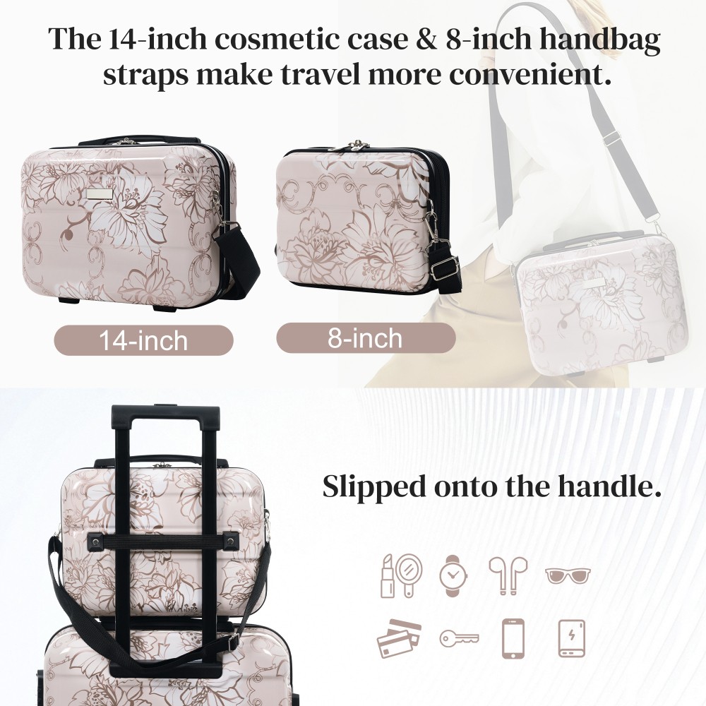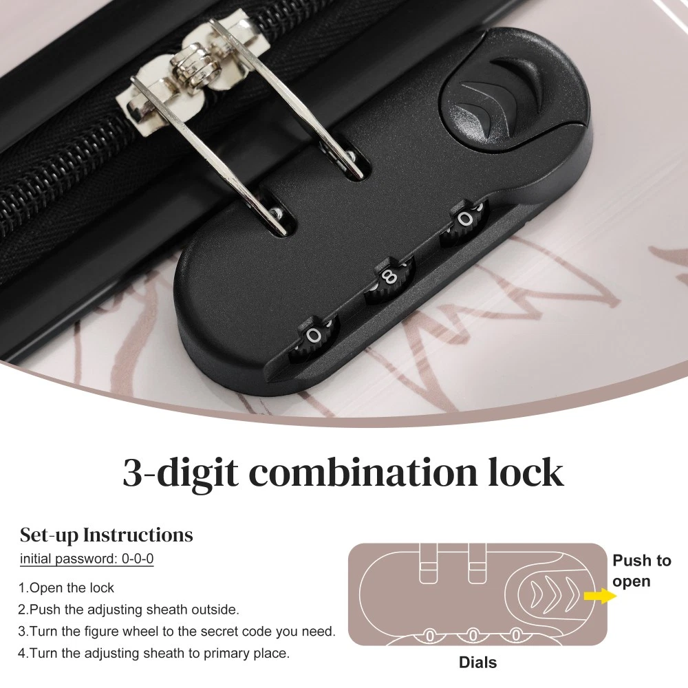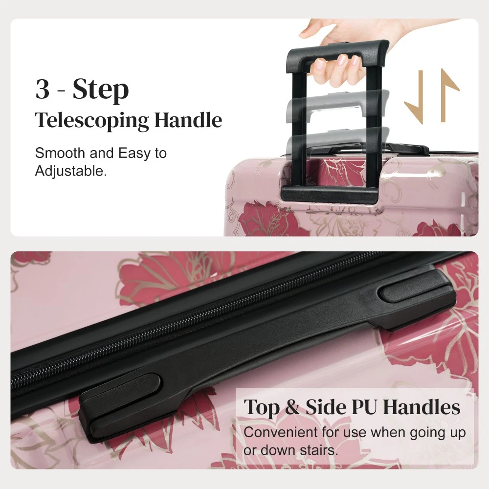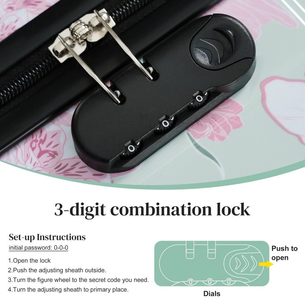 5PCS Luggage Set, PC+ABS Hardside Lightweight Suitcase with Cosmetic Case, Handbag, Spinner Wheels & Lock, Pink Flower (8"14"20"24"28") Elevate your travel experience with this stylish and practical 5-piece luggage set! Adorned with a vibrant pink flower print, this set blends summery charm with exceptional functionality, making you a fashion standout wherever you go. It includes all the travel essentials you need for different trips, from short getaways to long vacations, perfectly meeting your diverse travel demands. Complete 5-Piece Set for All Travel Needs : This set comes with 5 essential pieces: an 8" handbag, a 14" cosmetic case, and 20", 24", 28" suitcases. Whether you're heading for a weekend trip (20" carry-on size), a business trip (24" medium size), or a long vacation (28" large size), this one set has you covered. The handbag and cosmetic case are ideal for storing personal items and beauty essentials, keeping your belongings organized and easily accessible. Durable PC+ABS Hardside Construction : Crafted from high-tenacity PC+ABS material, these suitcases are harder and more pressure-resistant, effectively reducing damage caused by collisions during travel. The hardside design not only provides reliable protection for your belongings but also ensures long-lasting durability, making the set suitable for frequent travel use. Lightweight construction also eases the burden of carrying and transportation. Protective Film for Scratch Prevention : Each suitcase is covered with a protective film that can be removed before first use. This film effectively prevents scratches and bumps during shipping and transportation, ensuring your new luggage arrives in perfect condition and maintains its sleek appearance for a long time. Safe & Secure Design : Equipped with a side-mounted digital combination lock, the suitcases eliminate the trouble of losing or forgetting keys. You can set a personalized password to keep your belongings safe and protect your privacy. Additionally, the high-quality zippers are not easy to be pierced by sharp tools, providing an extra layer of security for your valuables. Easy to Carry & Maneuver : The suitcases feature soft silicone handles, making it easier to lift them when going up and down stairs or loading/unloading. The sturdy 3-step telescoping handle allows for effortless maneuvering in tight spaces like airports or train stations. Moreover, both the handbag and cosmetic case come with shoulder straps, enabling crossbody wear for hands-free convenience during travel. How to Set the Combination Lock : 1. Open the lock (the default combination is 0-0-0). 2. Push the adjusting sheath in the direction of the arrow. 3. Turn the number wheels to set your desired secret code (don't forget it!). 4. Turn the adjusting sheath back to its original position. Your personalized combination will then take effect. Key Product Specifications : Color: Pink Flower; Material: PC+ABS; Product Type: 5-Piece Luggage Set; Included Pieces: 8" Handbag, 14" Cosmetic Case, 20" Suitcase, 24" Suitcase, 28" Suitcase; Assembled Dimensions (28" Suitcase): 18.10"L × 11.00"W × 29.50"H; Overall Product Weight: 24.97 LBS; Package Dimensions: 30.31"L × 19.88"W × 11.61"H; Package Weight: 27.89 LBS. Worry-Free Purchase Guarantee : We stand behind the quality of this 5-piece luggage set with a 1-Year Warranty. If you’re not completely satisfied with your purchase for any reason, we offer a 30-Day Free Return & Exchange Policy. Shop with confidence, knowing you’re getting a stylish, durable, and functional travel companion!