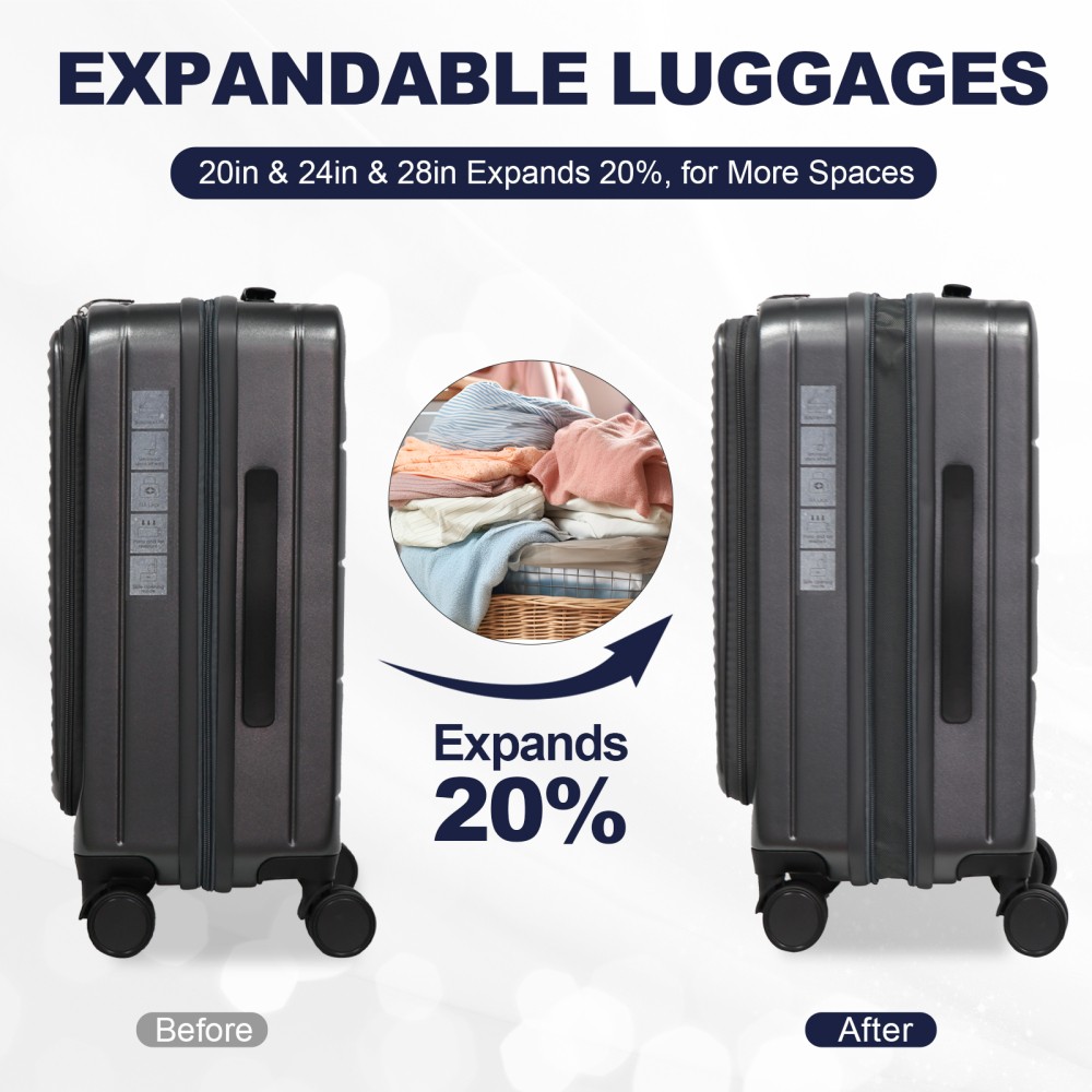 3-Piece Hard Shell Luggage Set ( 20", 24", 28" ): Versatile Sizes: The 20" carry-on includes a front lid with a laptop compartment and mesh pockets for easy access. The 24" and 28" suitcases offer larger capacities with front-opening lids. All sizes expand by 20% for extra storage. Ergonomic Handle: Adjustable 3-step aluminum telescopic handle fits different heights. Secure Design: Features explosion-proof zippers and a TSA combination lock for added security and smooth customs inspections.