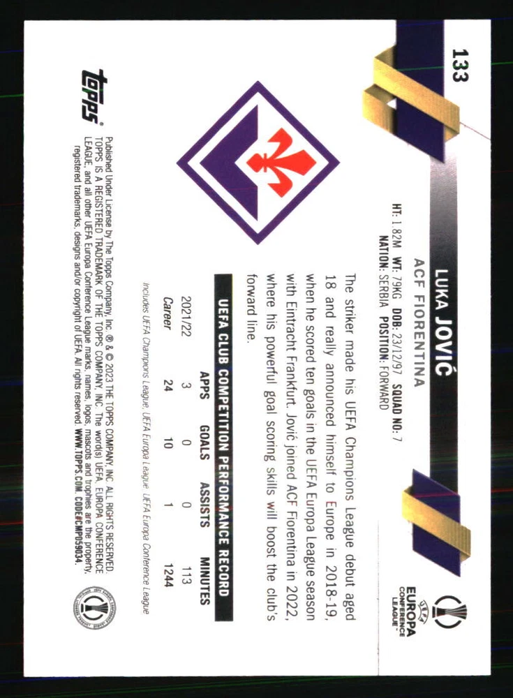 Season: 2022 Player|Athlete: Luka Jović Card Number: 133 Type: Sports Trading Card Team: ACF Fiorentina Year Manufactured: 2022 Sport: SOCCER Manufacturer: Topps Autographed: No Set: 2022-23 Topps UEFA Club Competitions 1st Edition Graded: No
