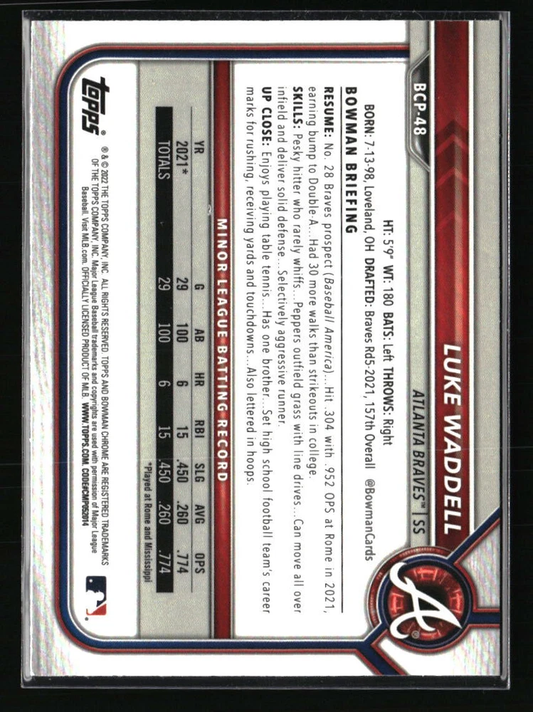 Features: FBC Sport: Baseball Autographed: No Year Manufactured: 2022 Type: Sports Trading Card Player/Athlete: Luke Waddell Card Number: BCP-48 League: MLB Season: 2022 Graded: No Manufacturer: Bowman Set: Bowman Parallel/Variety: Chrome Prospects Mojo Refractor Team: Atlanta Braves