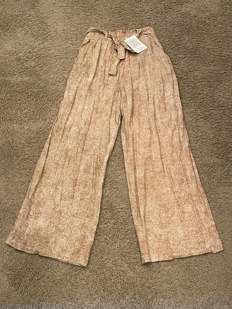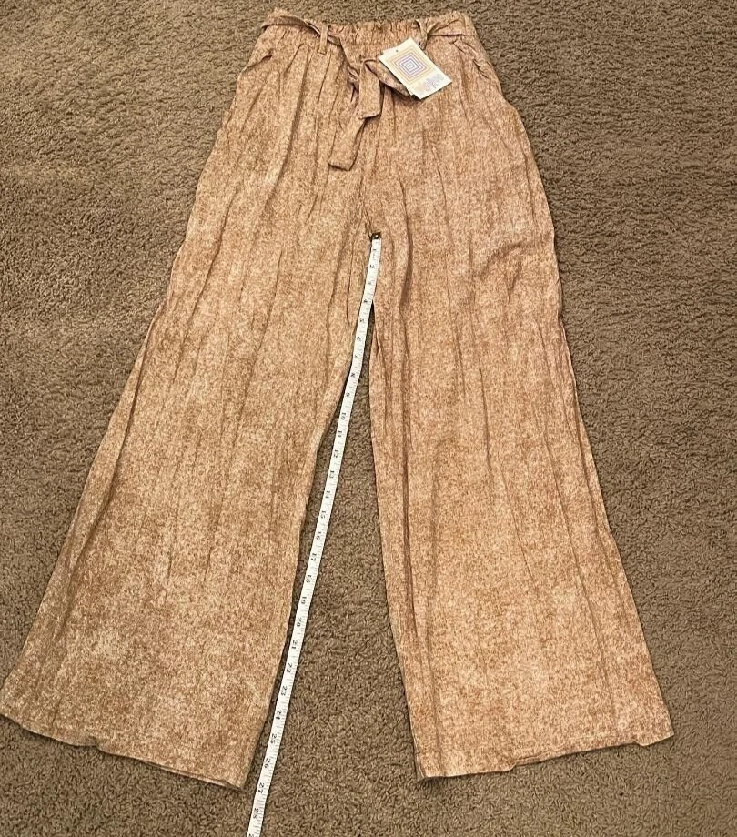 Experience effortless style with these LulaRoe tan palazzo pants, designed for those who appreciate a blend of comfort and chic. The wide-leg silhouette lends an air of bohemian grace, perfect for casual outings or your next beach getaway. With a mid-rise waist and an elastic waistband, these pants offer a snug, yet comfortable fit that flatters the figure and makes on-the-go dressing a breeze. Crafted from a soft mix of rayon and spandex, the fabric provides a gentle stretch, ensuring freedom of movement throughout your day. The pull-on style eliminates the need for cumbersome zippers or buttons, making them an ideal choice for travel. Accented with a faux sash tie belt that adds a touch of elegance, these pants embody relaxed elegance and are a versatile addition to any wardrobe. Note: Waist will stretch to a 28.