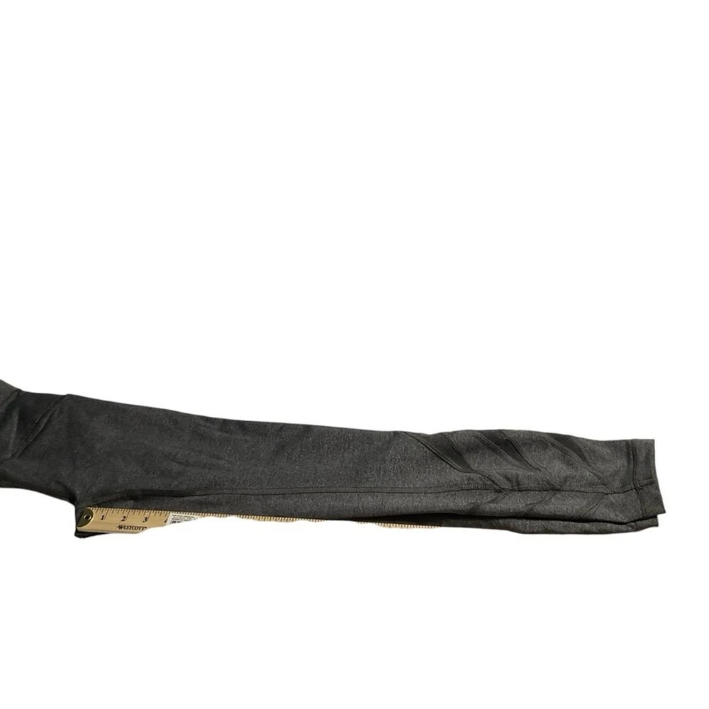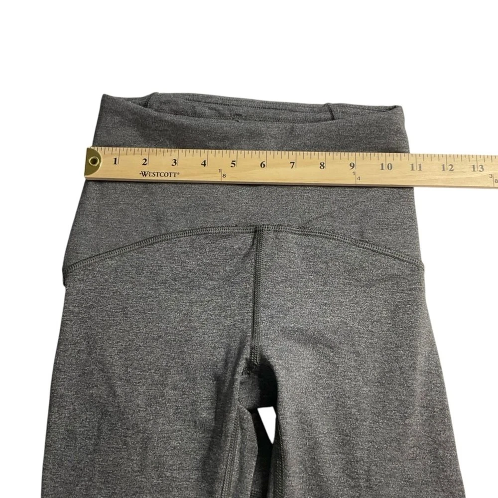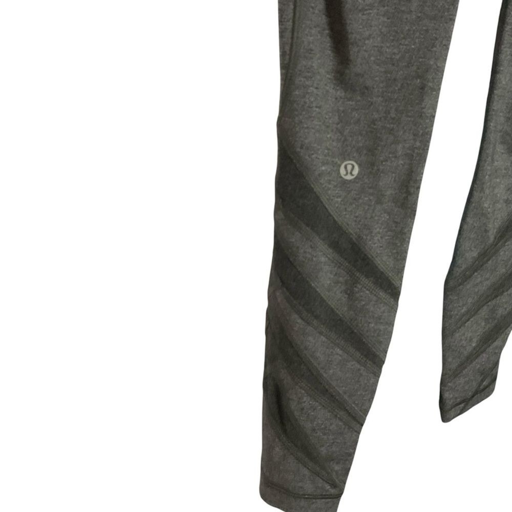 Lululemon Women's Gray Motionful 7/8 Leggings with Mesh Cut Outs Size 2 Features: 7/8 Ankle Length Mesh Cut Outs on Bottom of Legs. Inside Zippered Back Pocket Approx. Measurements flat: 11" waist 9" rise 24" inseam Good pre-owned condition: small stain on leg. See photos for condition details.
