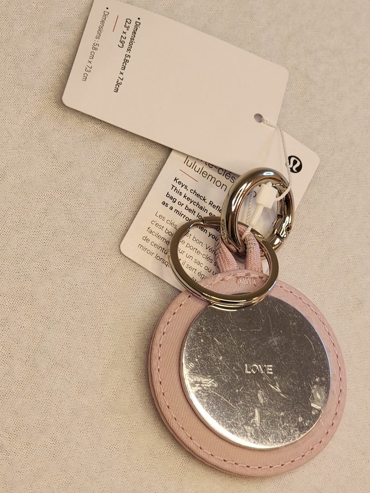 Still has plastic cover and tags. Lululemon NWT Keychain Charm Logo Pink/Silver Round