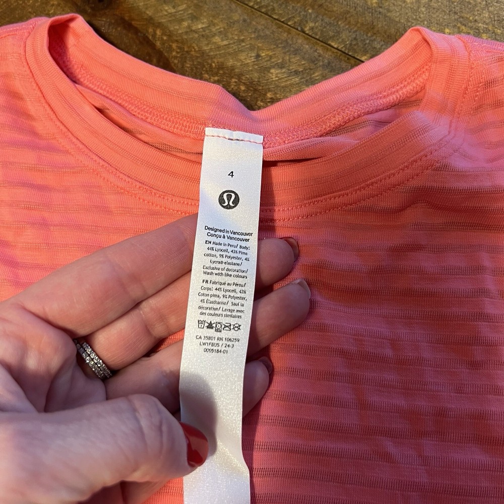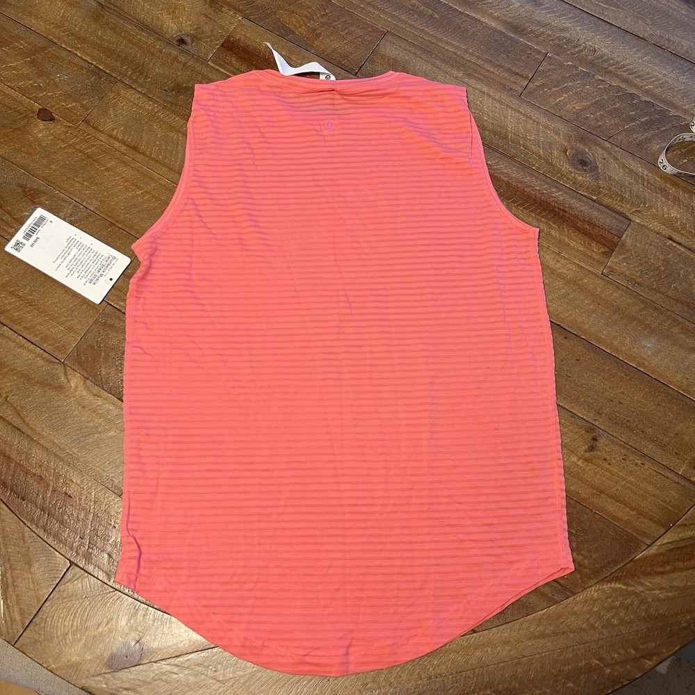 This Lululemon Brunswick Muscle Tank is a sleeveless activewear top in a pink color with sheer striped pattern. Made of a blend of polyester, Lycra, Lyocell, and cotton, it features a round neckline and a pullover closure for easy wearing. The tank is designed with an athletic fit and is suitable for various activities like tennis, cycling, yoga, and more. With its colorful and preppy style, this top is perfect for adding a touch of sporty flair to your workout wardrobe.