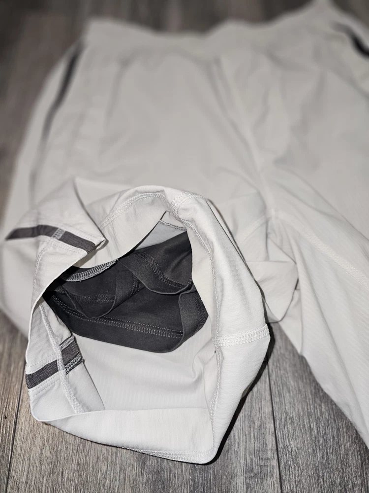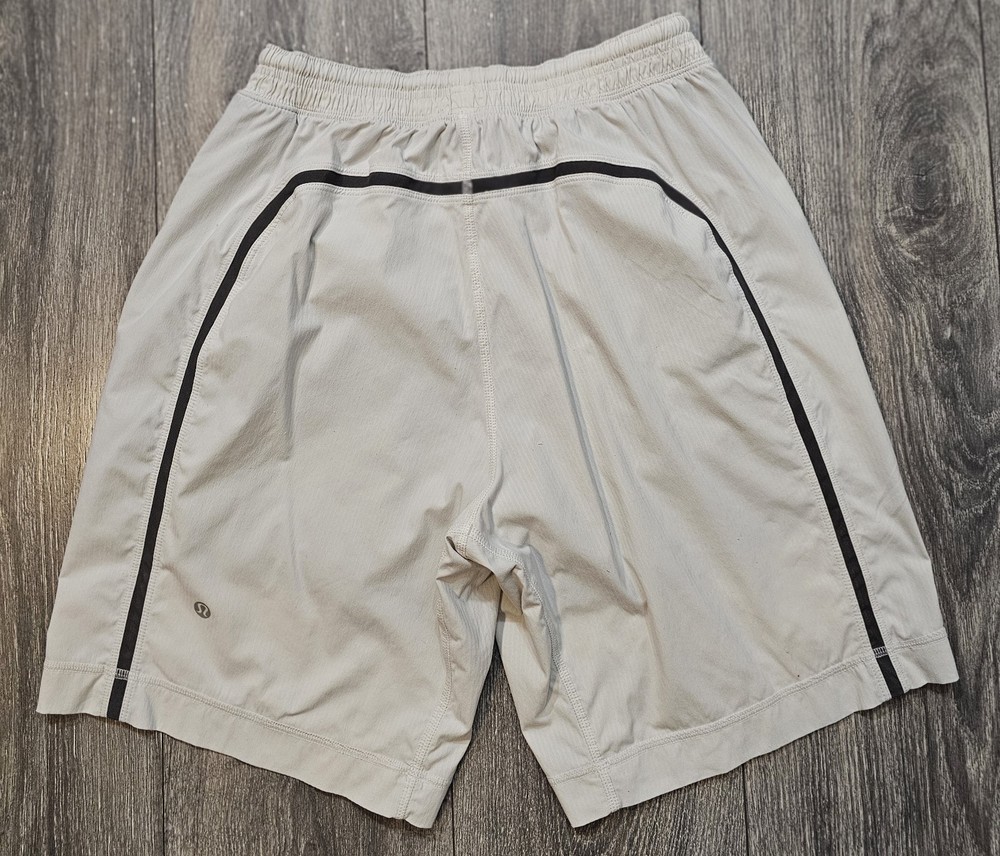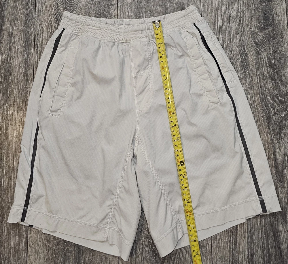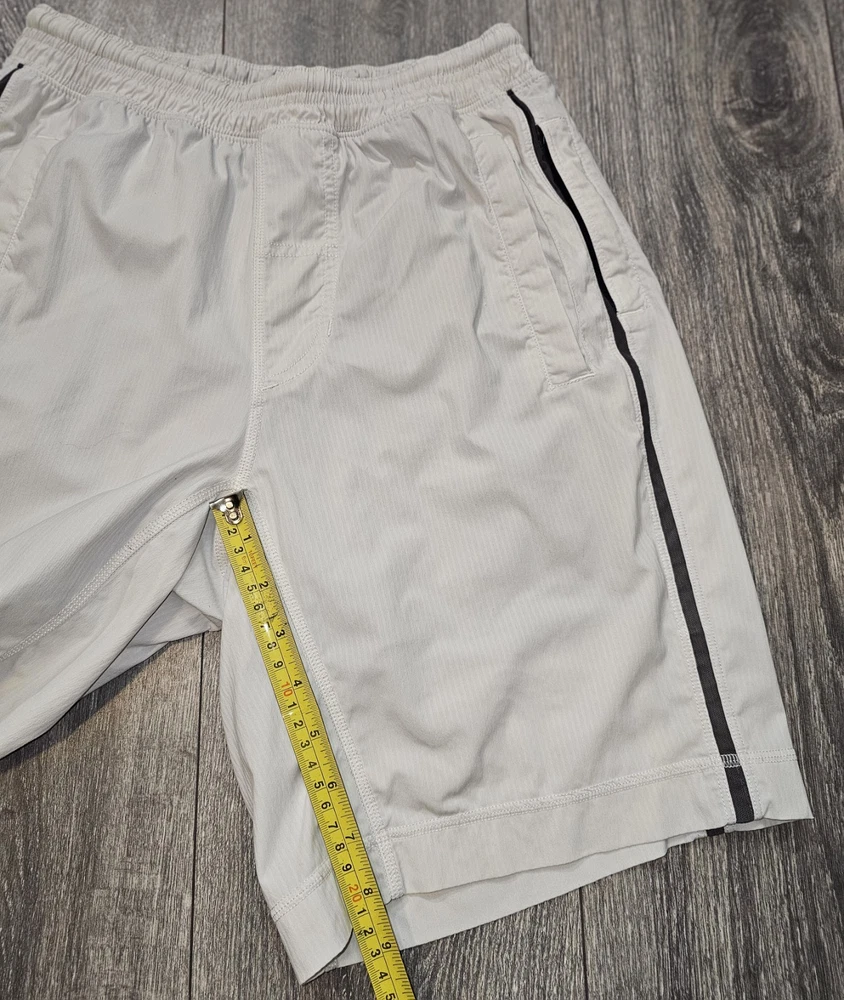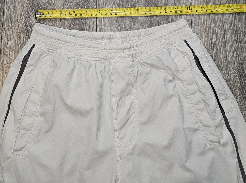 The product is a pair of Lululemon athletic running shorts in a size small, featuring an elastic drawstring closure, side zipper pocket, and a solid gray color. Made from a polyester blend fabric, these shorts have an 8-inch inseam and are designed for activities like gym training, cross-training, and running. The athletic style and fit make them suitable for outdoor, athleisure, preppy, and sports-themed occasions during the summer, fall, and spring seasons. The brand Lululemon is known for its high-quality activewear, catering to men who prioritize comfort and performance in their athletic outfits.