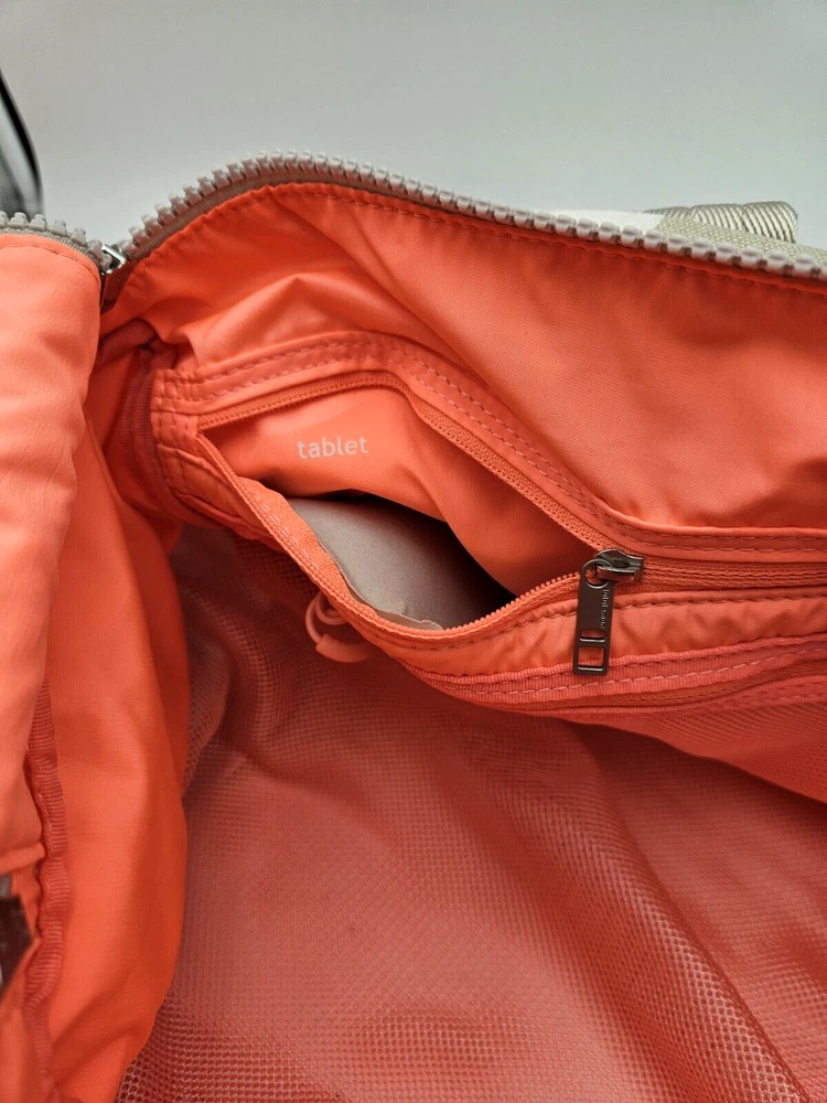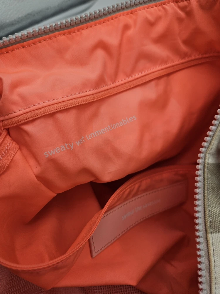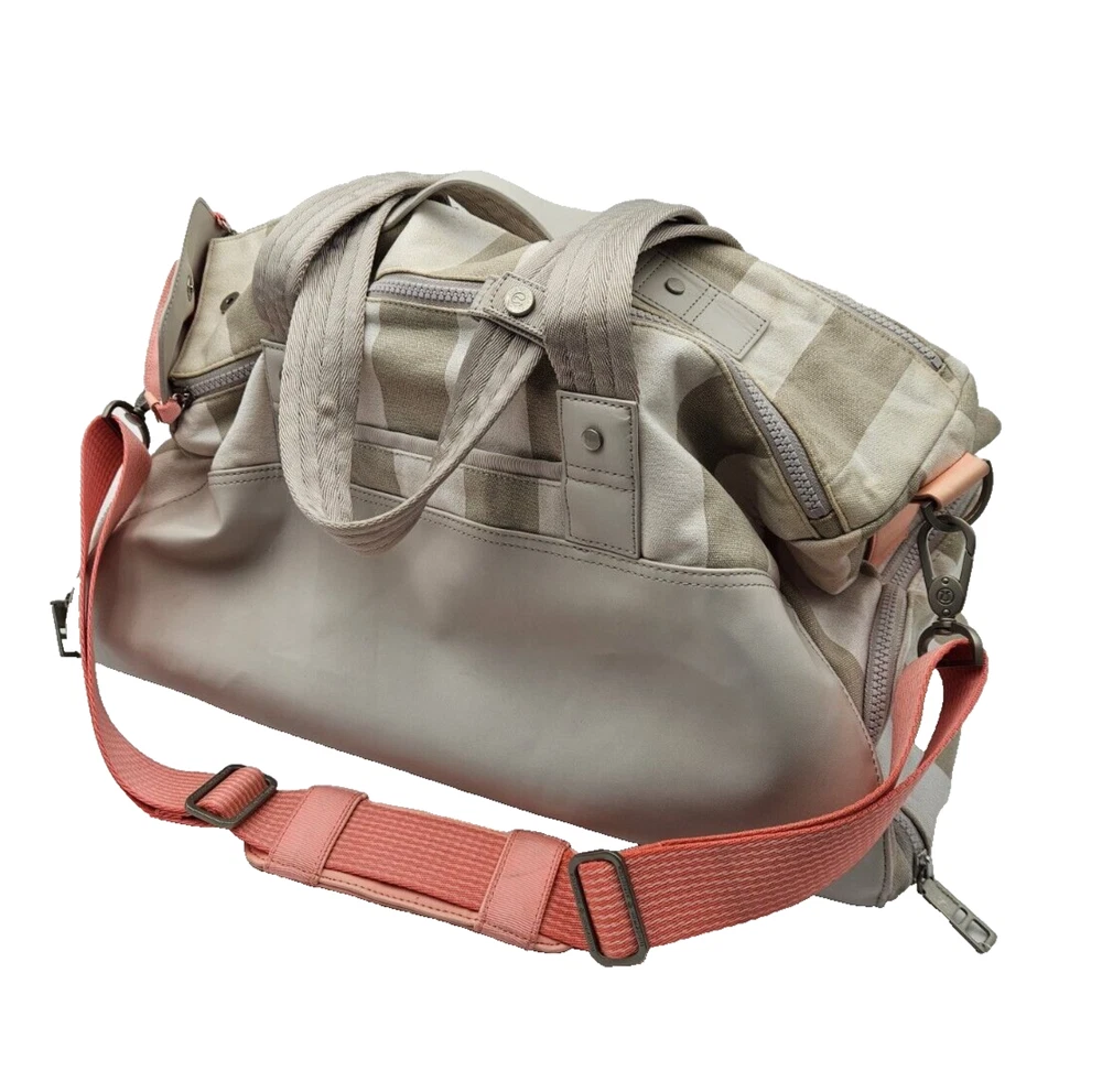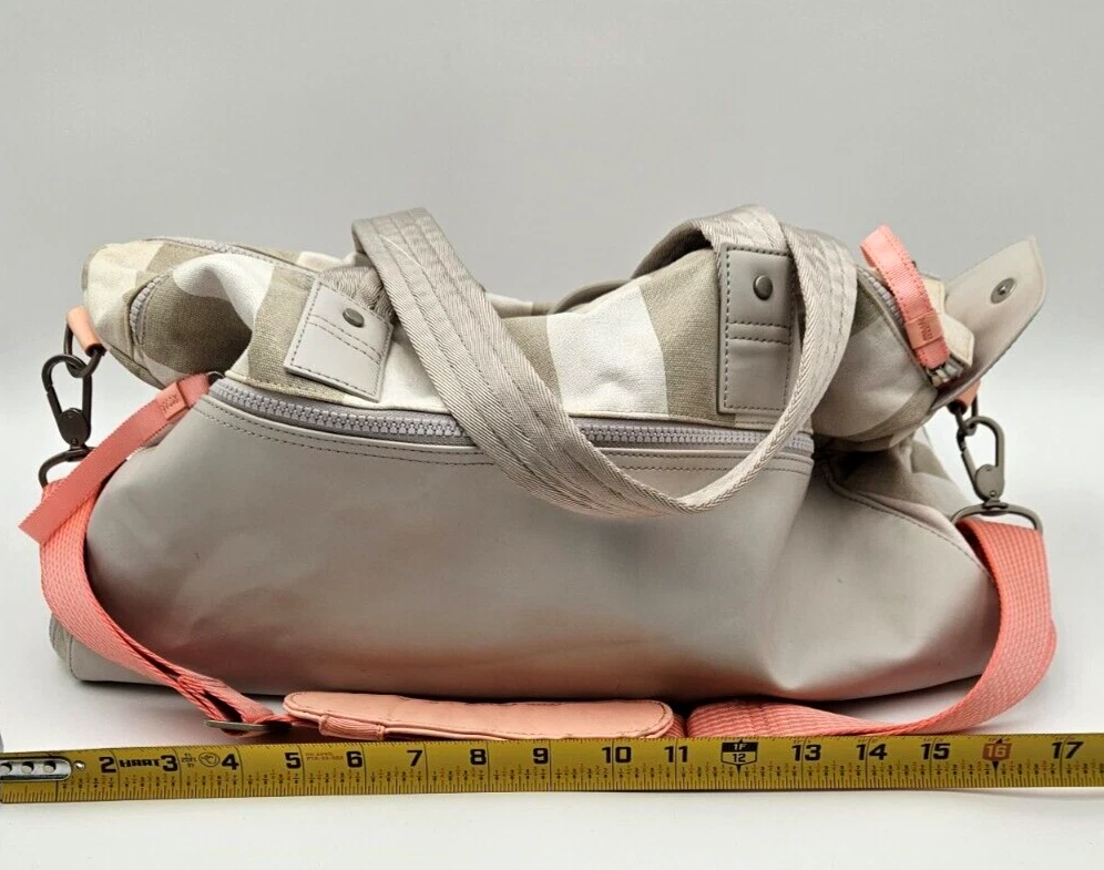 This Lululemon Bag is perfect for travel or any gym or training session. With a convenient zip closure, it's easy to store all your essentials. Has shoe storage. The bag is made of durable nylon, canvas, and leather materials, ensuring it can withstand the wear and tear of daily use. The medium-sized bag features a stylish beige and pink color combination and has a height of 11 inches, length of 18 inches, and depth of 10 inches. It's designed to cater to the needs of women and is ideal for storing gym clothes, tablets, shoes, and other accessories. Whether you're heading out for a workout or need a bag for the weekend, this Lululemon Athletic bag is the perfect choice.