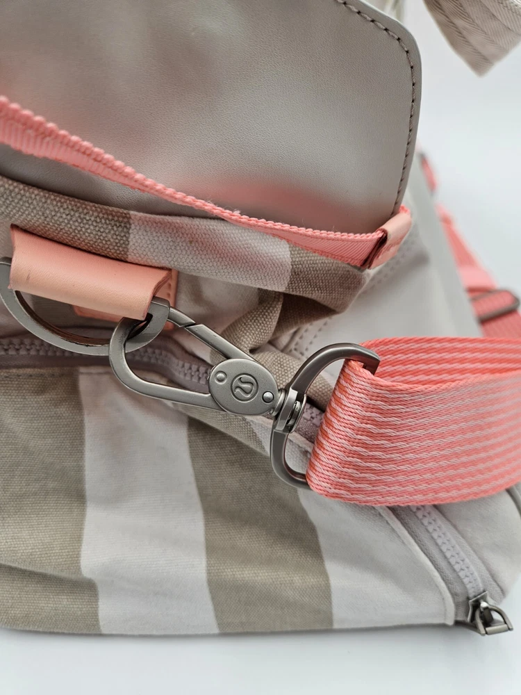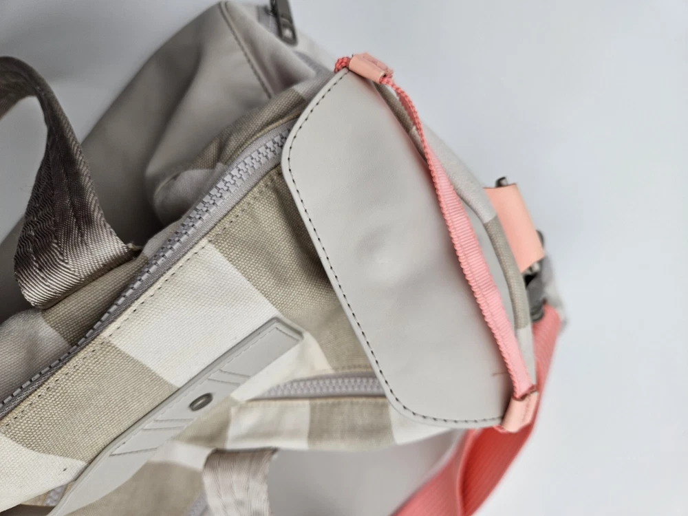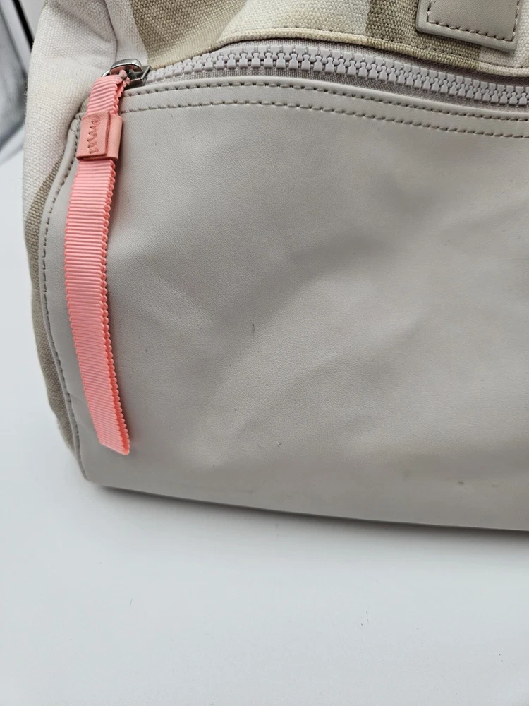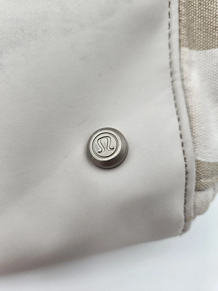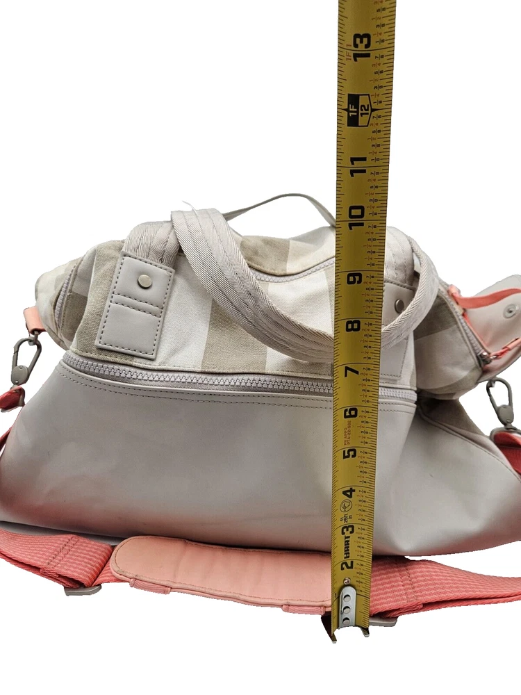 This Lululemon Bag is perfect for travel or any gym or training session. With a convenient zip closure, it's easy to store all your essentials. Has shoe storage. The bag is made of durable nylon, canvas, and leather materials, ensuring it can withstand the wear and tear of daily use. The medium-sized bag features a stylish beige and pink color combination and has a height of 11 inches, length of 18 inches, and depth of 10 inches. It's designed to cater to the needs of women and is ideal for storing gym clothes, tablets, shoes, and other accessories. Whether you're heading out for a workout or need a bag for the weekend, this Lululemon Athletic bag is the perfect choice.