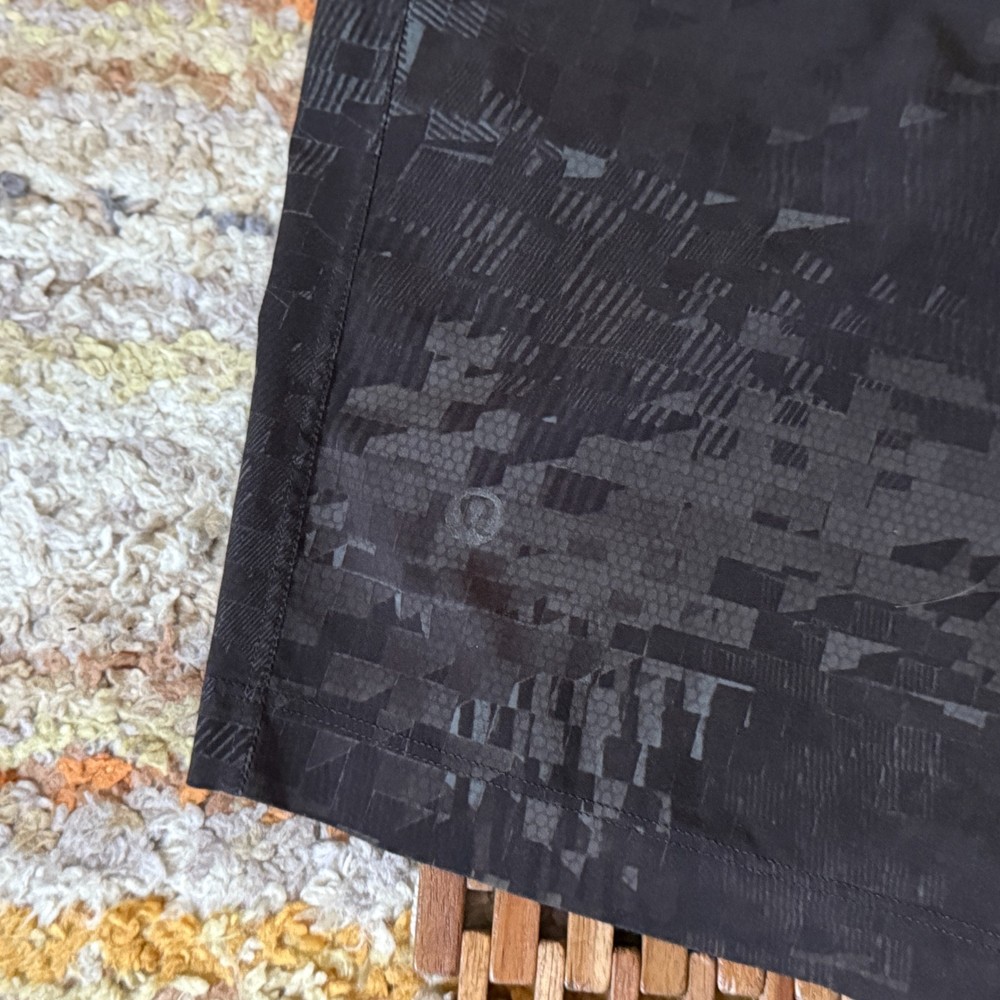 The Lululemon Camo Performance Stretch Shorts in Black, Men's Size Large, are perfect for active occasions such as gym workouts and training sessions. Made from a polyester blend fabric with a drawstring closure, these shorts offer a comfortable and stretchy fit. The camouflage pattern adds a stylish touch, while the machine washable design makes them easy to care for. Ideal for the summer and spring seasons, these athletic shorts from the trusted brand Lululemon are a great addition to any man's activewear collection.