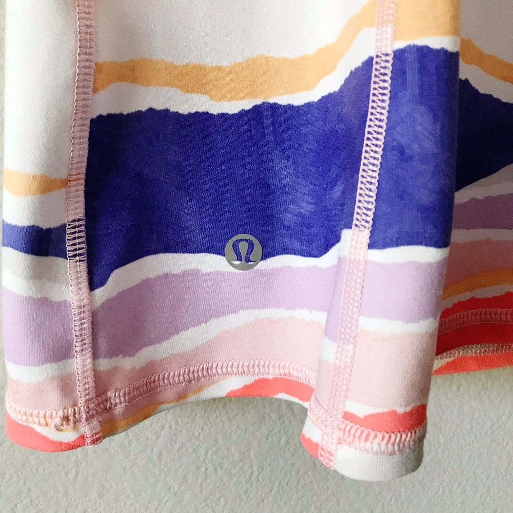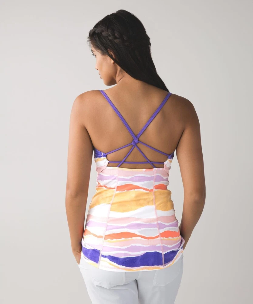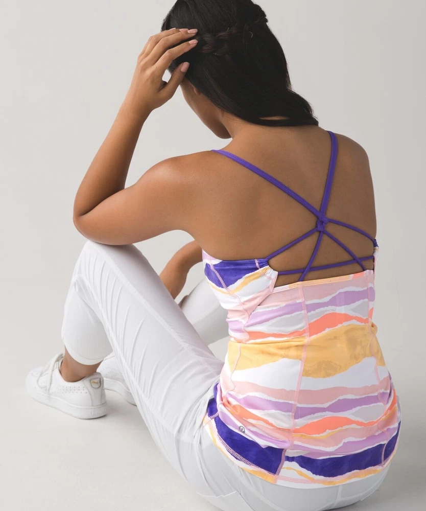 Lululemon Athletica Dancing Warrior Tank in Bleacher Stripe White Iris Flower/Iris Flower. Size 2 (see size dot). Luon fabric. Adjustable strappy back. Moisture wicking and breathable. Stretchy. Pockets for cups, but cups are not included. Retailed for $58. Pre-owned, excellent used condition.