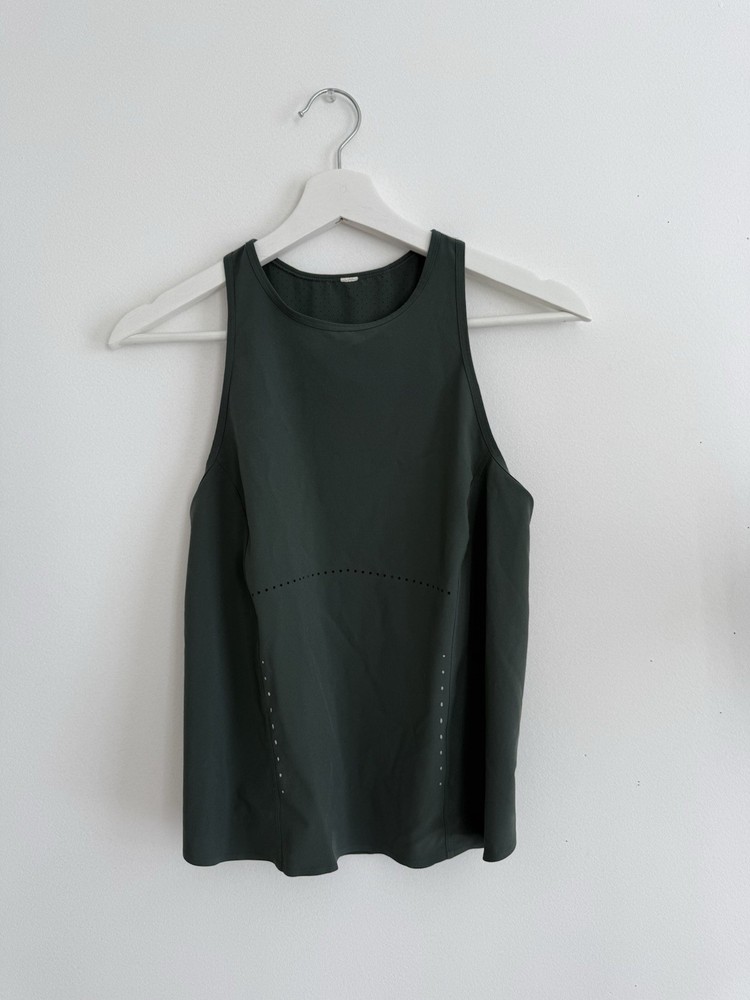 The Lululemon Dark Green Laser Cut Racerback Tank Top in size 4 is a stylish and functional activewear piece for women. Made from high-quality fabric with a dark wash, this tank is perfect for workouts and other active occasions. The racerback style offers extra support and comfort, while the vibrant green color adds a pop of color to your activewear collection. Whether you're hitting the gym or running errands, this tank is a versatile and chic addition to your wardrobe. Sleek and breathable Lululemon workout tank in deep olive green. Features laser-cut ventilation details, open back layering, and signature reflective logo. Lightweight, quick-drying fabric ideal for running, yoga, or training. Excellent pre-owned condition, size estimated as 4