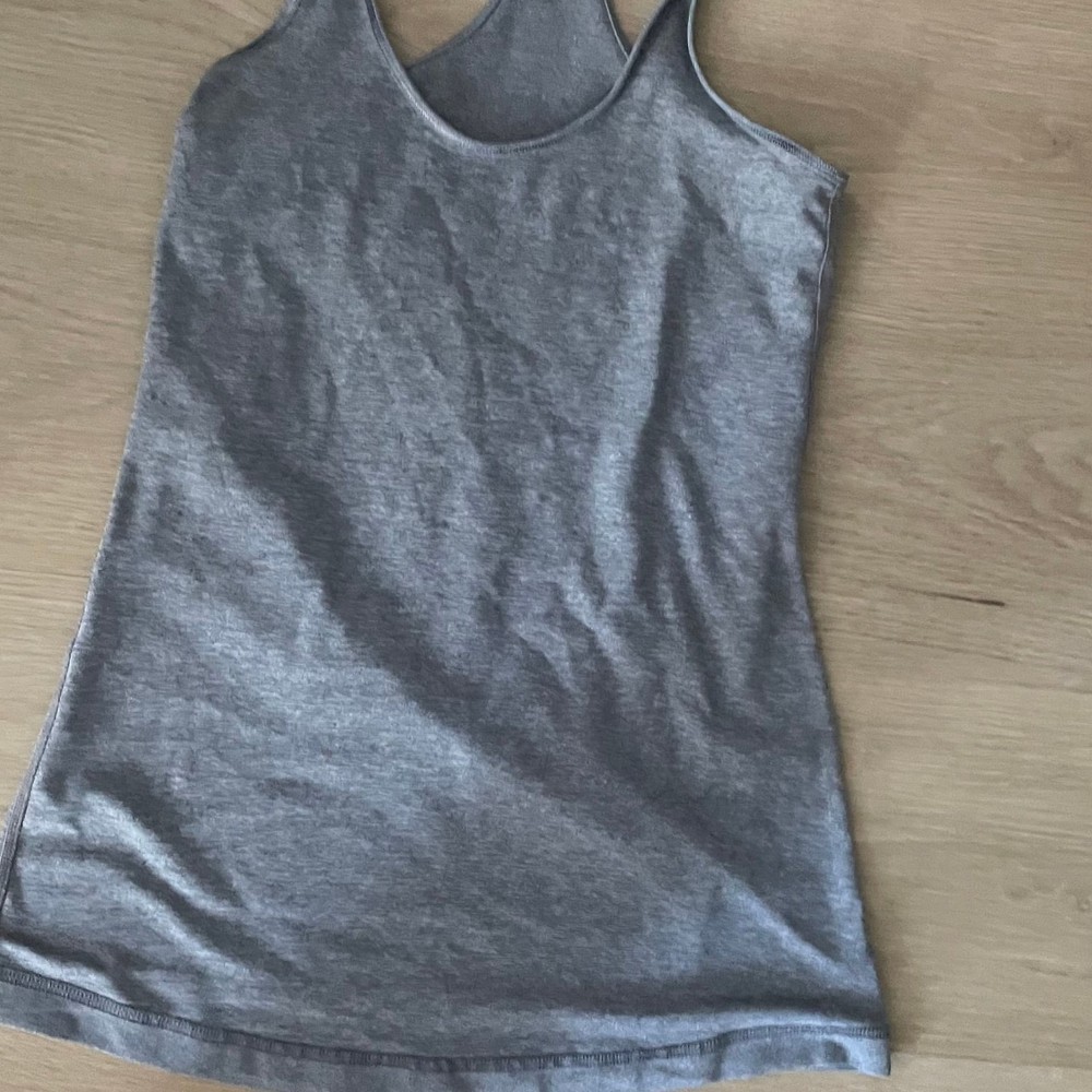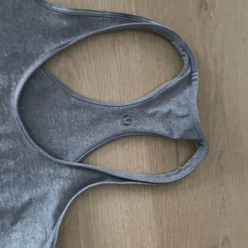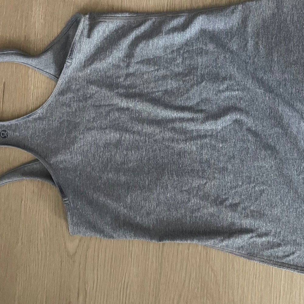 The Grey Lululemon tank top is a versatile activewear piece perfect for yoga or other athletic activities. Made from a breathable four-way stretch fabric, this tank features a scoop neck, racerback strap, and a pullover closure for ease of wear. The solid gray color adds a classic touch, while the Cool Racerback design and athletic fit provide both style and comfort. Easy to care for with machine washable instructions, this tank is a great addition to any woman's activewear collection.